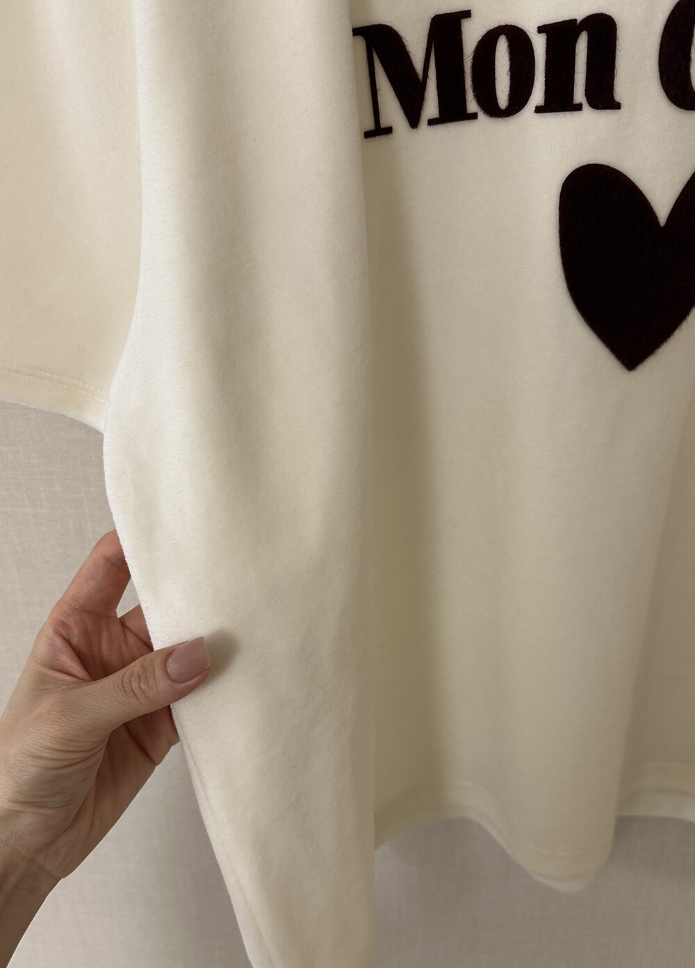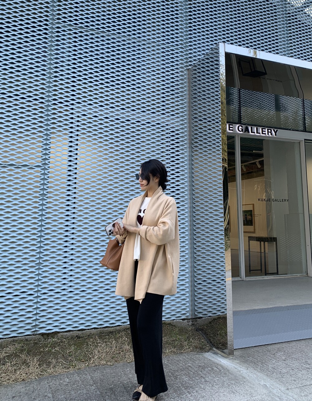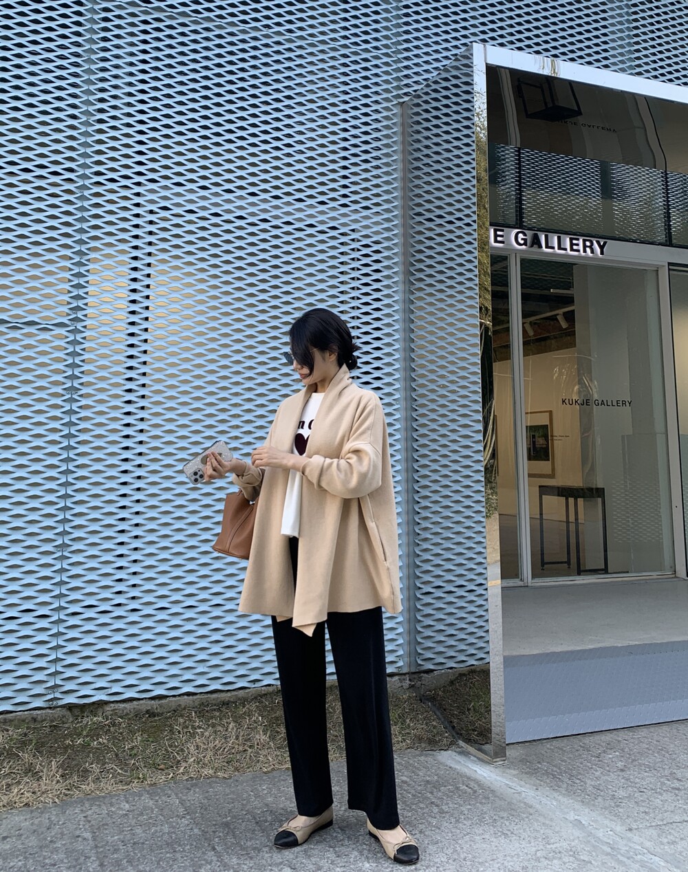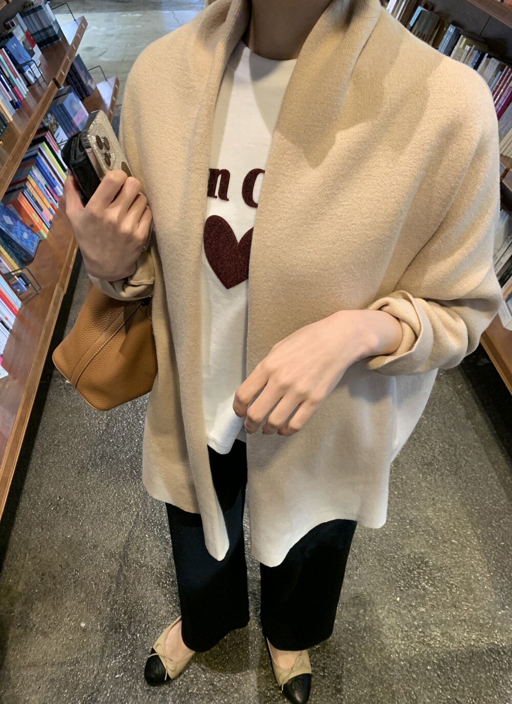 shawl half cardigan (beige) + heart terry t (ivory) + [made] lounge pants (black)