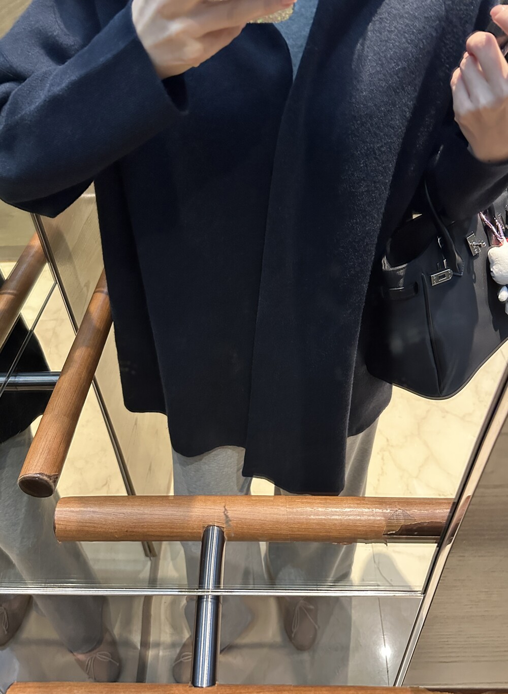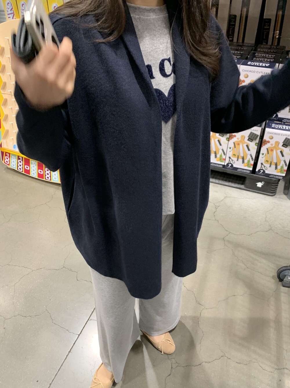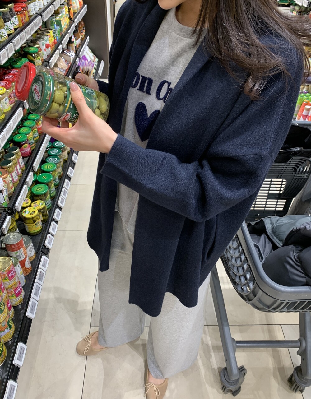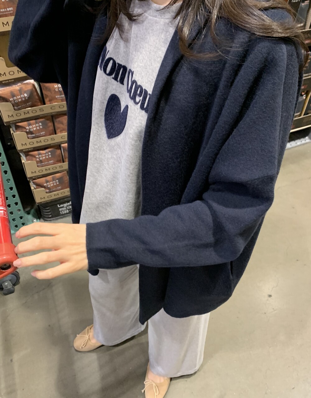 shawl half cardigan (navy) + heart terry t (grey) + [made] lounge pants (melange) + suede flat shoes (beige)