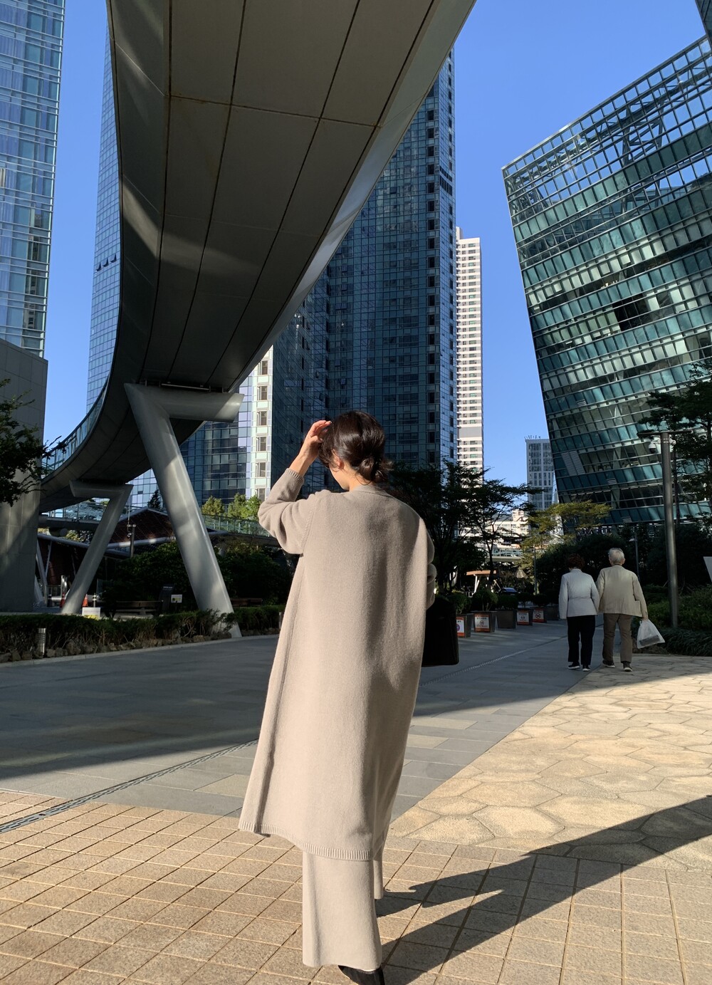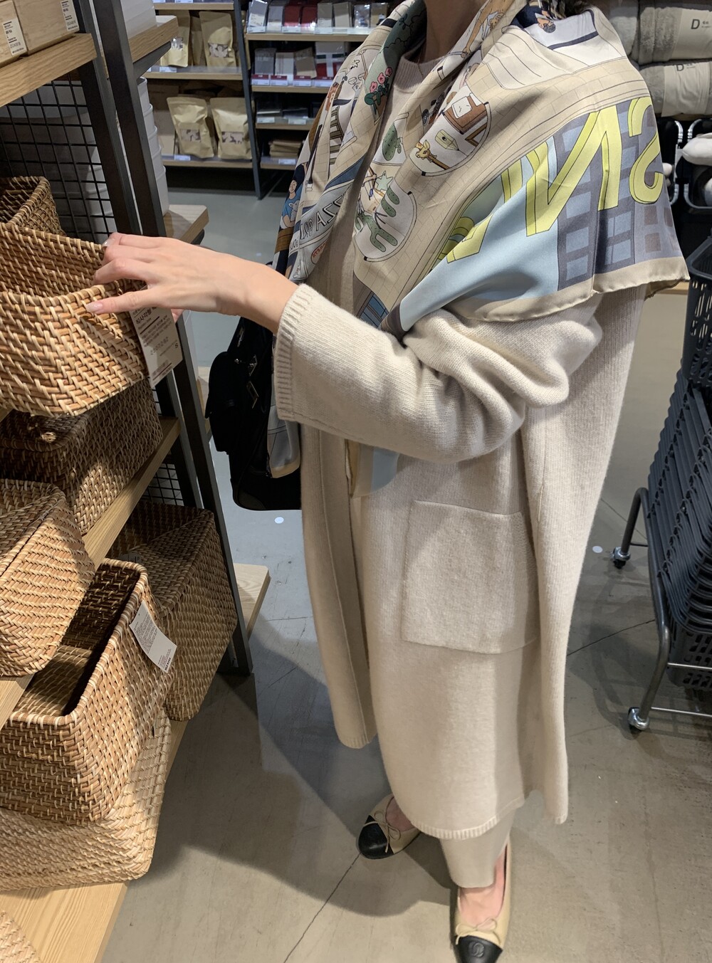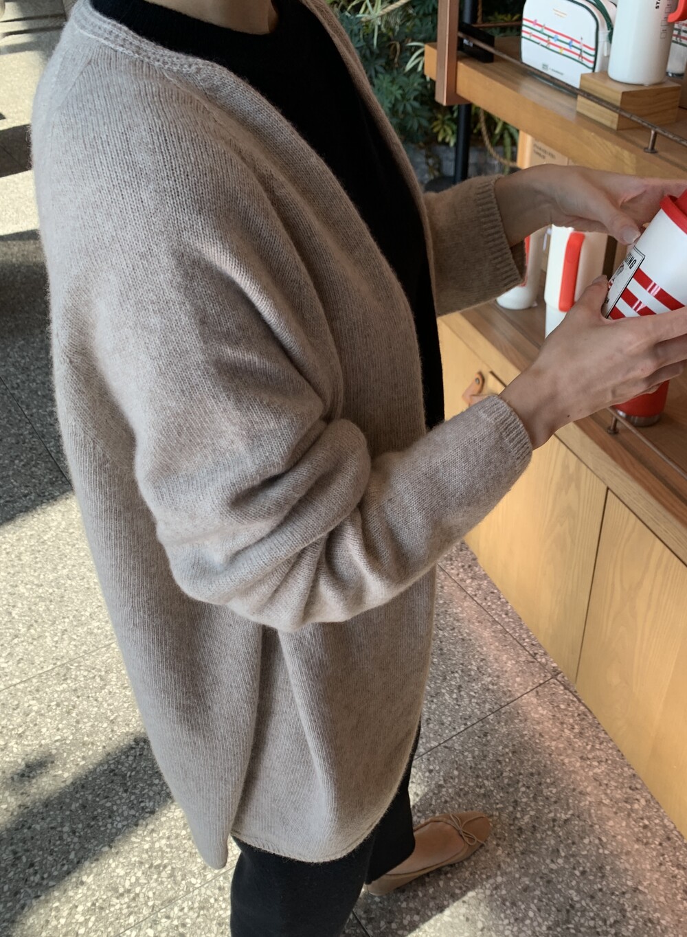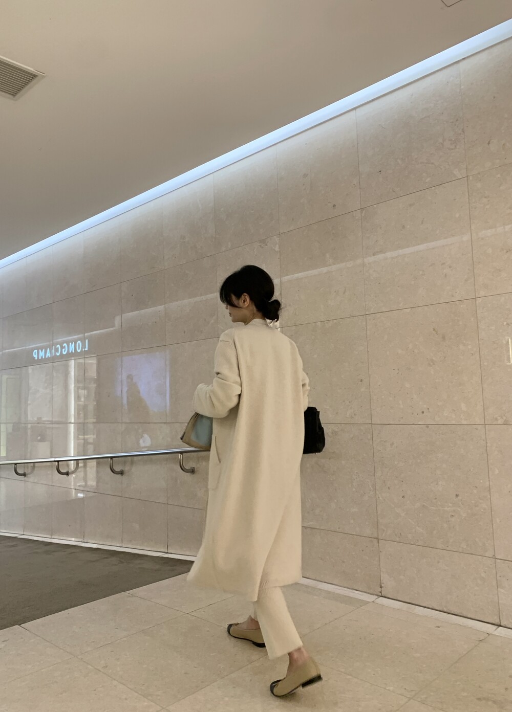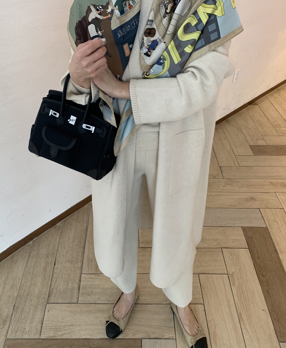 max long-midi cardigan (greige) + max inner knit (oatmeal) + max wide knitpants (oatmeal) + suede flat shoes (beige)