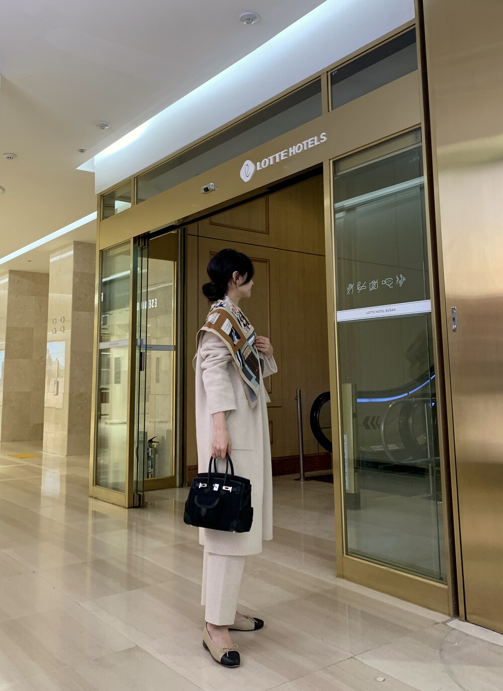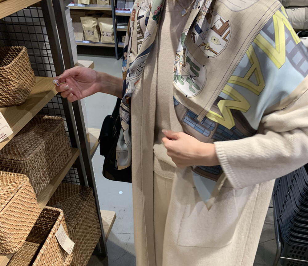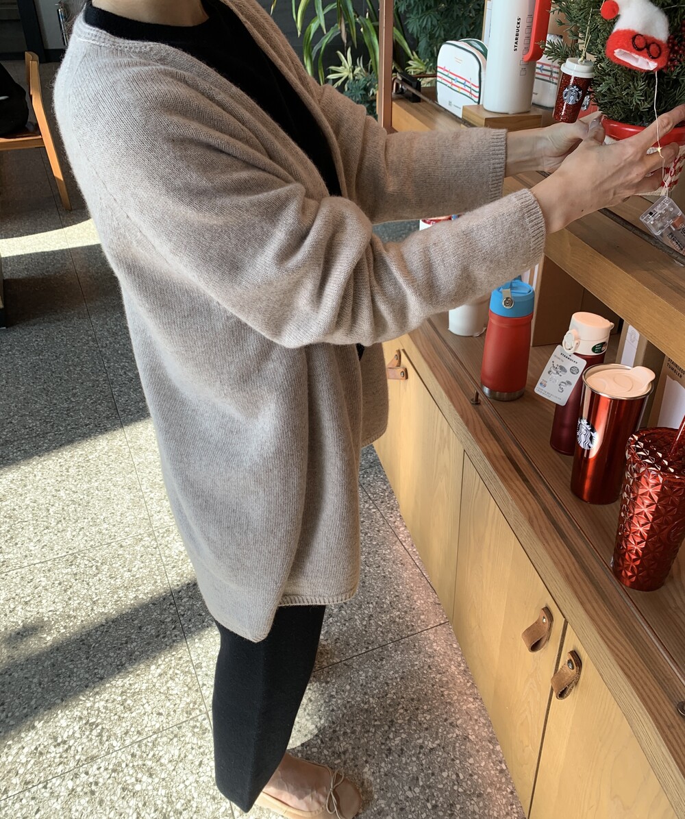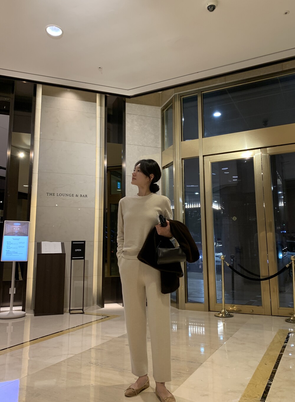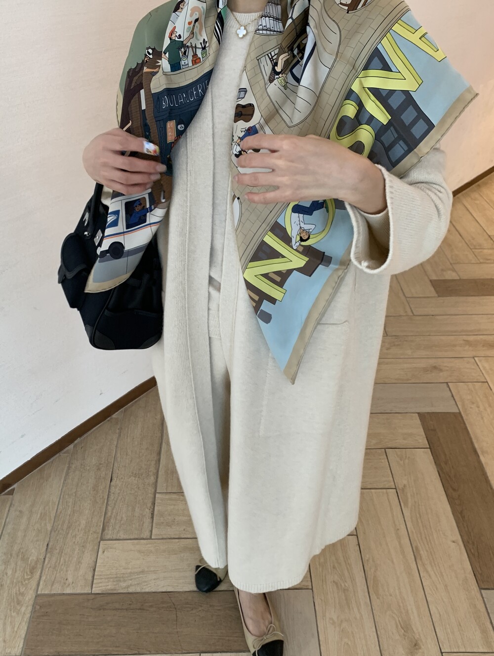 max long-midi cardigan (greige) + max inner knit (oatmeal) + max wide knitpants (oatmeal) + suede flat shoes (beige)