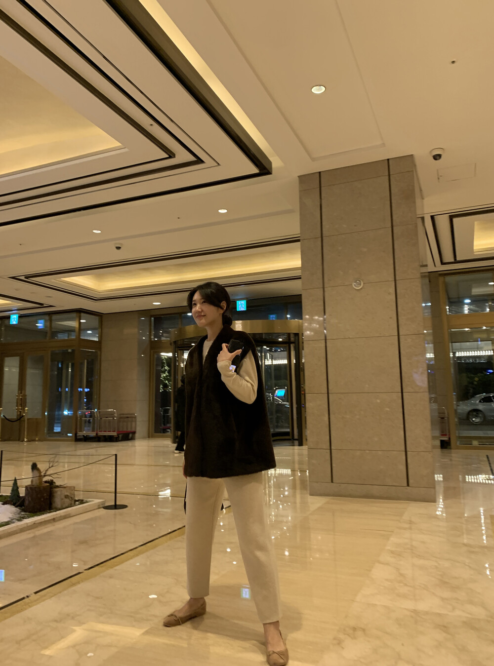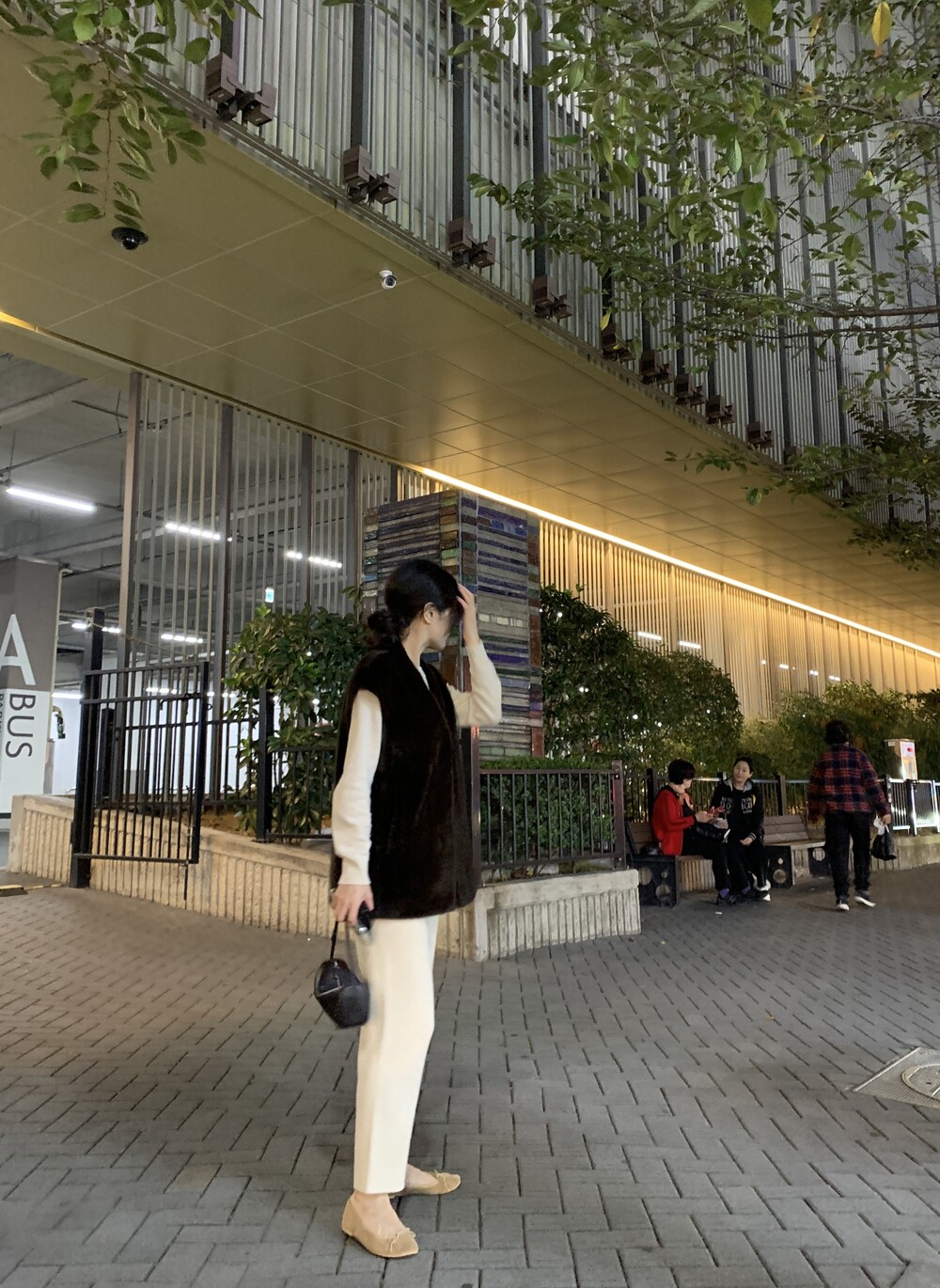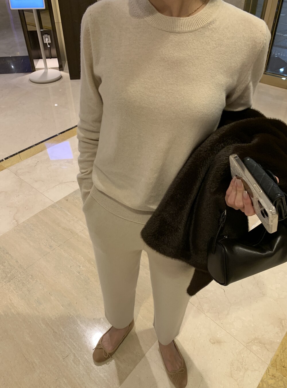 ecofur v vest + max inner knit (oatmeal) + max semi-crop knitpants (oatmeal) + suede flat shoes (beige)