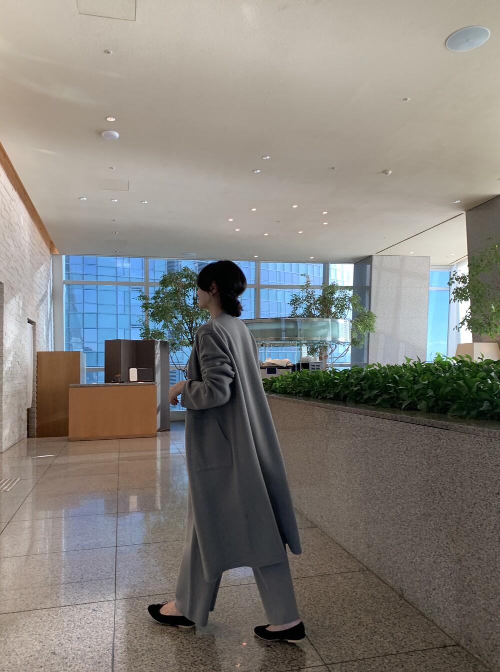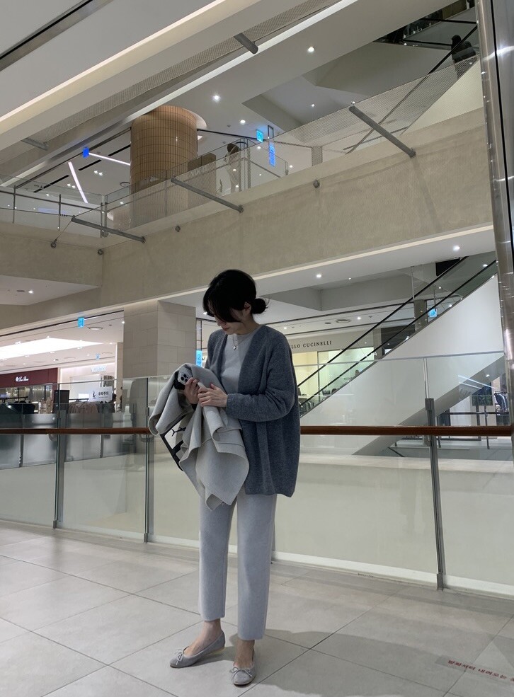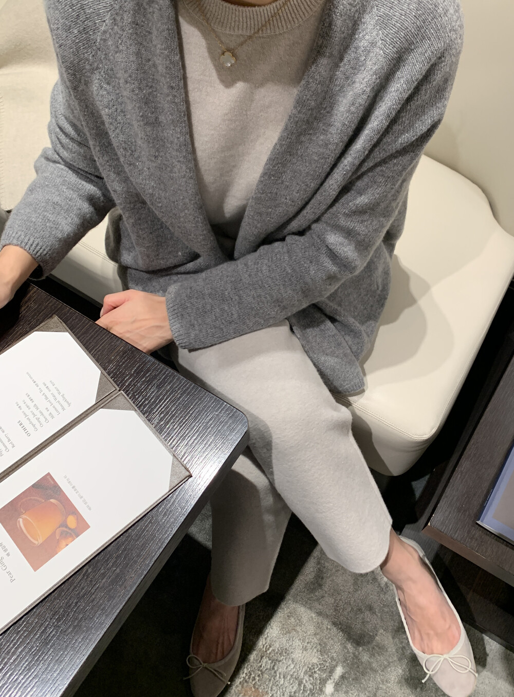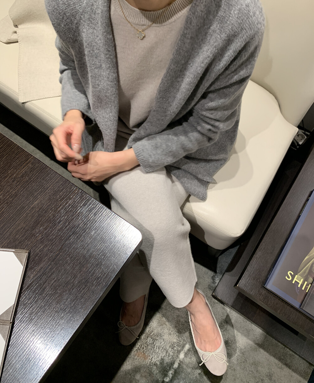 wholegarment mild cardigan (grey) + max inner knit (lightgrey) + max semi-crop knitpants (lightgrey) + suede flat shoes (grey)