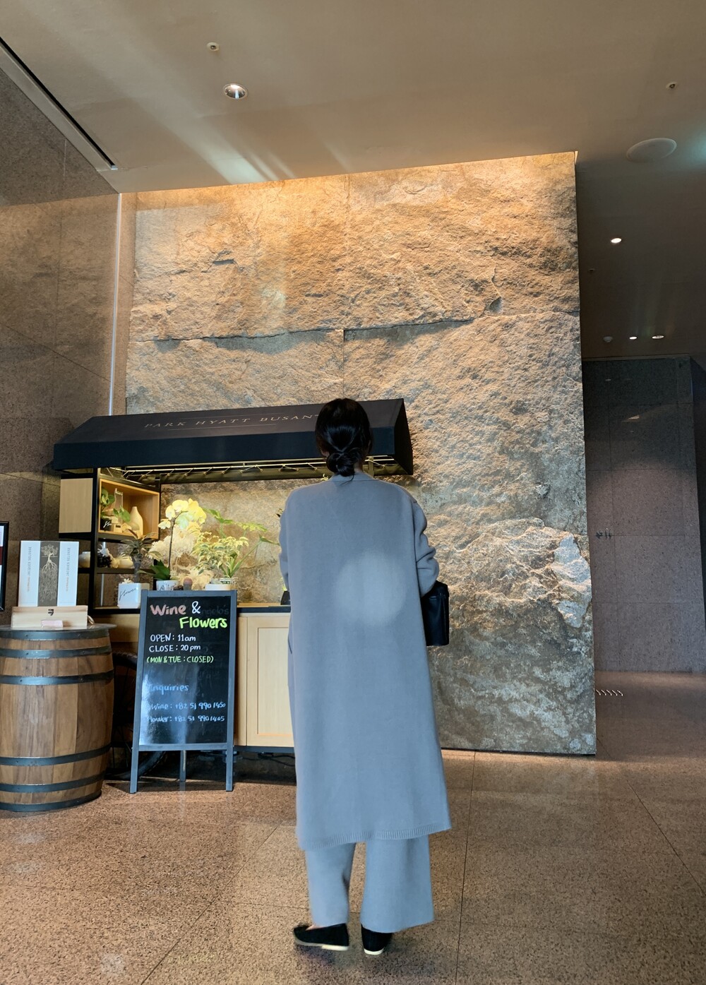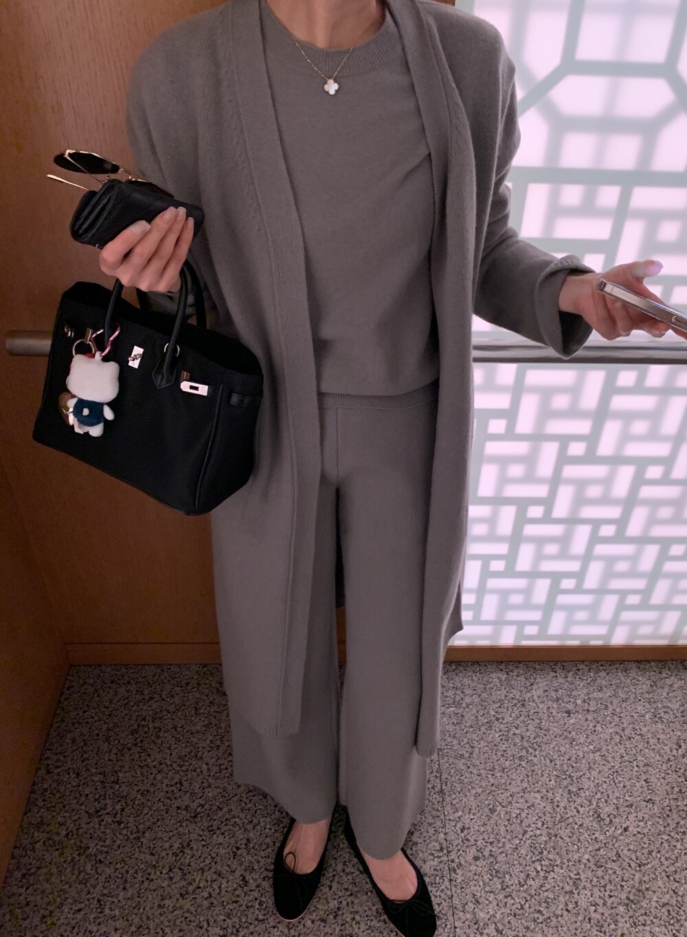 max long-midi cardigan (deepgrey) + max inner knit (deepgrey) + max wide knitpants (deepgrey) + suede flat shoes (black)