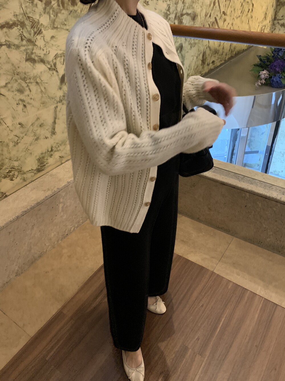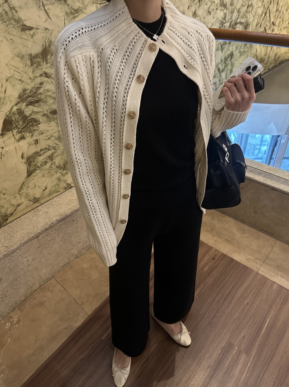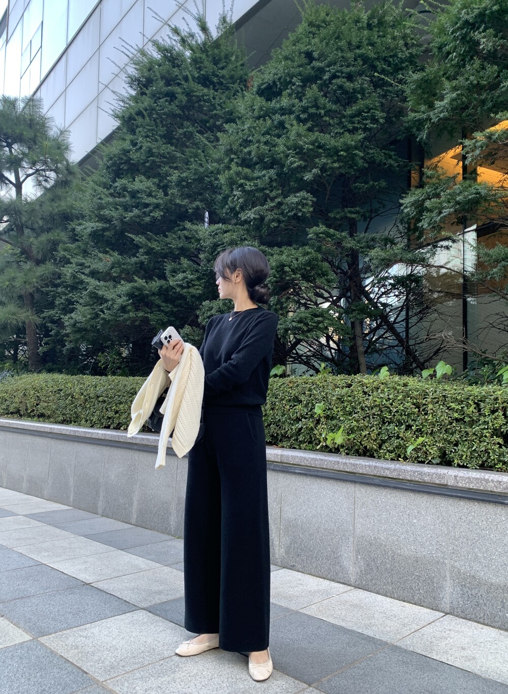 leaf cardigan top (ivory) + max inner knit (black) + max wide knitpants (black) + fall flat shoes (ivory)