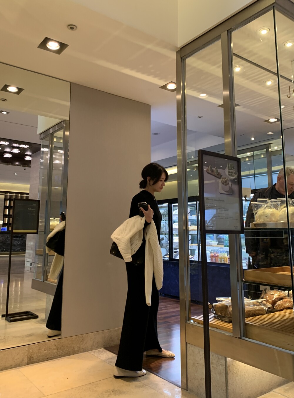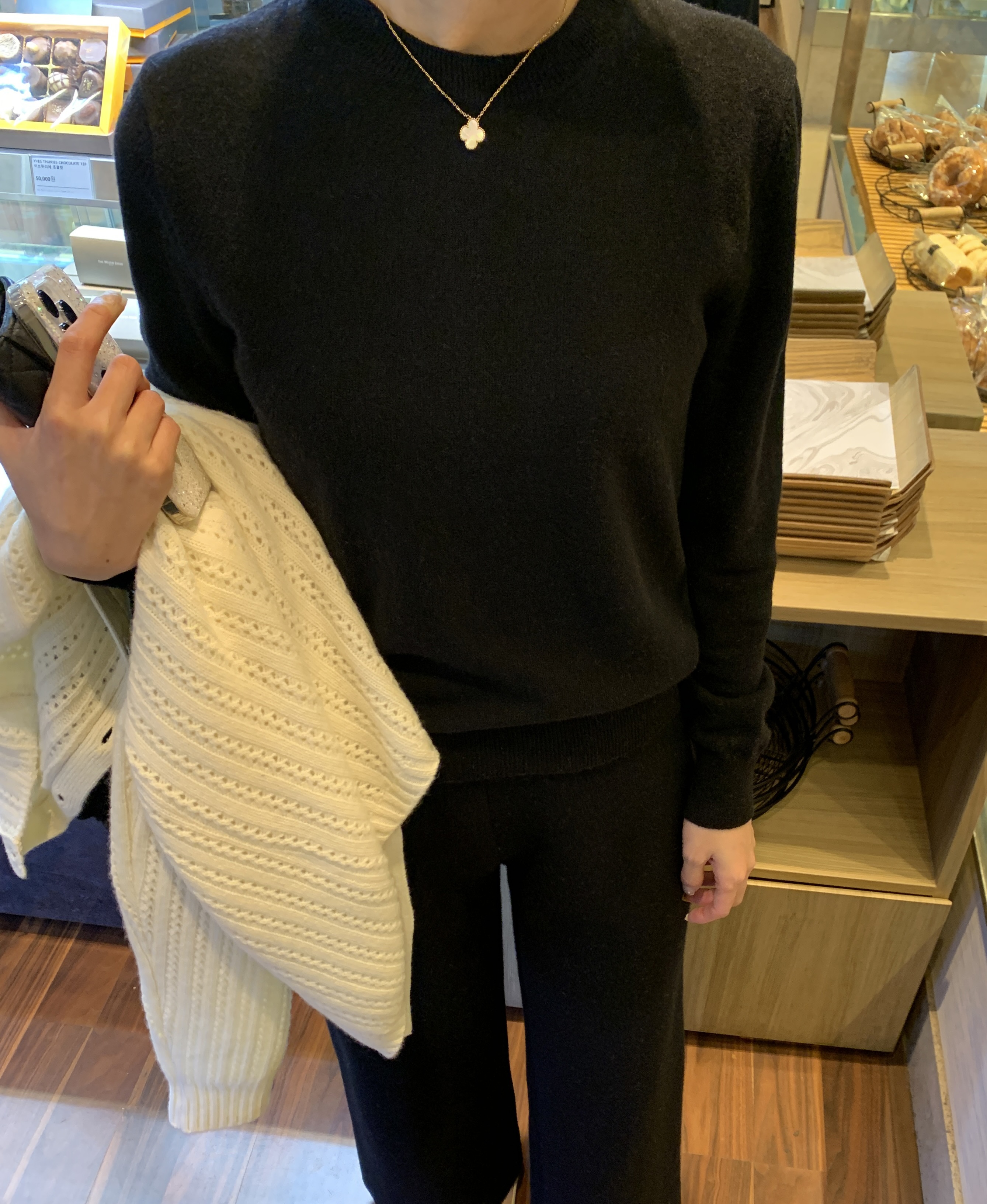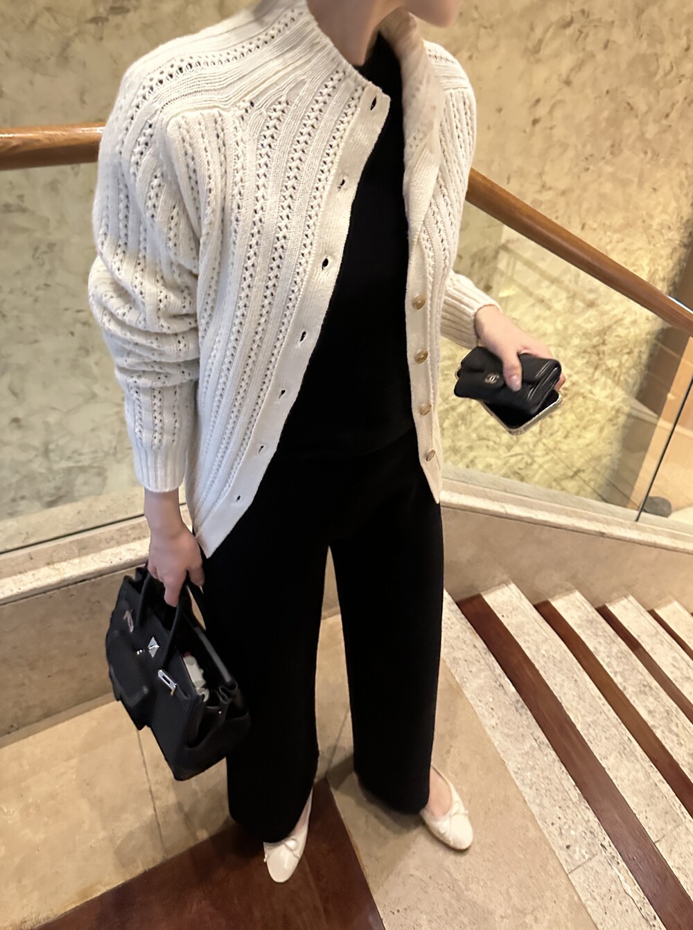 leaf cardigan top (ivory) + max inner knit (black) + max wide knitpants (black) + fall flat shoes (ivory)
