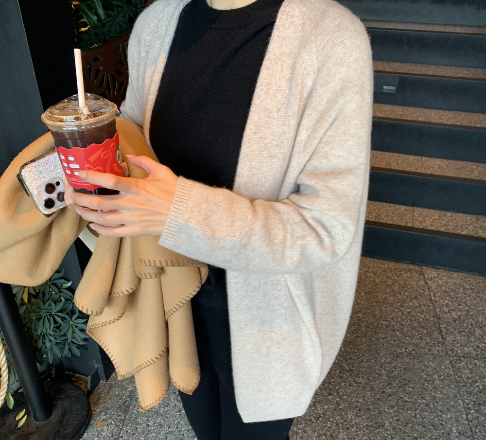 wholegarment mild cardigan (beige) + max inner knit (black) + max semi-crop knitpants (black) + suede flat shoes (beige)
