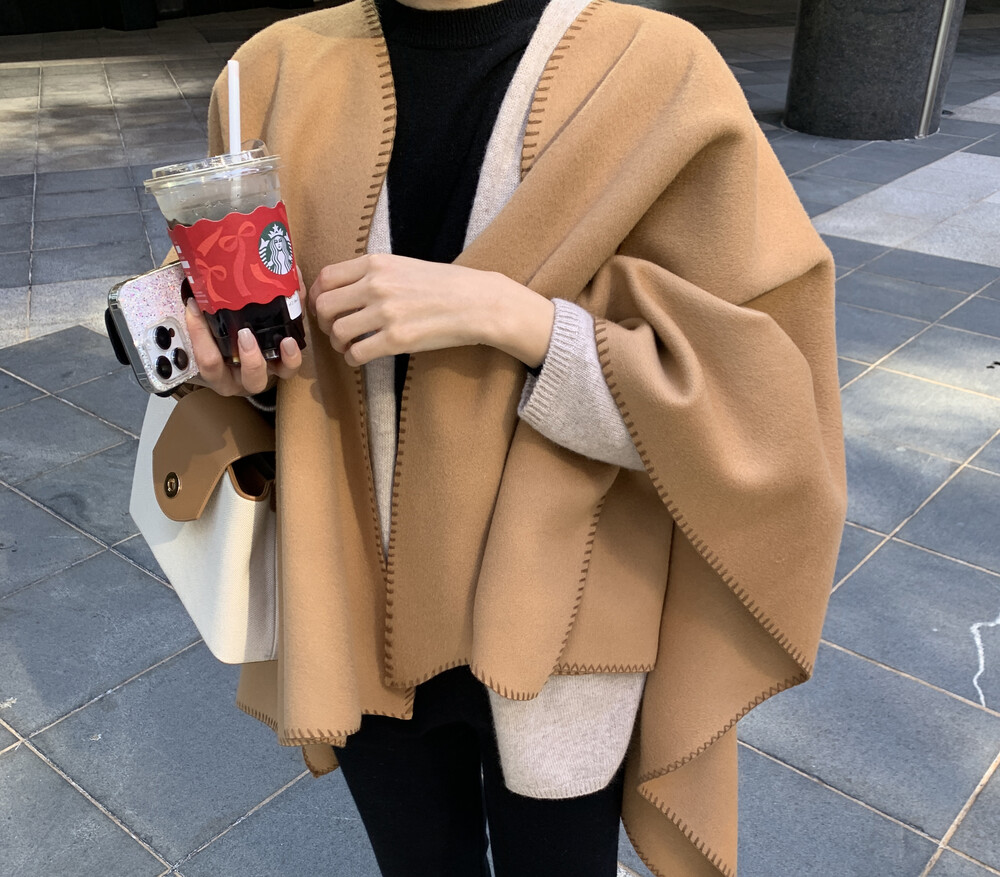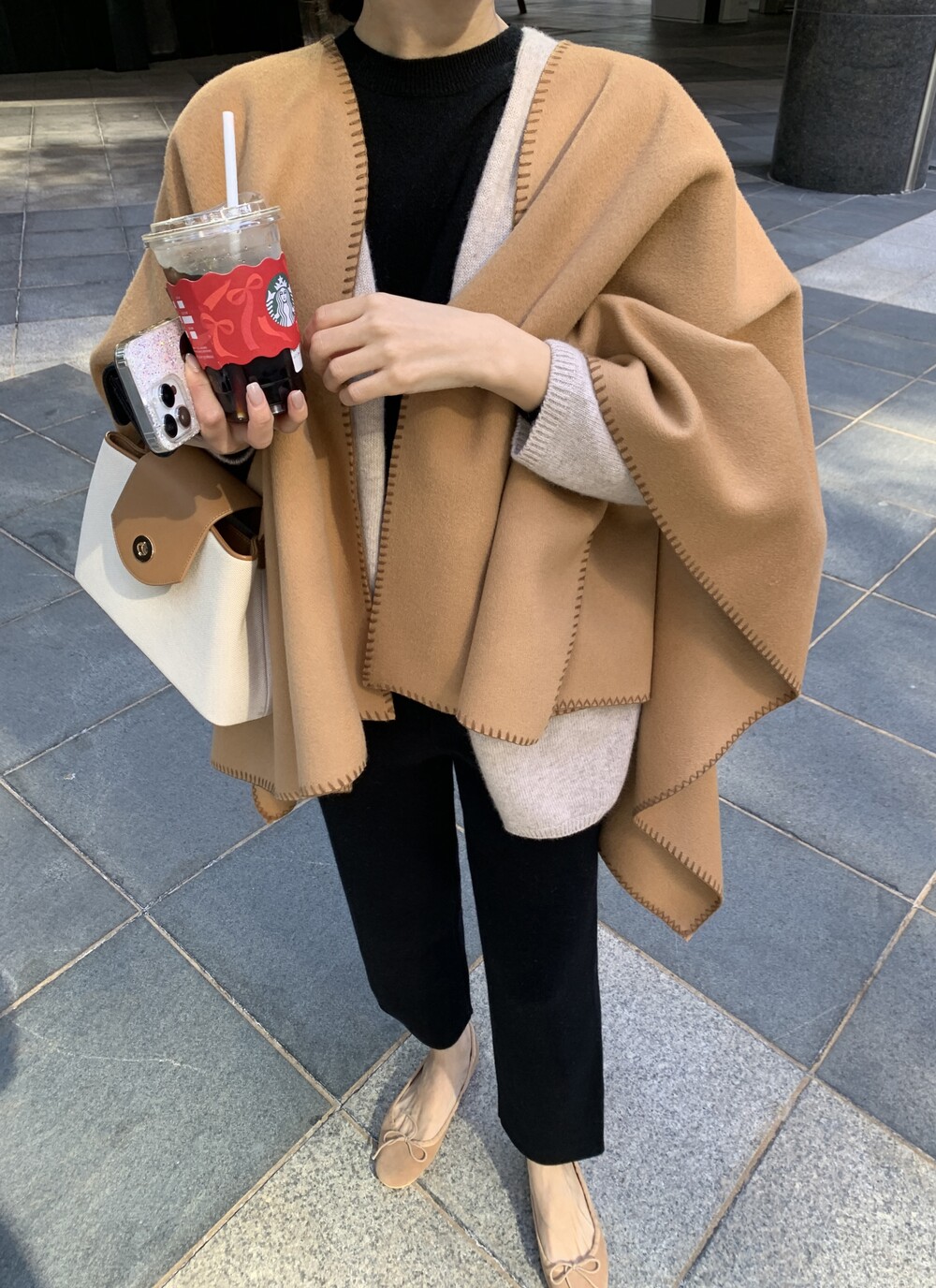 handmade stitch shawl + wholegarment mild cardigan (beige) + max inner knit (black) + max semi-crop knitpants (black) + suede flat shoes (beige)