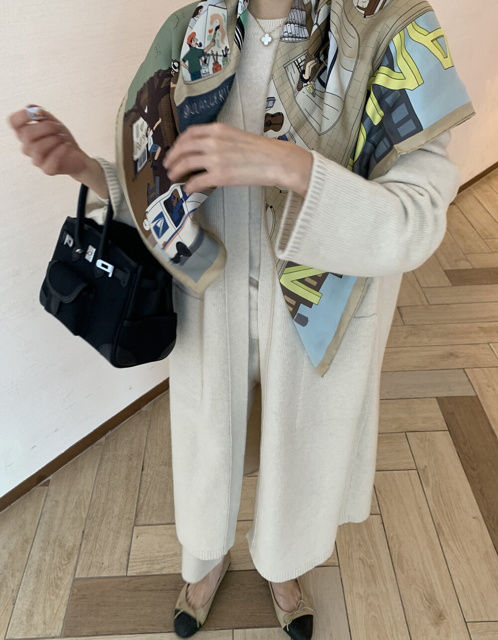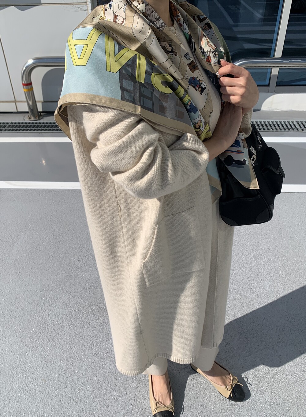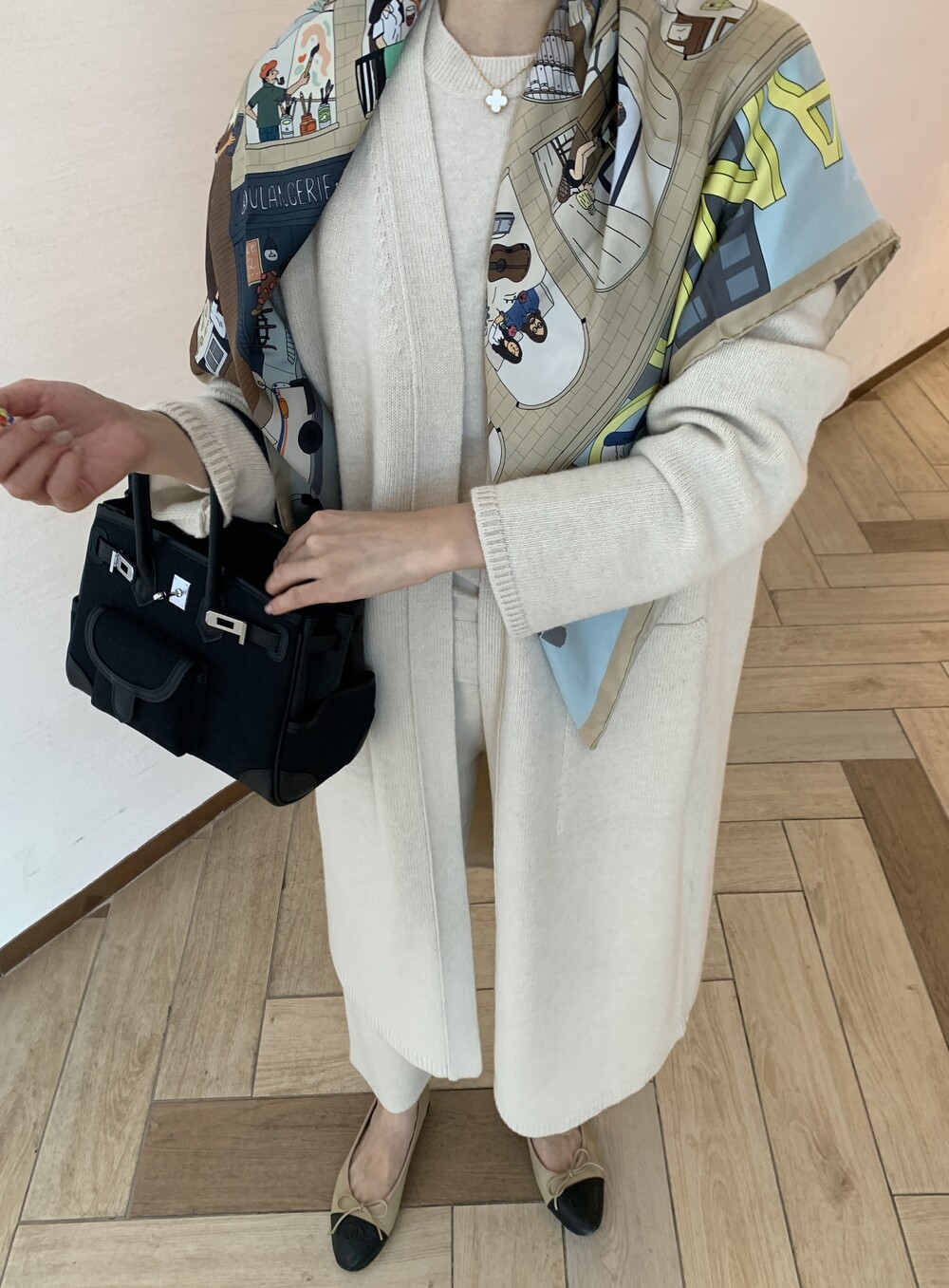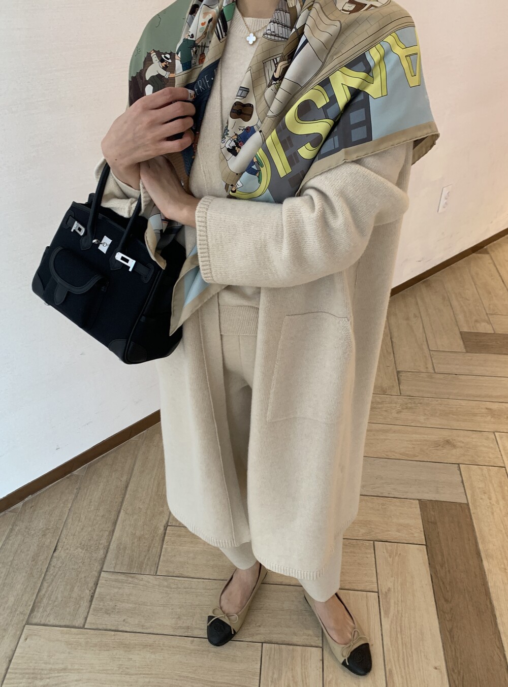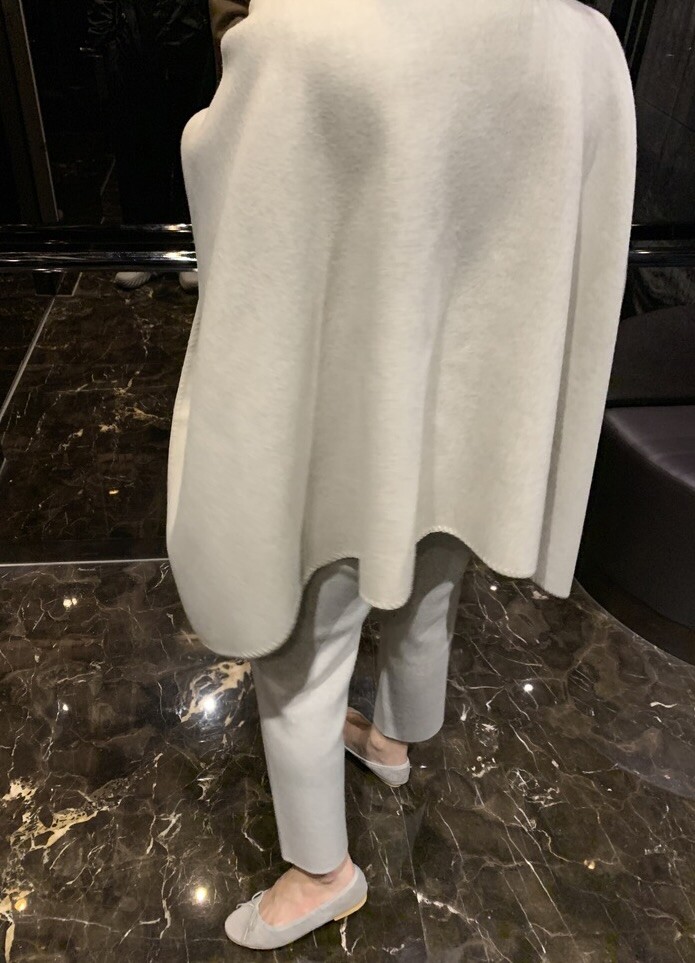 handmade stitch shawl + wholegarment mild cardigan (beige) + max inner knit (black) + max semi-crop knitpants (black) + suede flat shoes (beige)