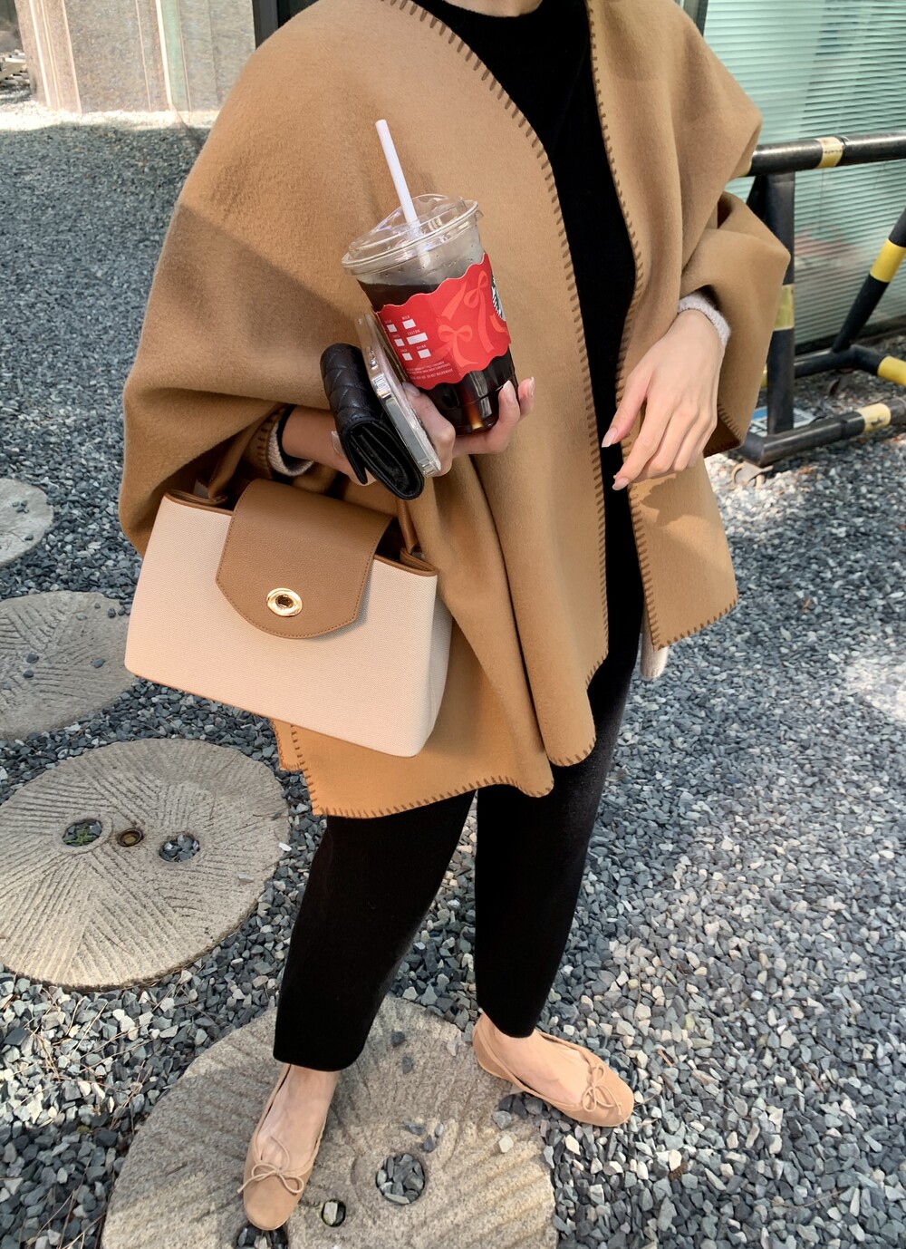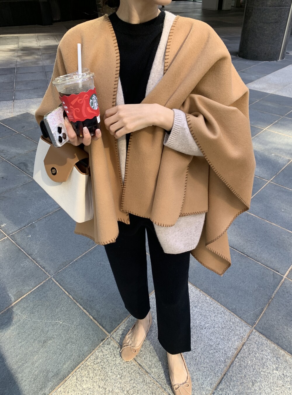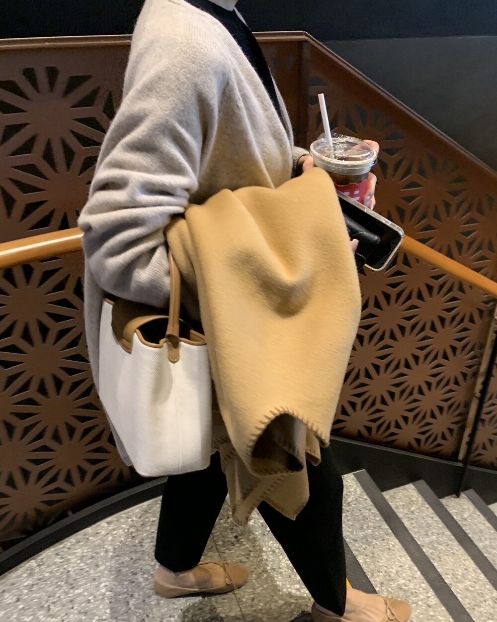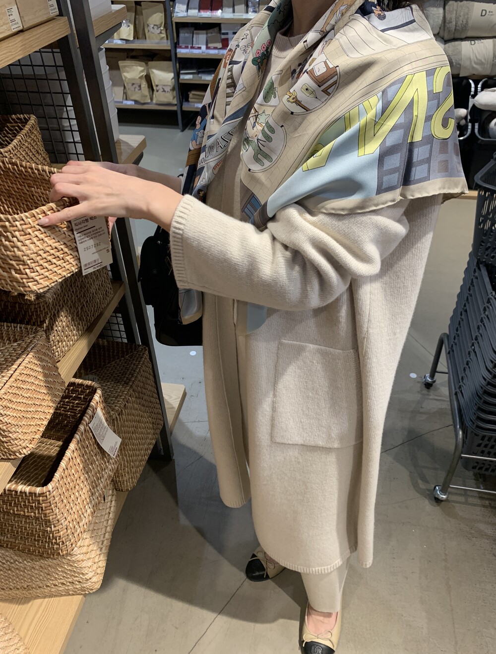 handmade stitch shawl + wholegarment mild cardigan (beige) + max inner knit (black) + max semi-crop knitpants (black) + suede flat shoes (beige)