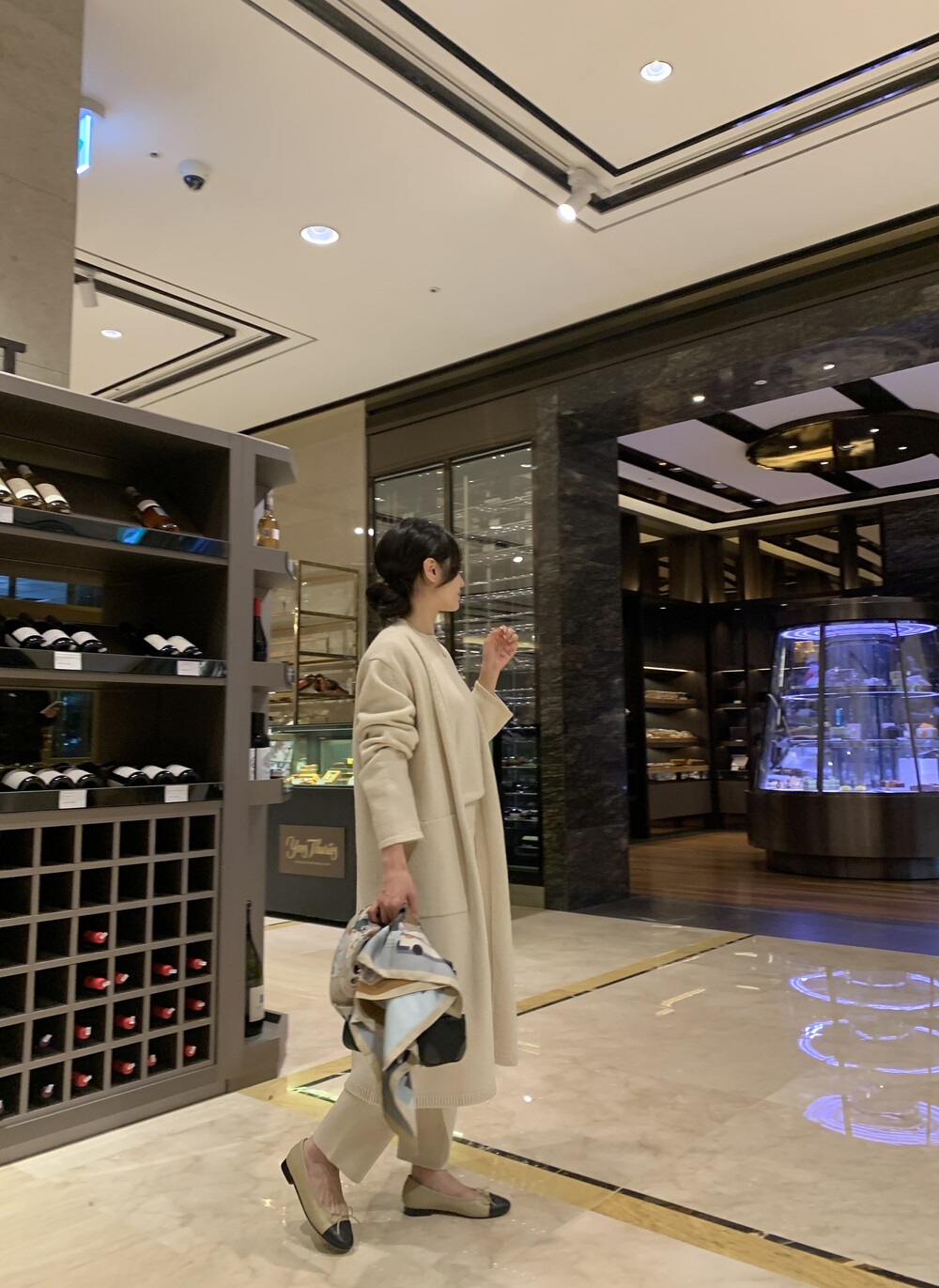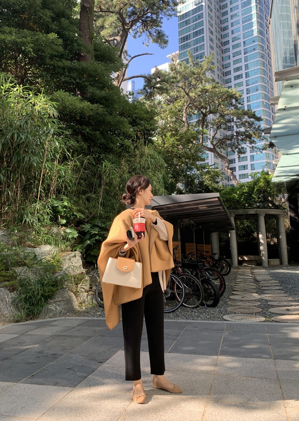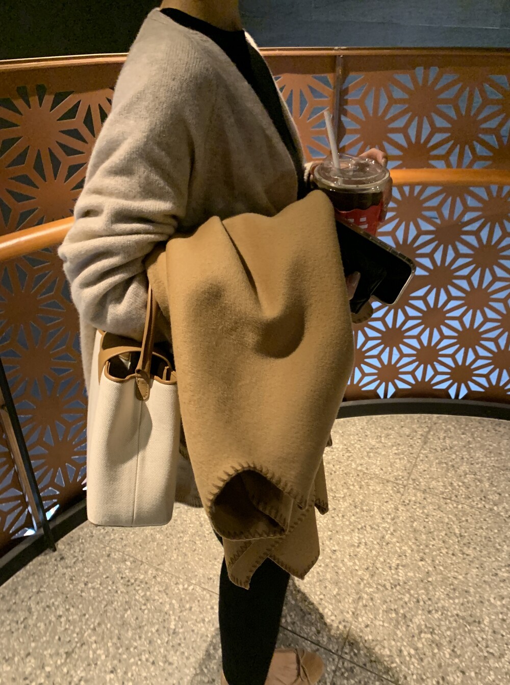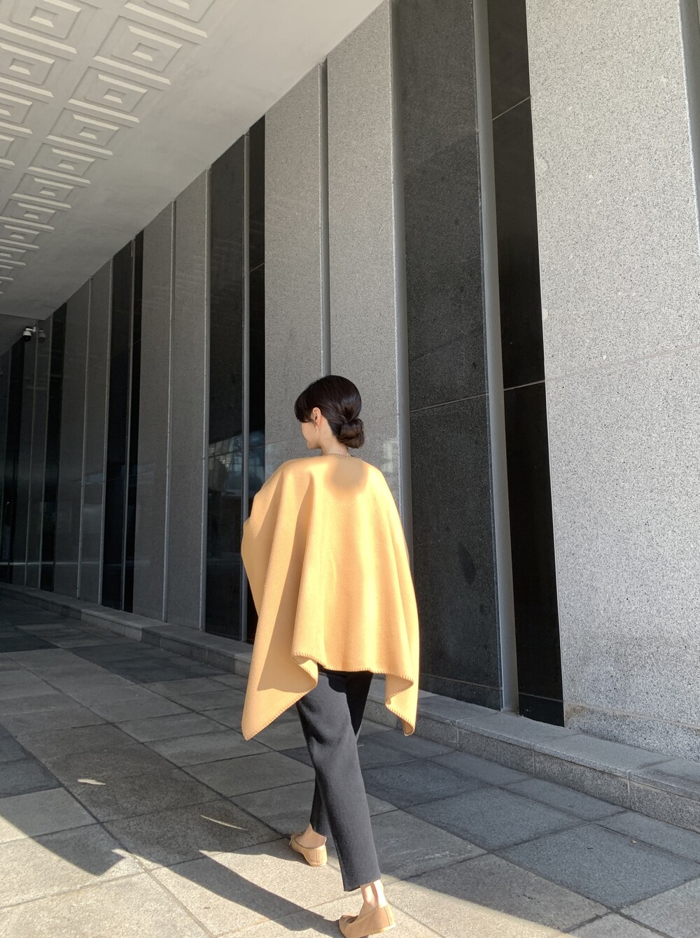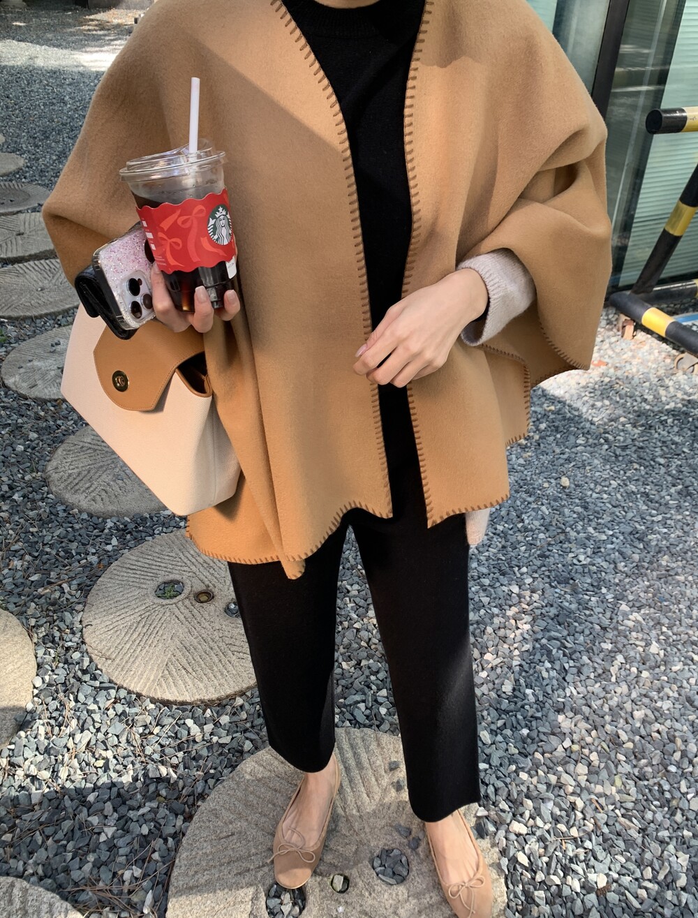 handmade stitch shawl + wholegarment mild cardigan (beige) + max inner knit (black) + max semi-crop knitpants (black) + suede flat shoes (beige)