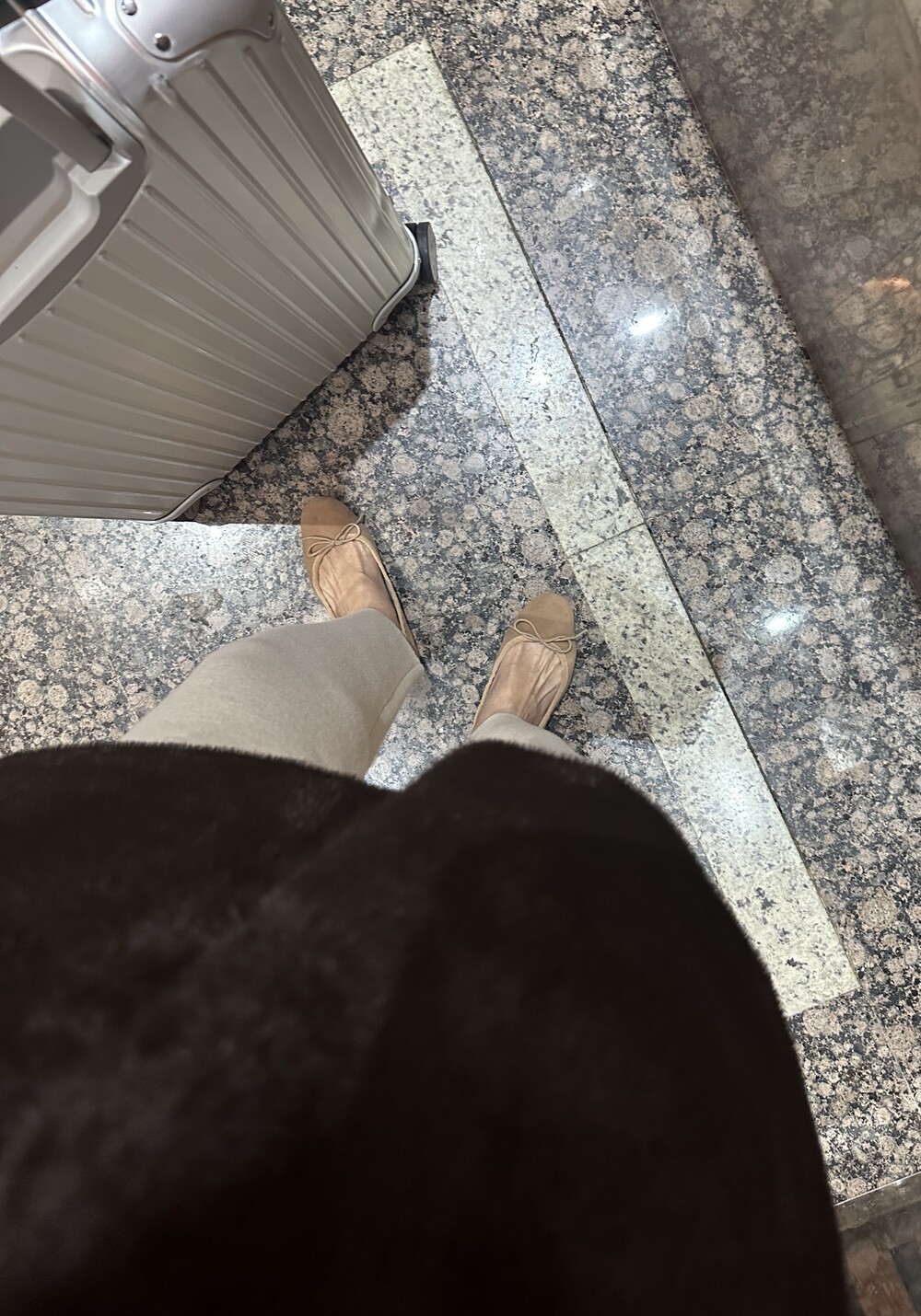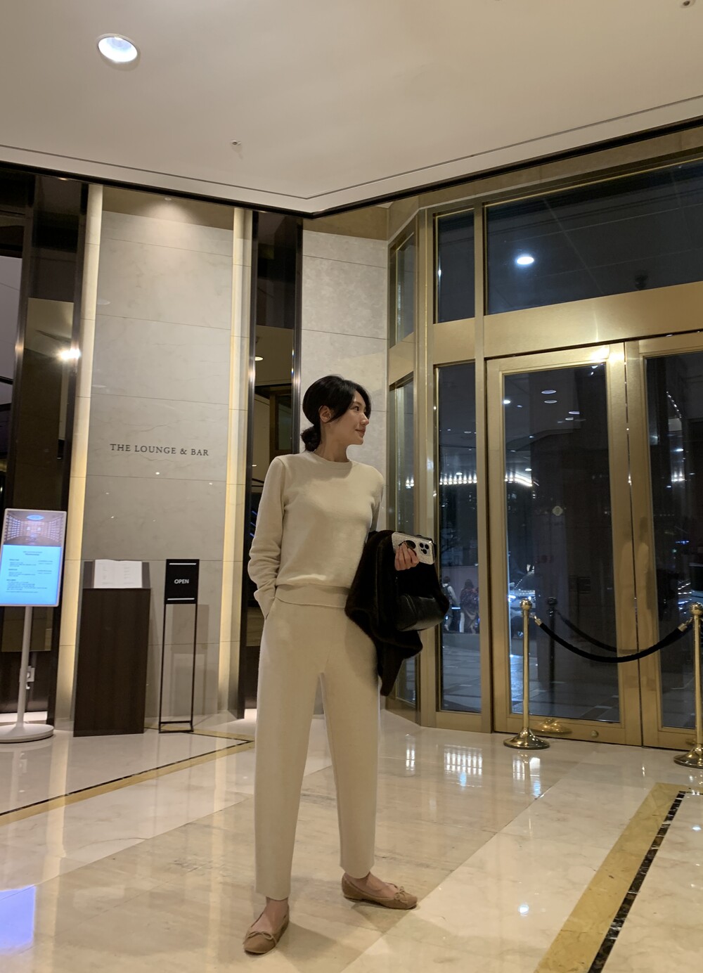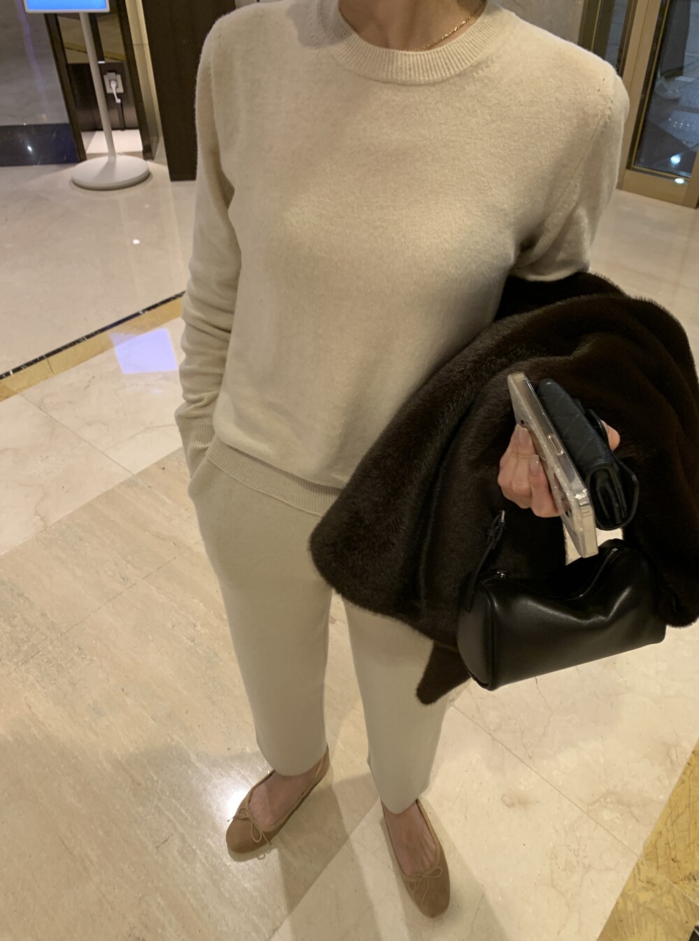 ecofur v vest + max inner knit (oatmeal) + max semi-crop knitpants (oatmeal) + suede flat shoes (beige)