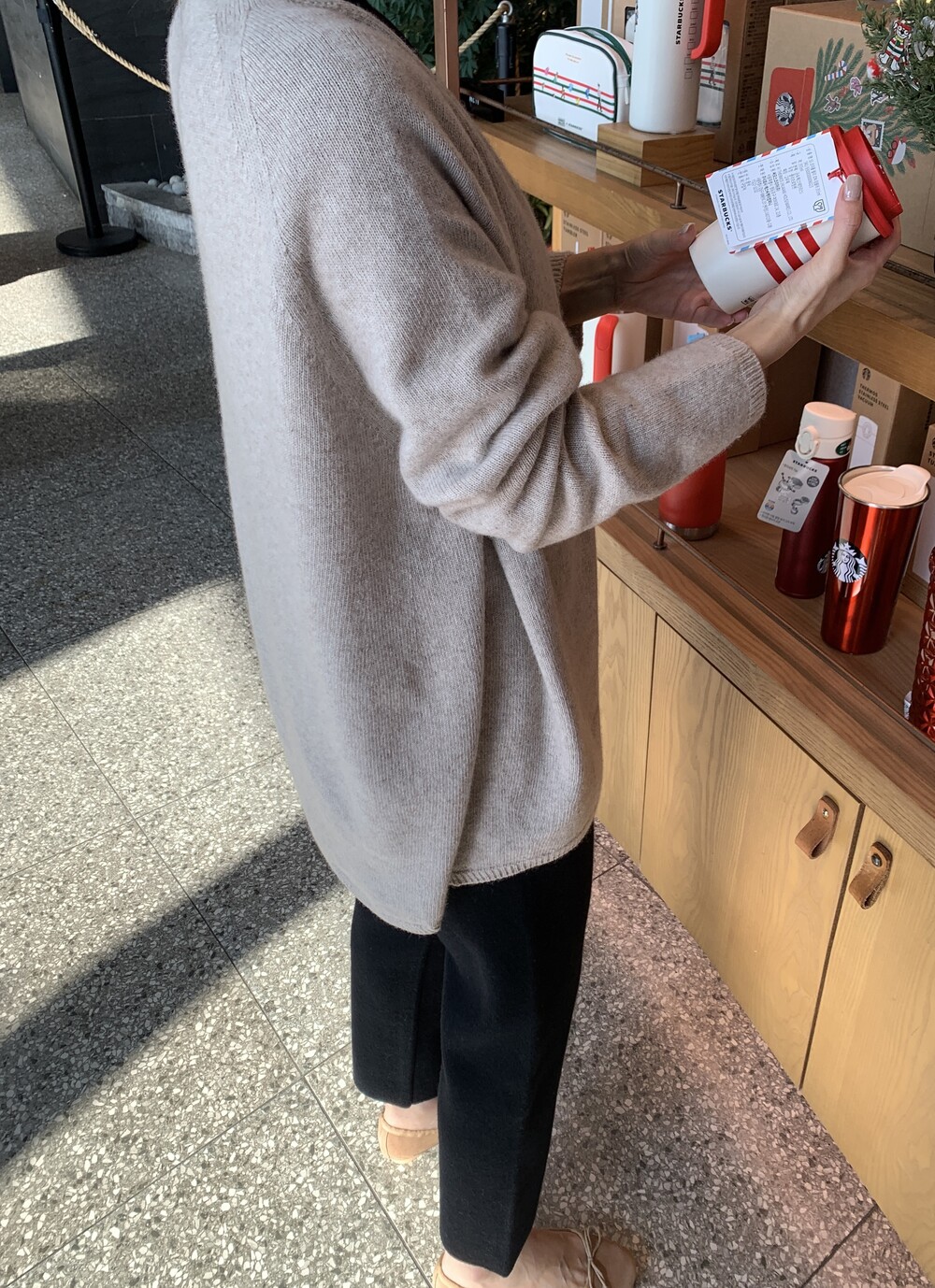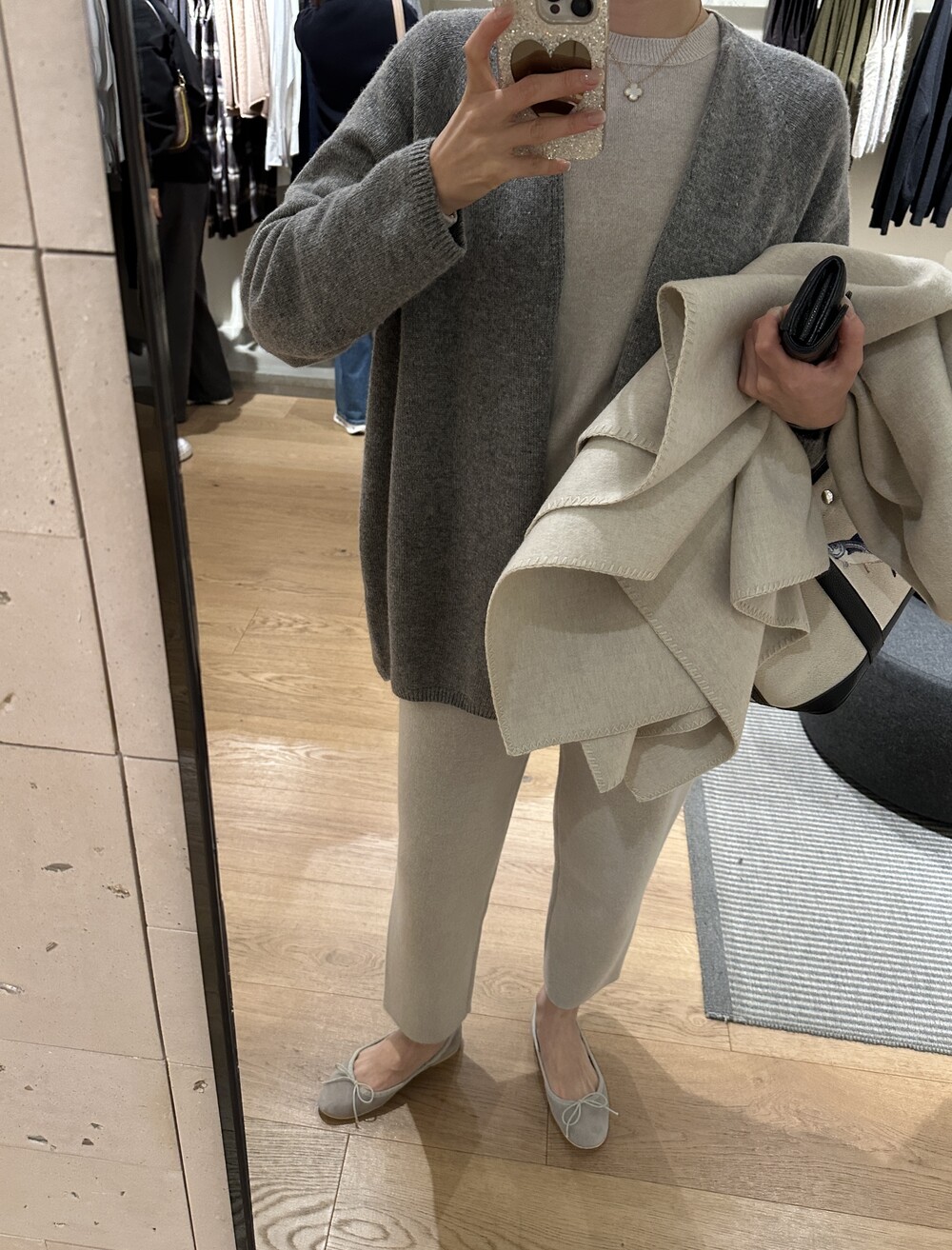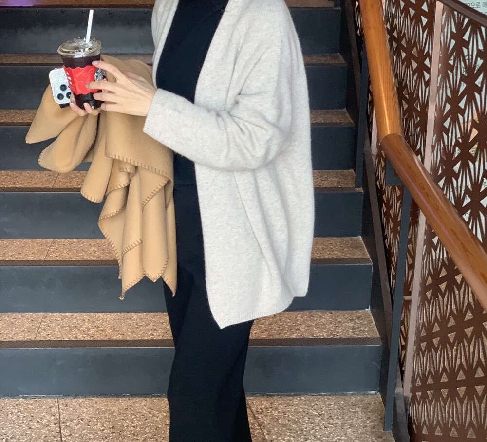 wholegarment mild cardigan (grey) + max inner knit (lightgrey) + max semi-crop knitpants (lightgrey) + suede flat shoes (grey)