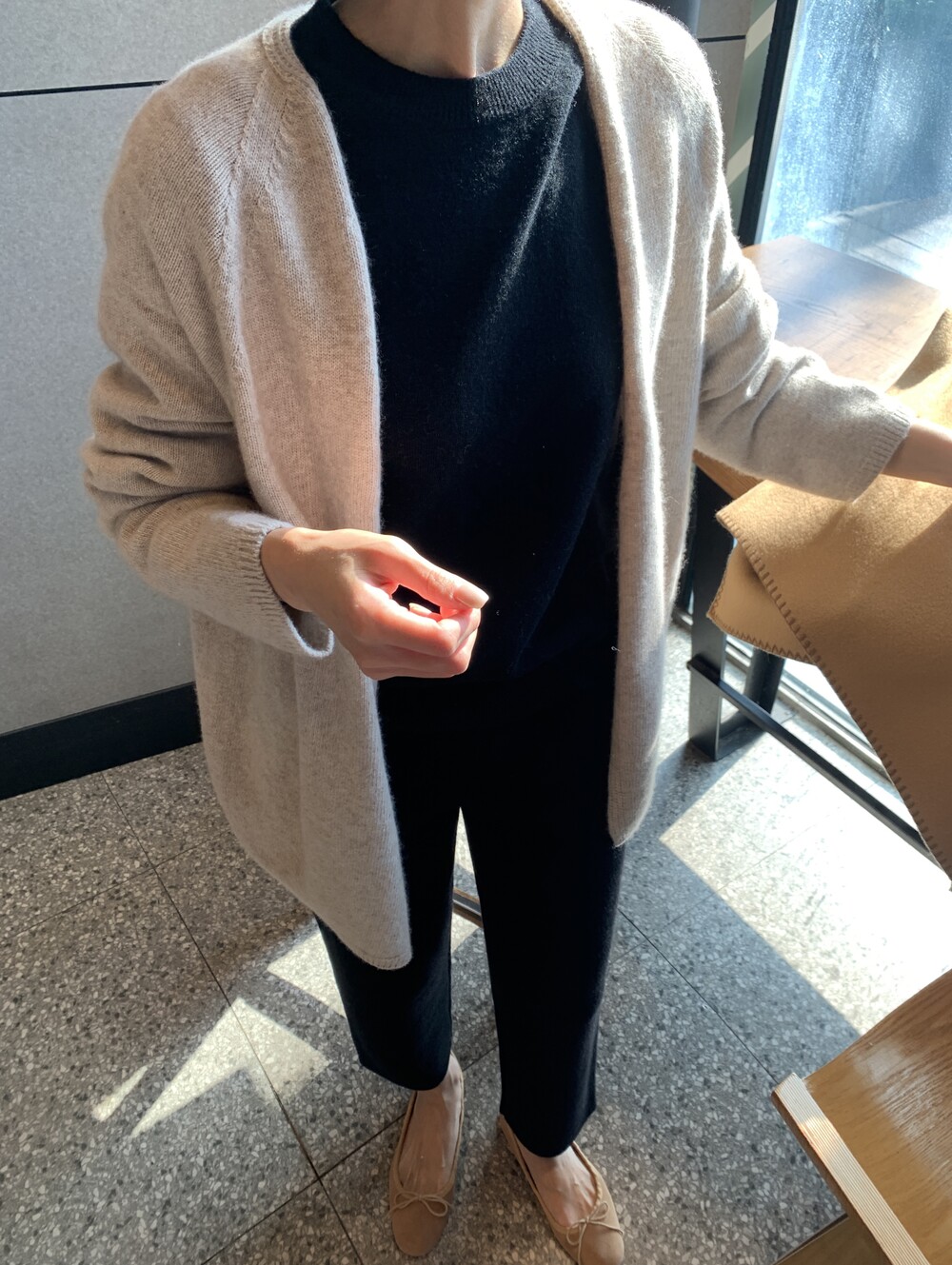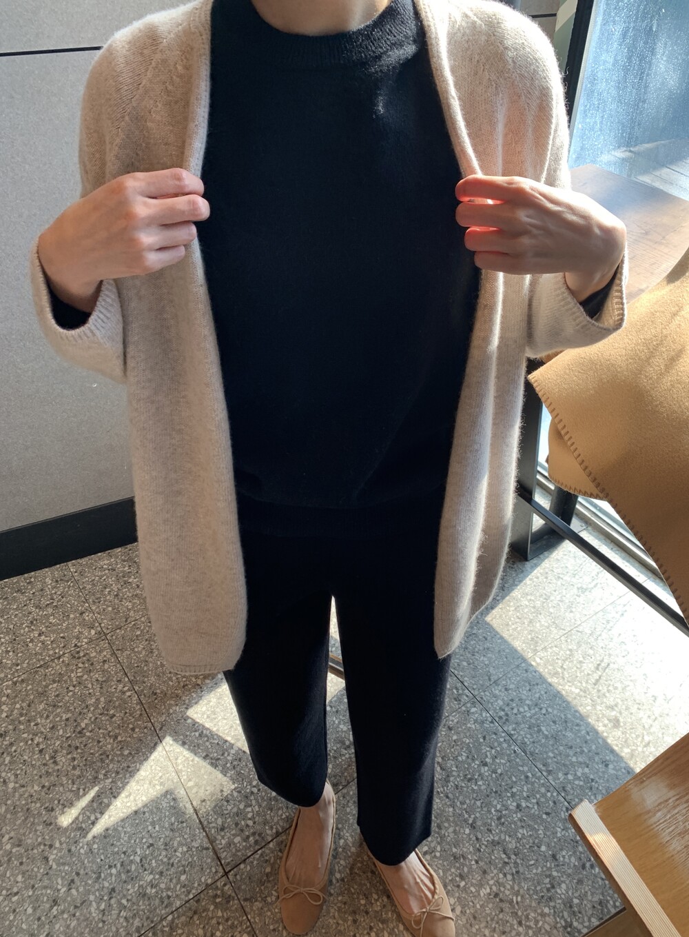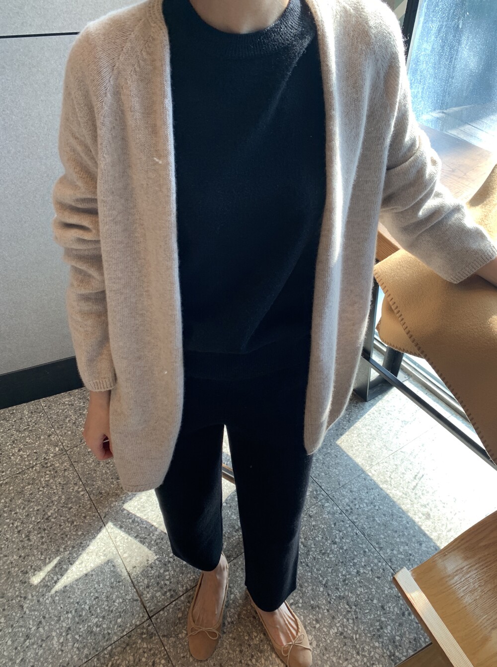 wholegarment mild cardigan (beige) + max inner knit (black) + max semi-crop knitpants (black) + suede flat shoes (beige)