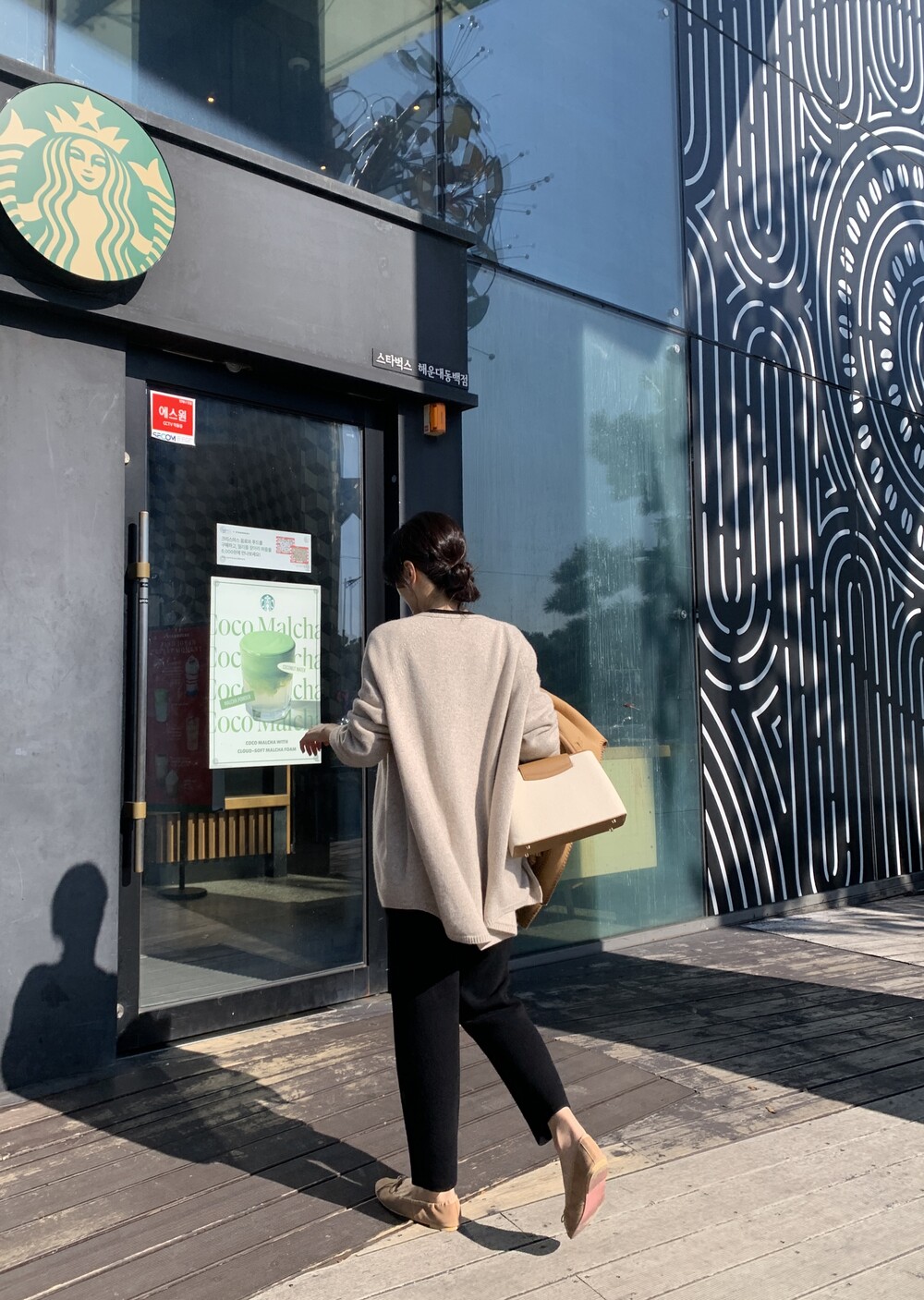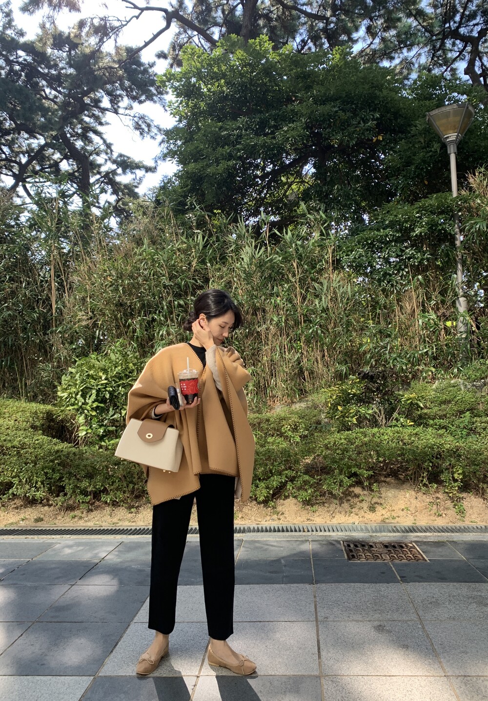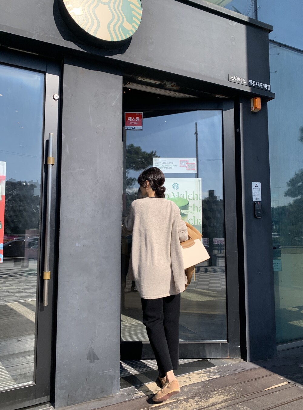 wholegarment mild cardigan (beige) + max inner knit (black) + max semi-crop knitpants (black) + suede flat shoes (beige)