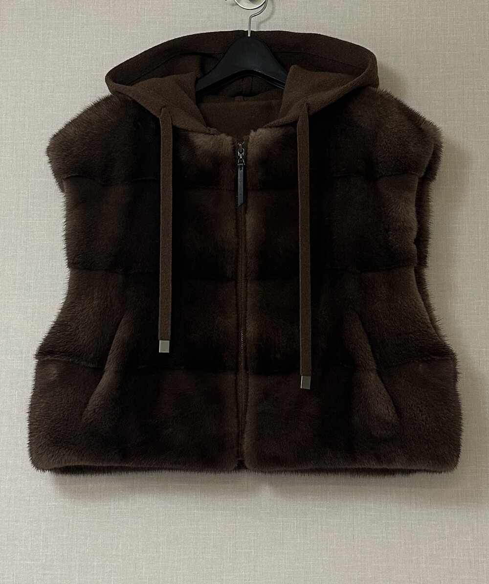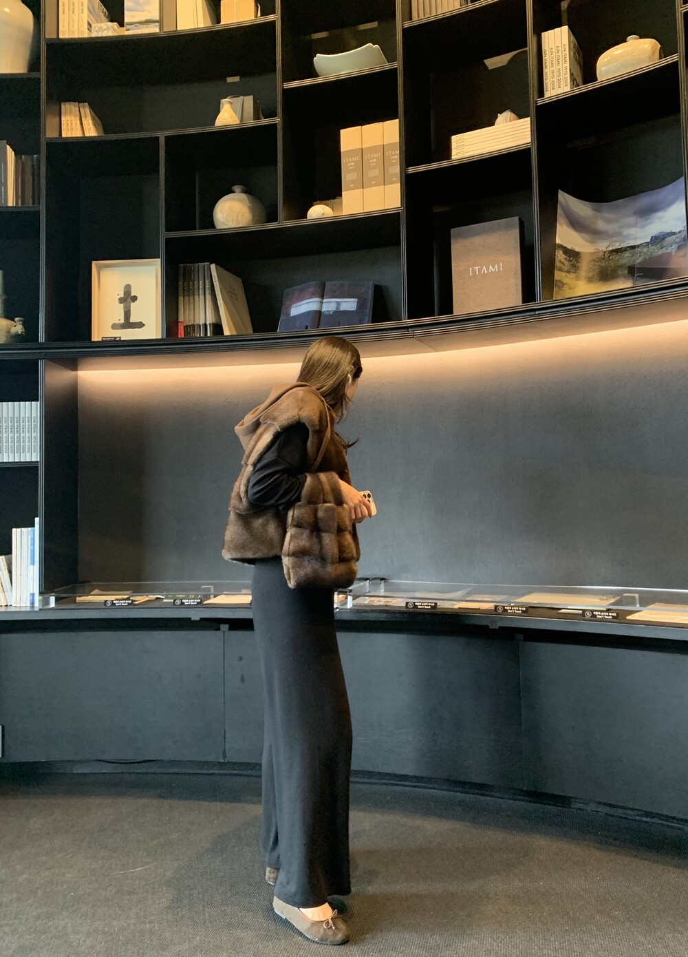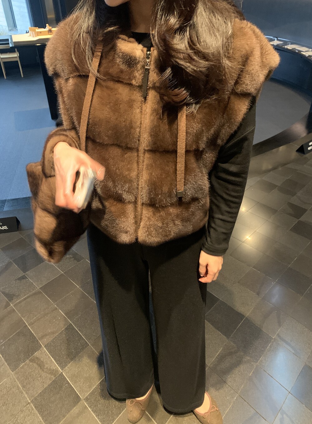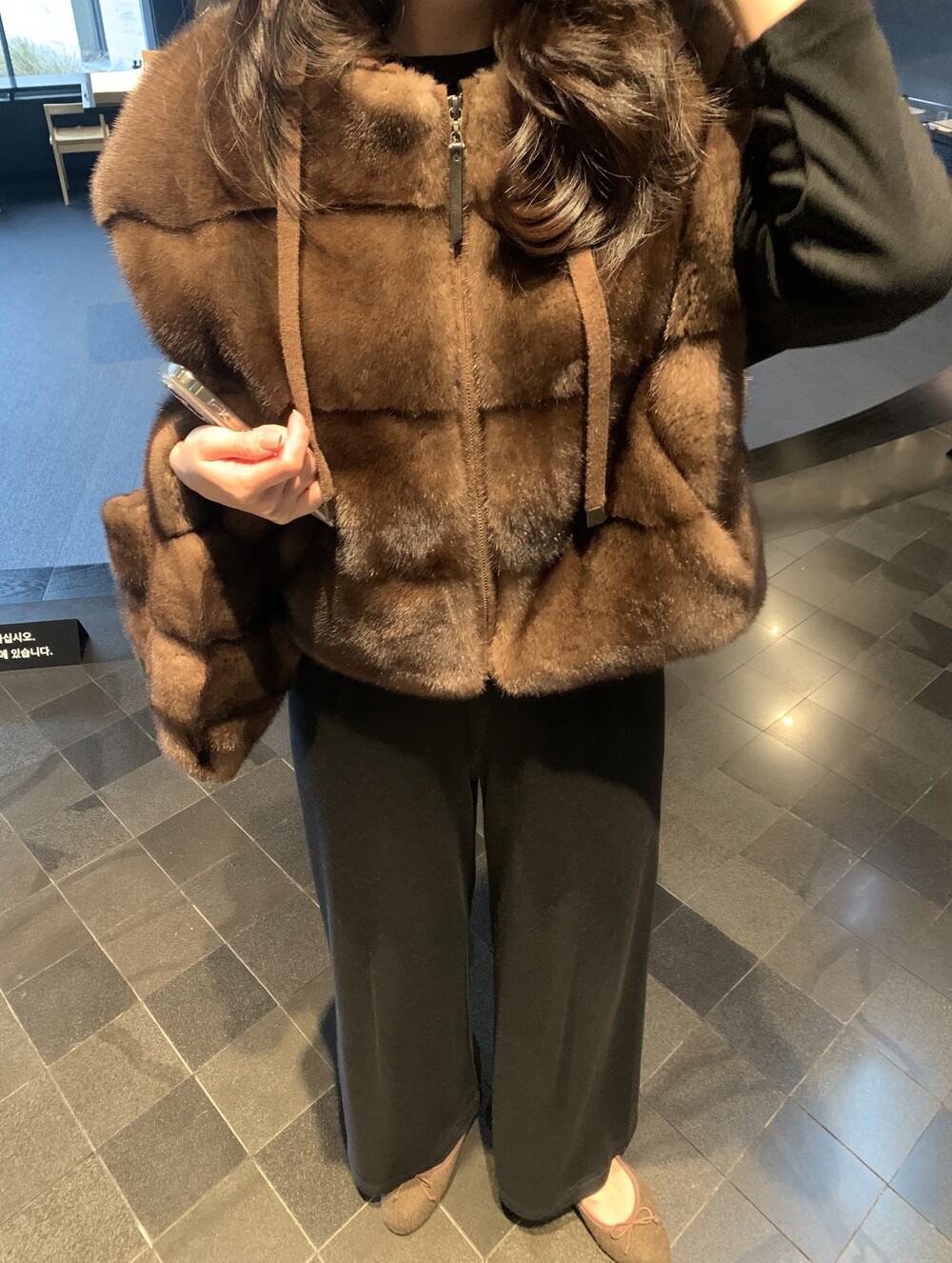 mink hood crop vest (brown) + [made] lounge top&pants set (black) + winter flat shoes (brown) + mink petit bag (horizontal/deepbrown)