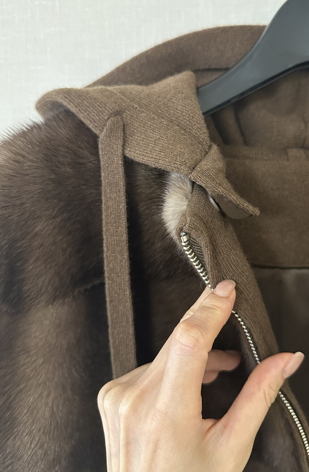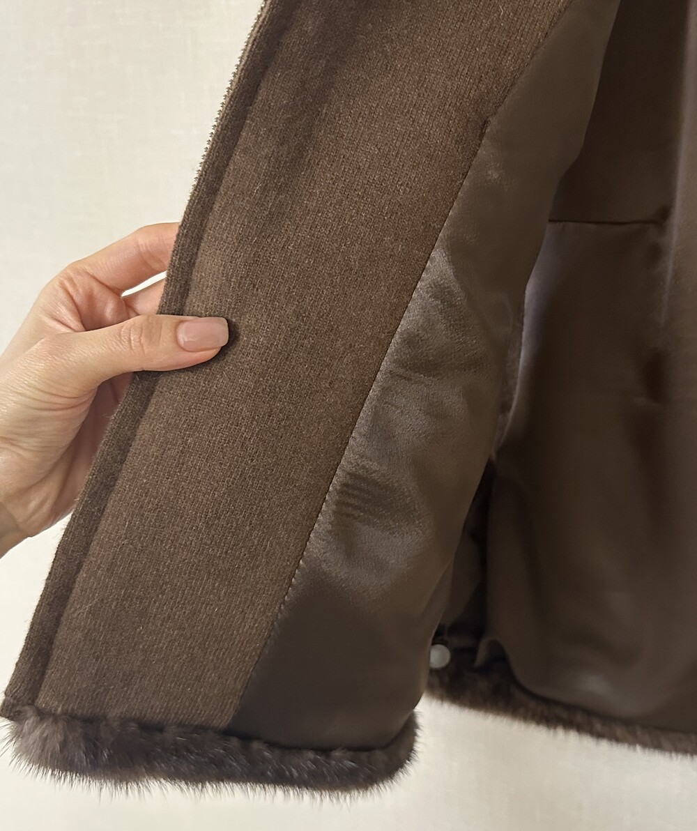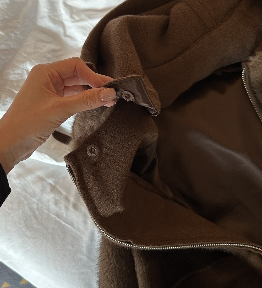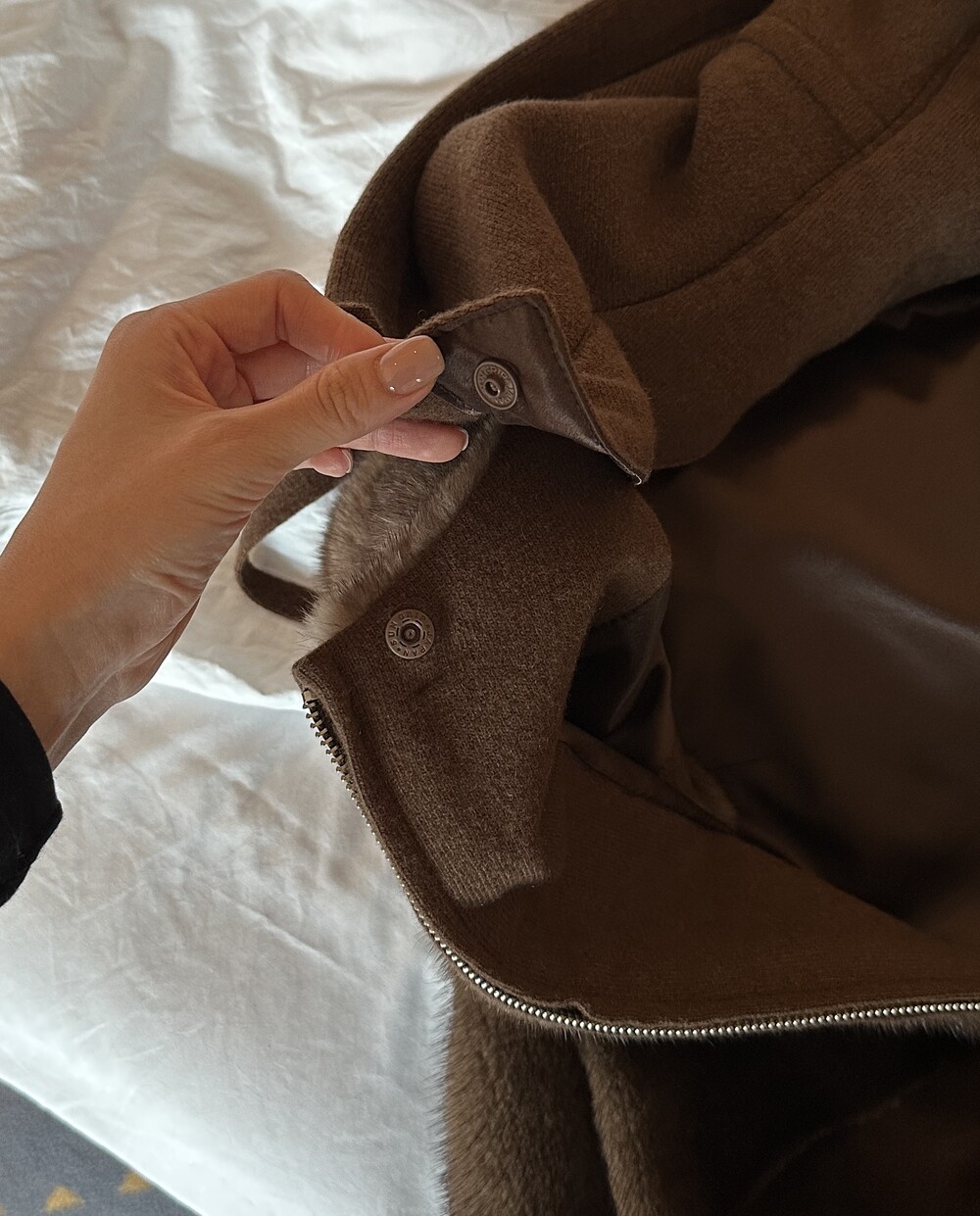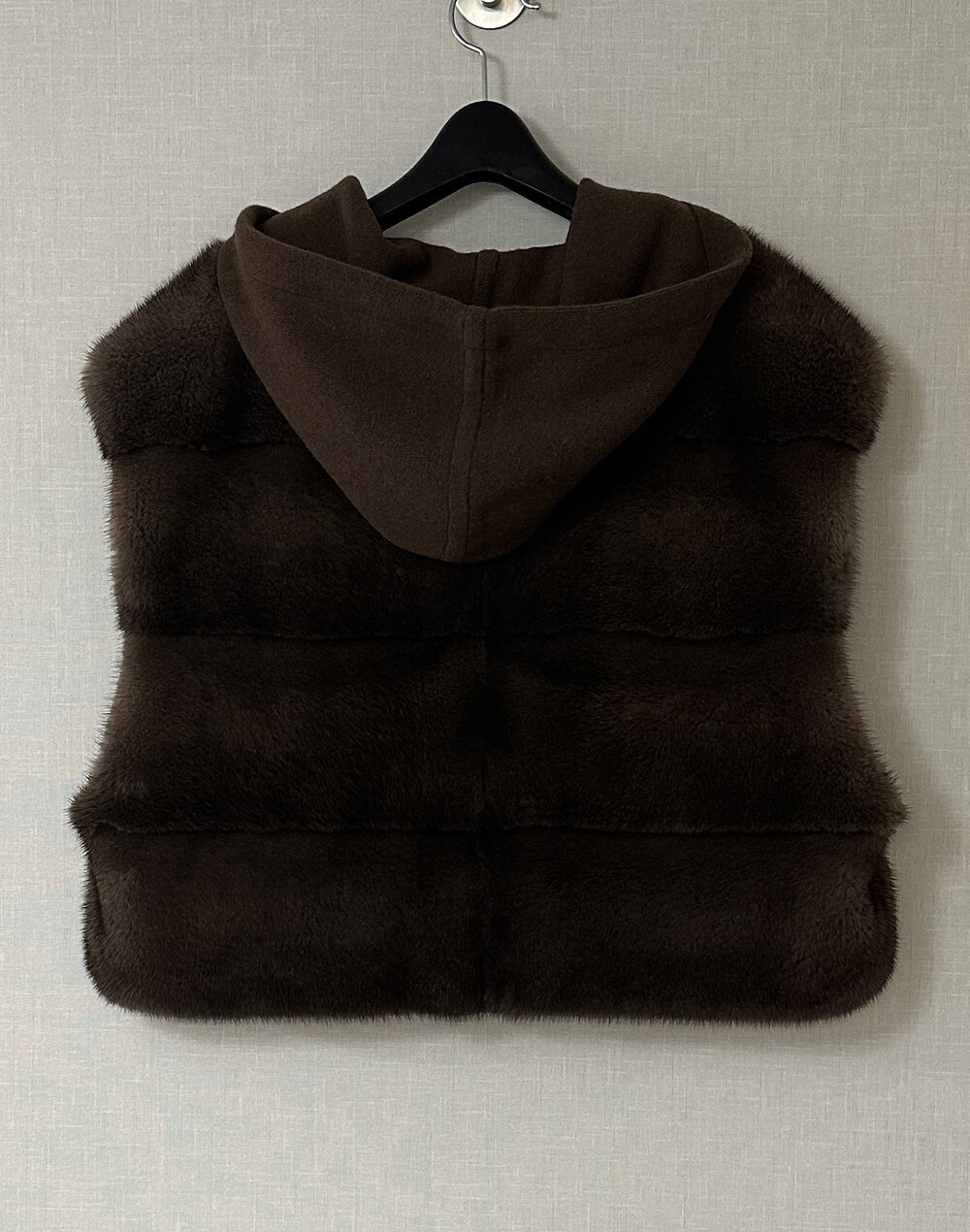 mink hood crop vest (brown) + [made] lounge top&pants set (black) + winter flat shoes (brown) + mink petit bag (horizontal/deepbrown)