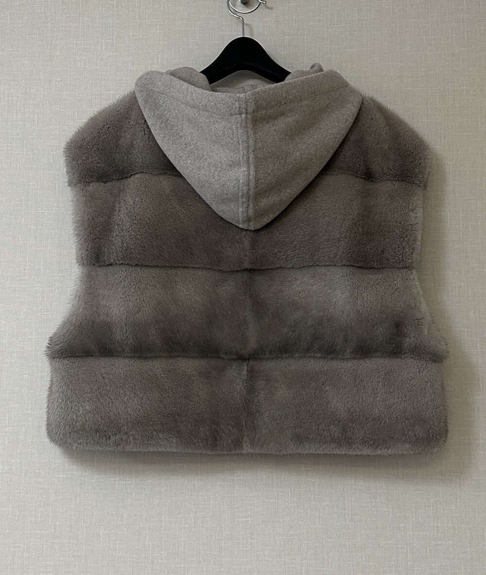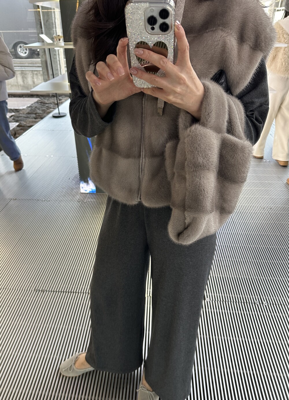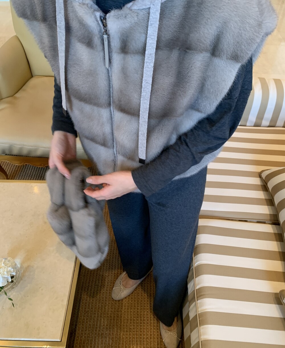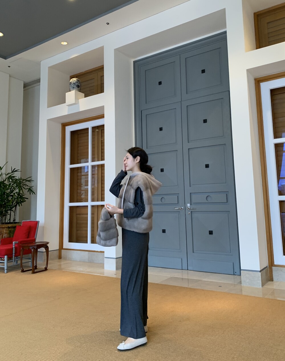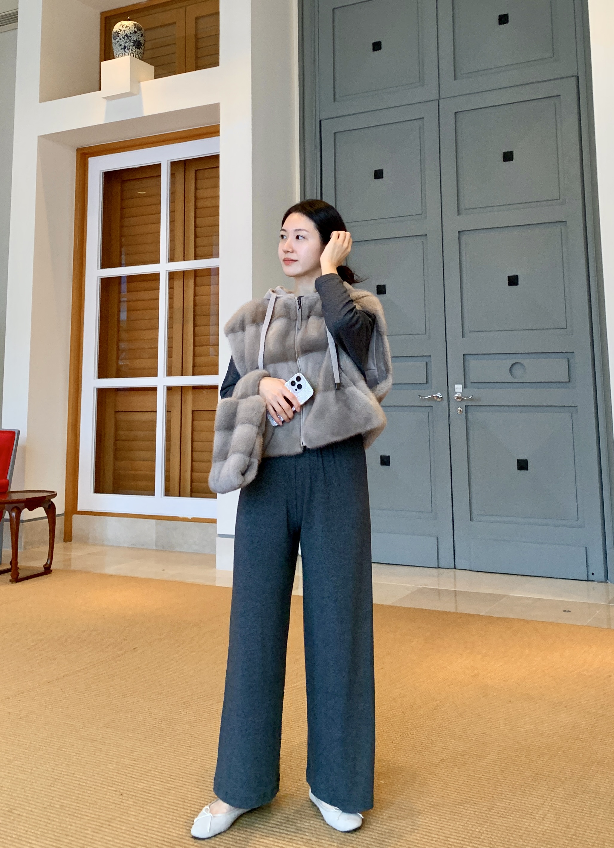 mink hood crop vest (silverblue) + [made] lounge top&pants set (chacoal) + winter flat shoes (oatmeal) + mink petit bag (horizontal/silverblue)
