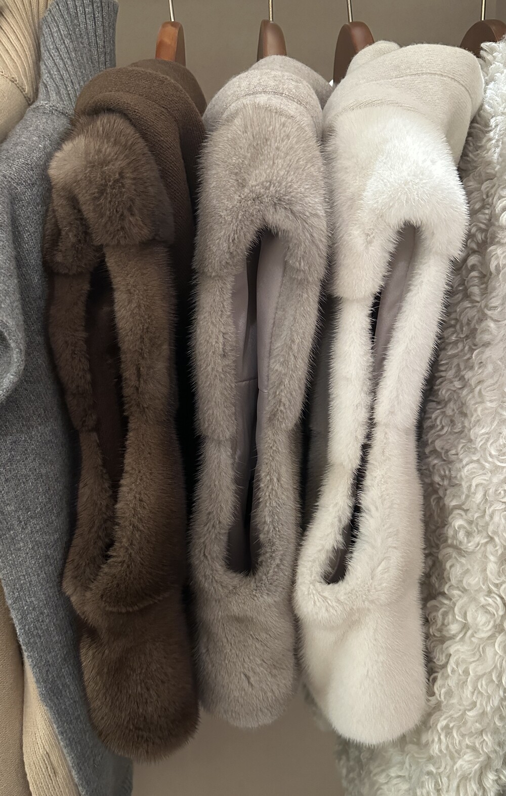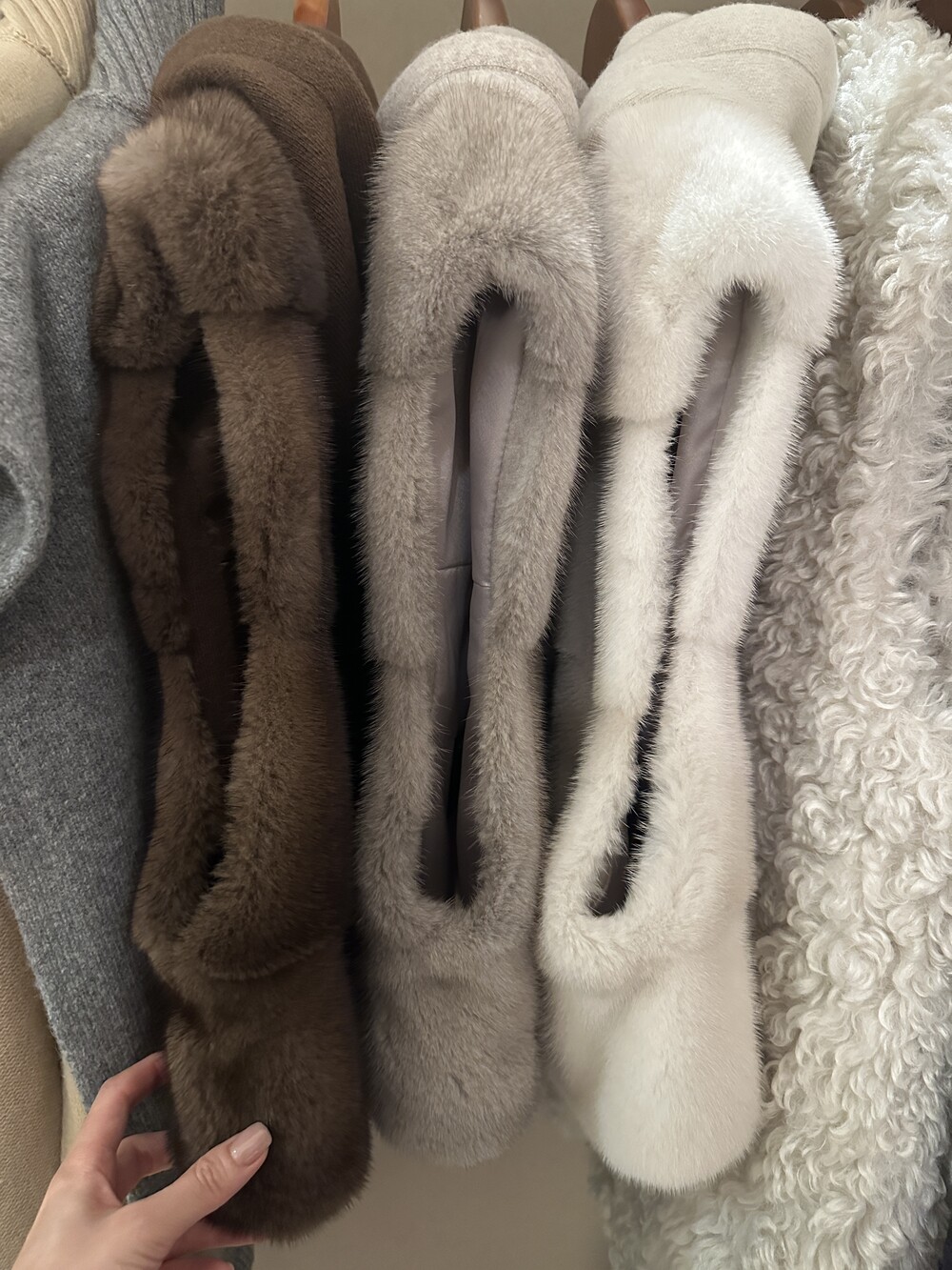 mink hood crop vest (pearlbeige) + [made] lounge top&pants set (etoff) + winter flat shoes (oatemal)
