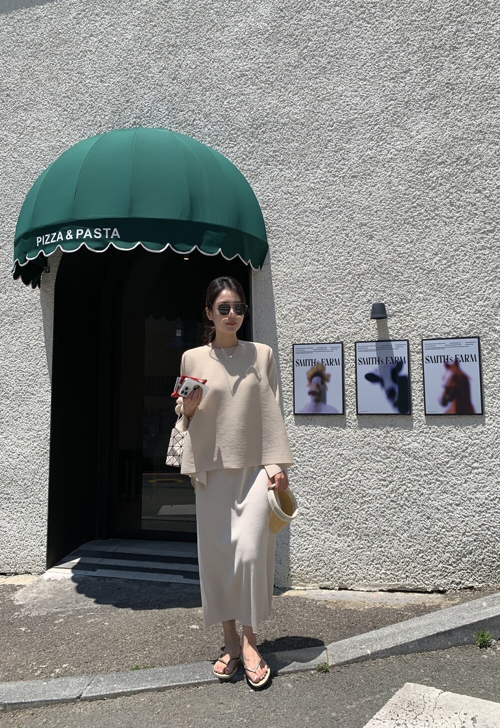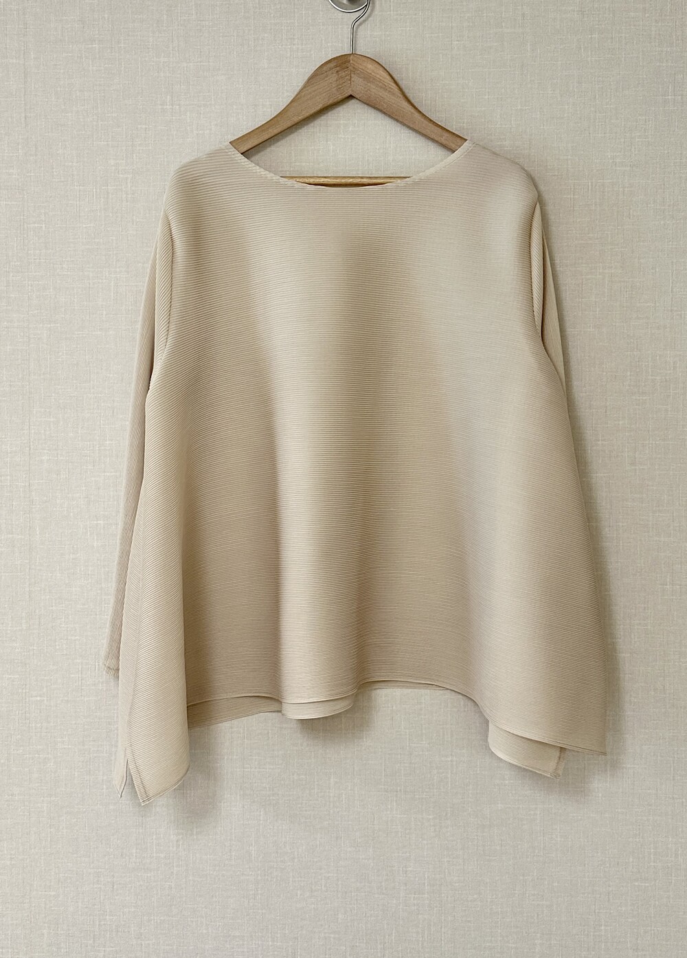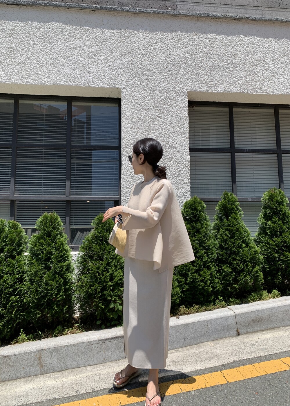 pleats flare top (beige) + ribbed short-sleeve knitops (beige)