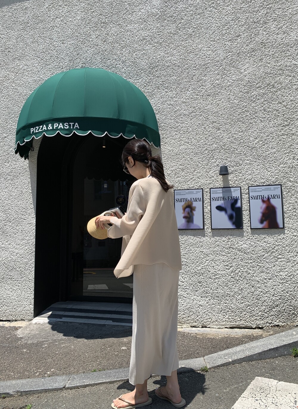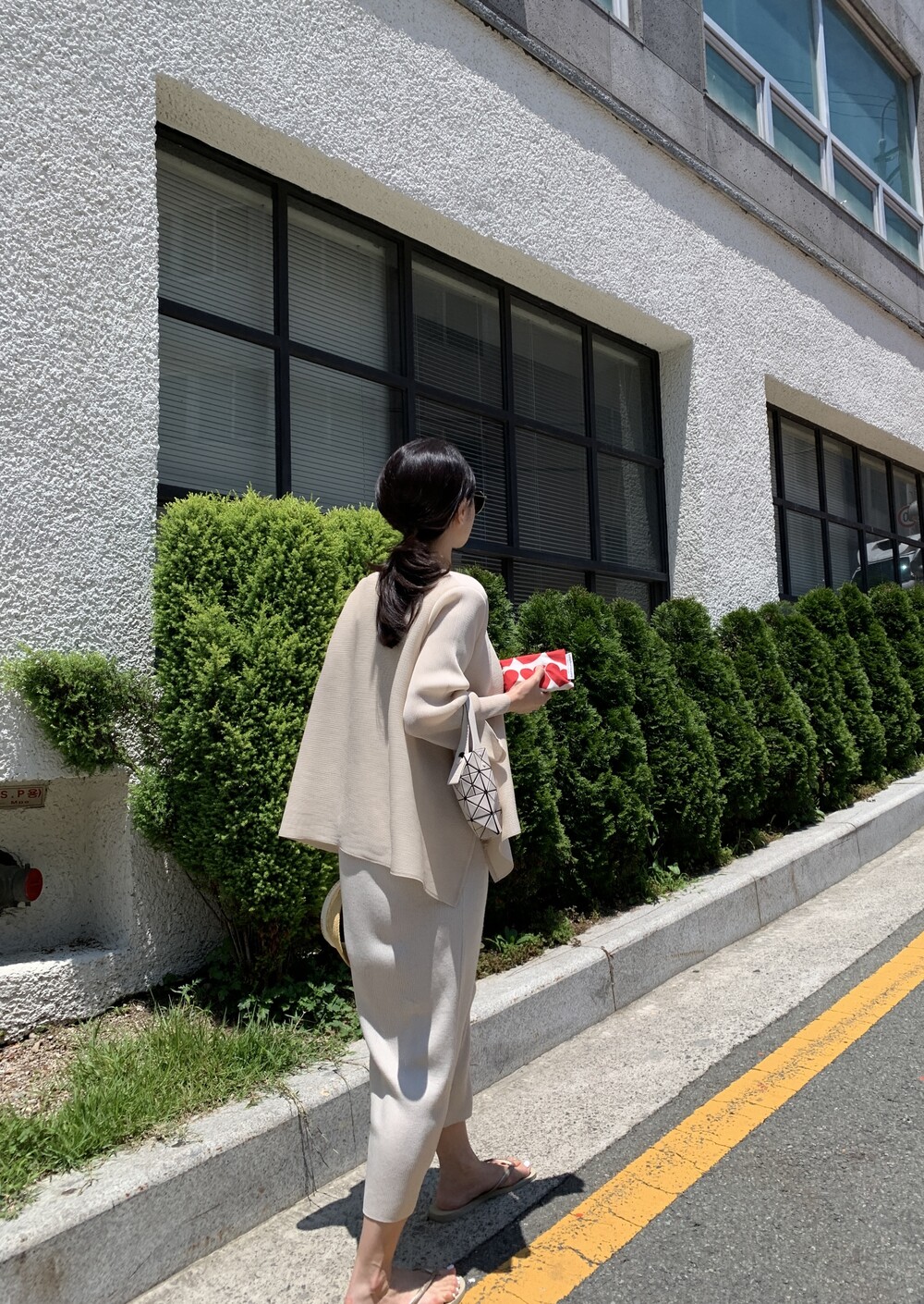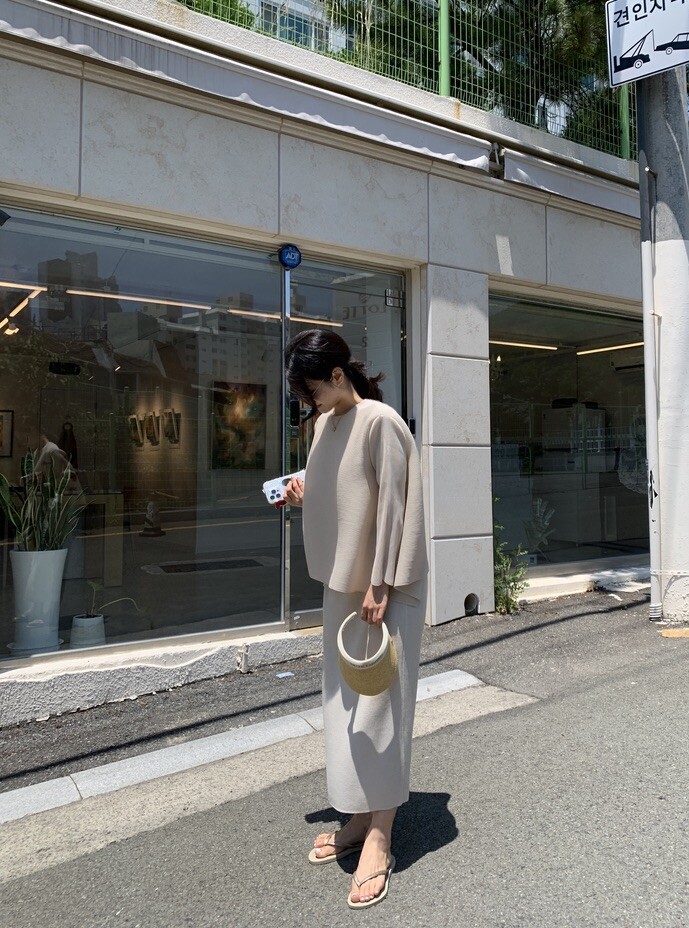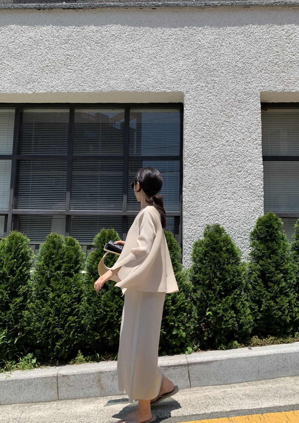 pleats flare top (beige) + ribbed short-sleeve knitops (beige)