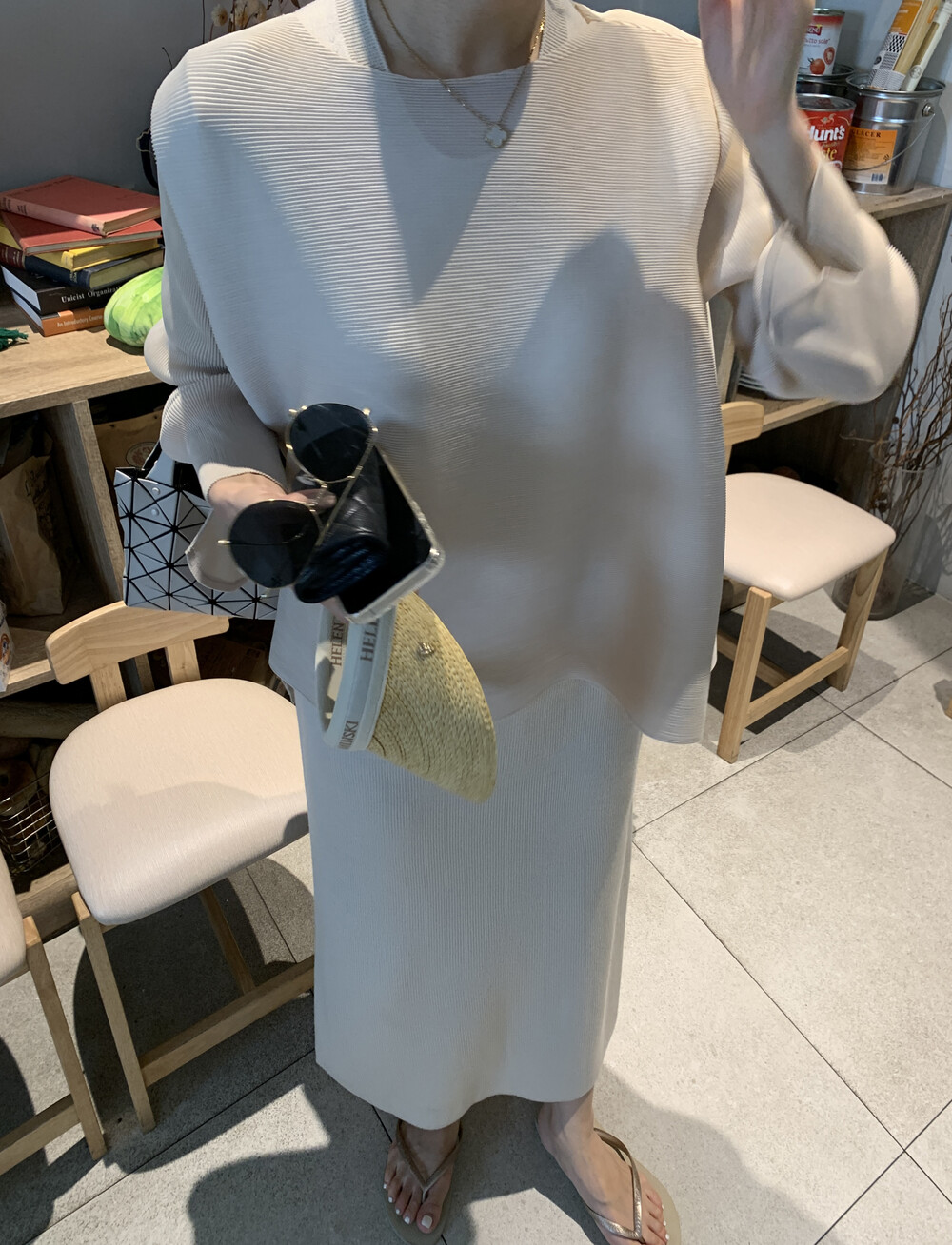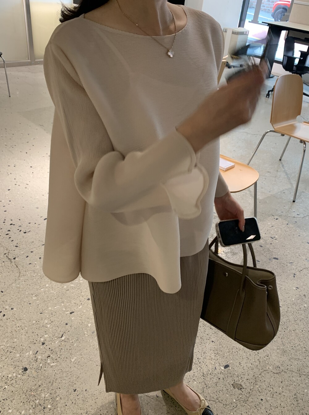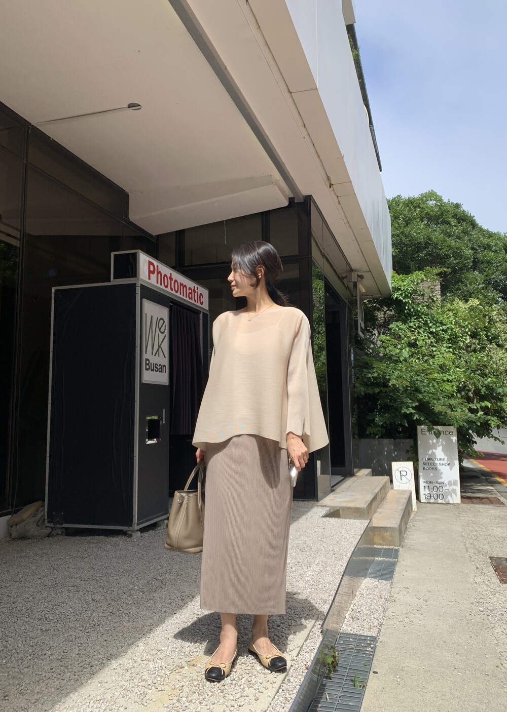 pleats flare top (beige) + pleats mist camisole (ivory) + bold-pleats basic skirt (mocha)