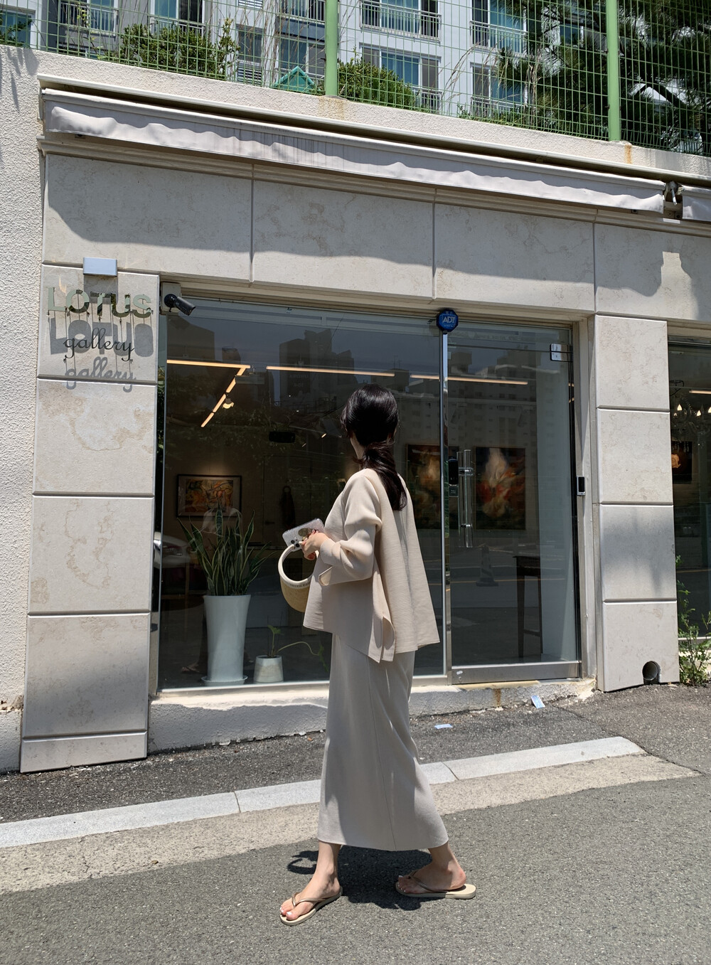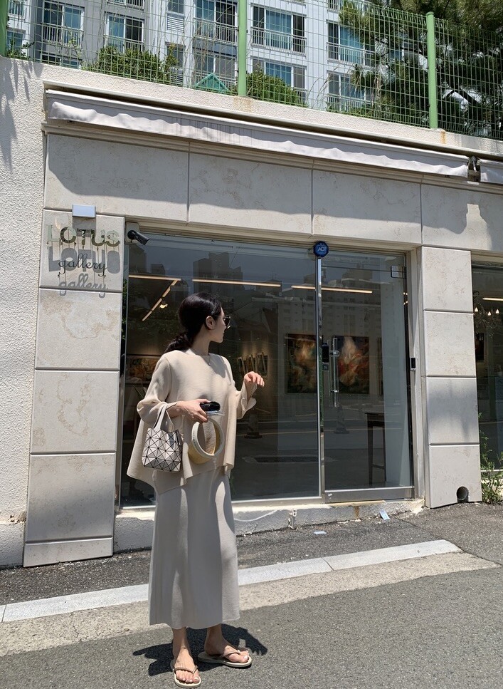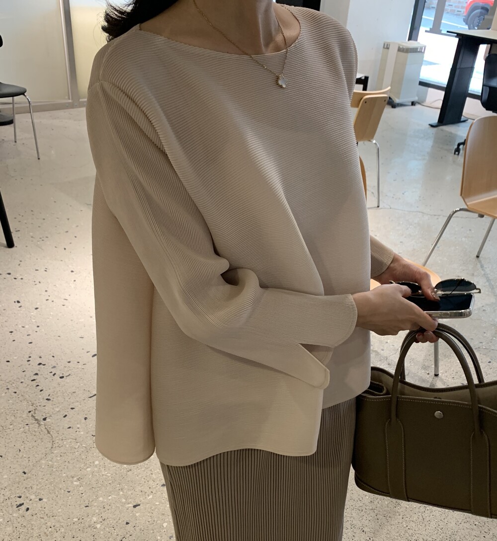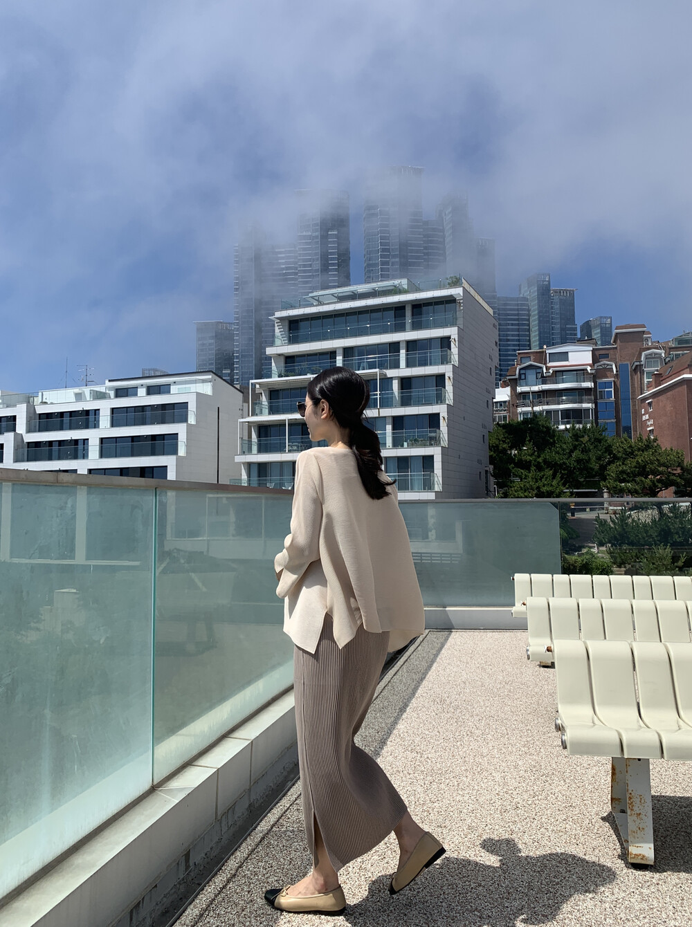 pleats flare top (beige) + pleats mist camisole (ivory) + bold-pleats basic skirt (mocha)