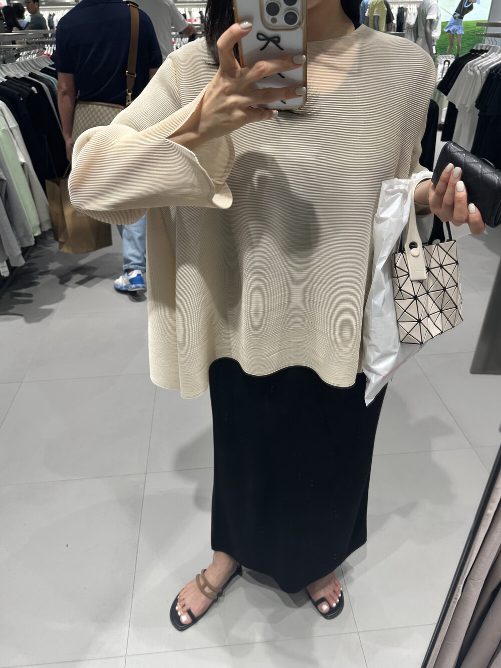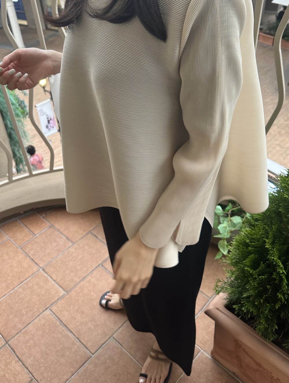 pleats flare top (beige) + ribbed short-sleeve knitops (black)