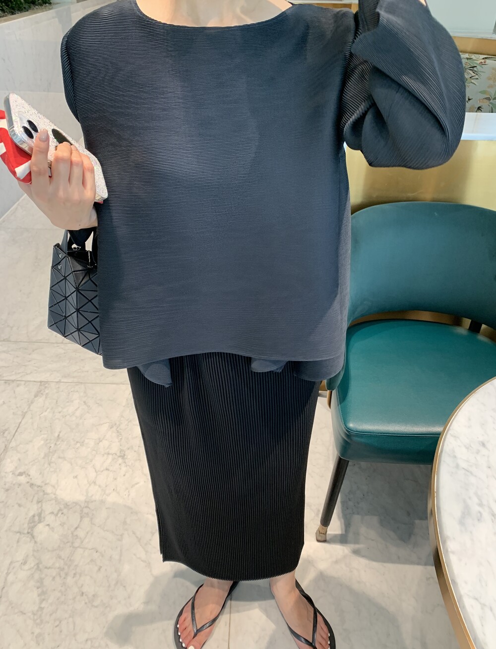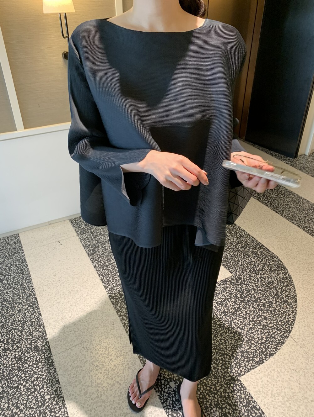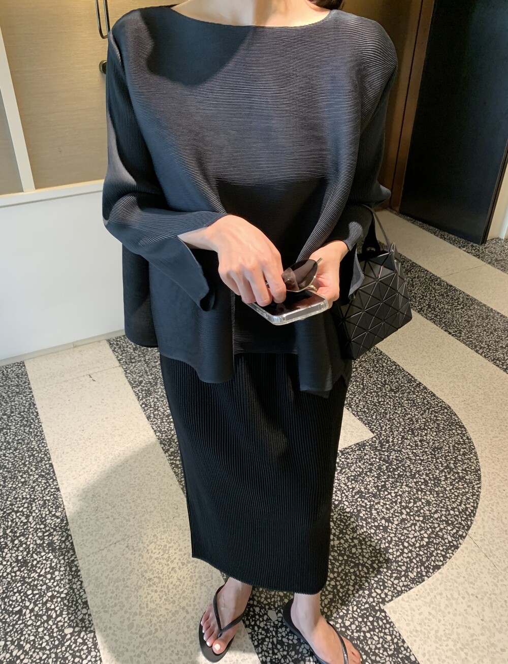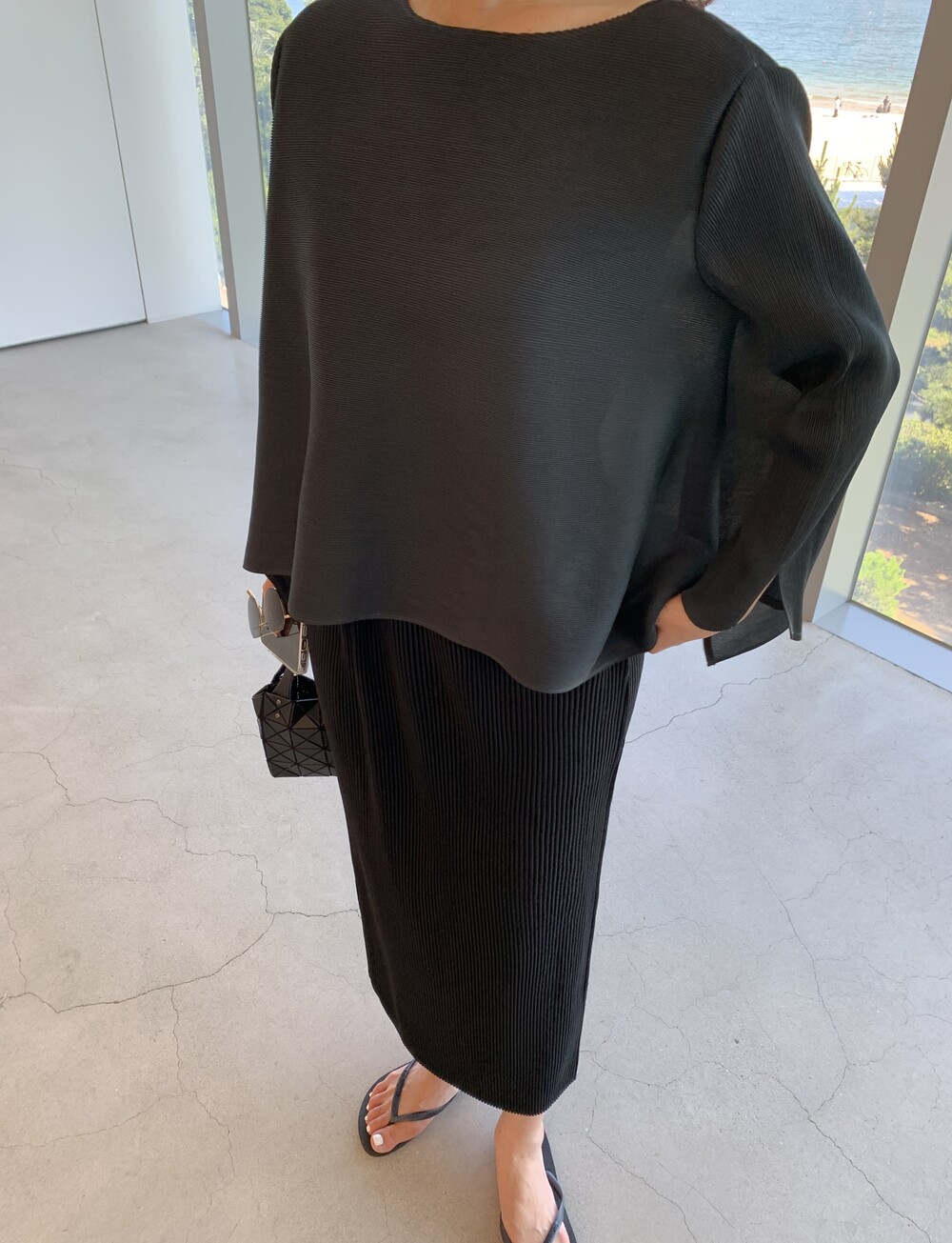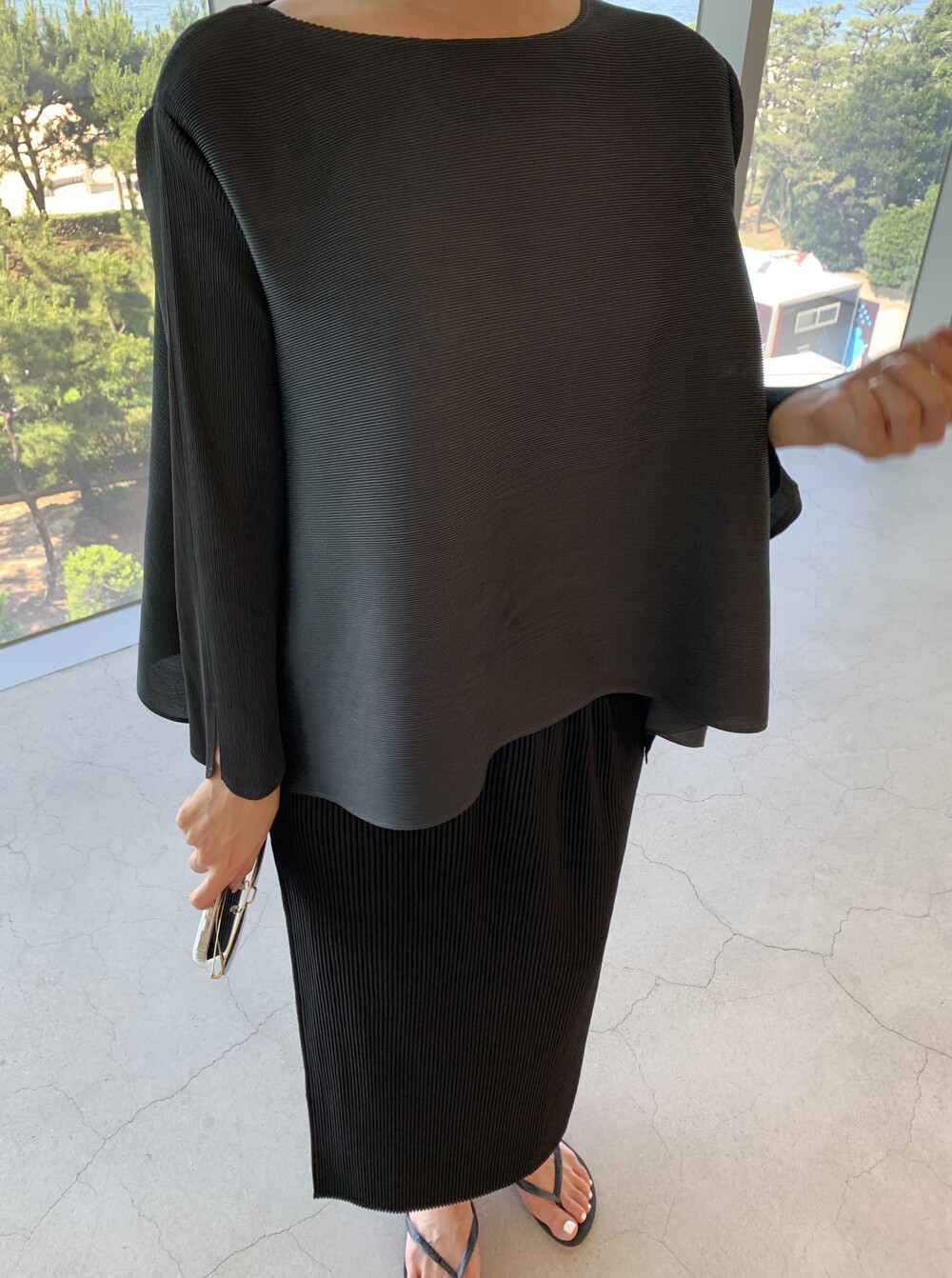 pleats flare top (ashblack) + pleats mist camisole (black) + bold-pleats basic skirt (black)