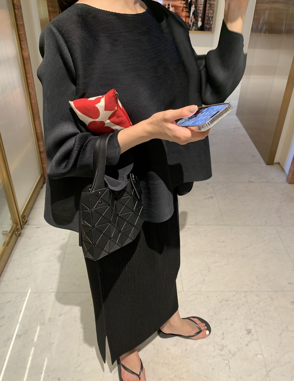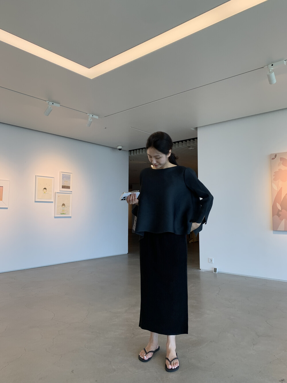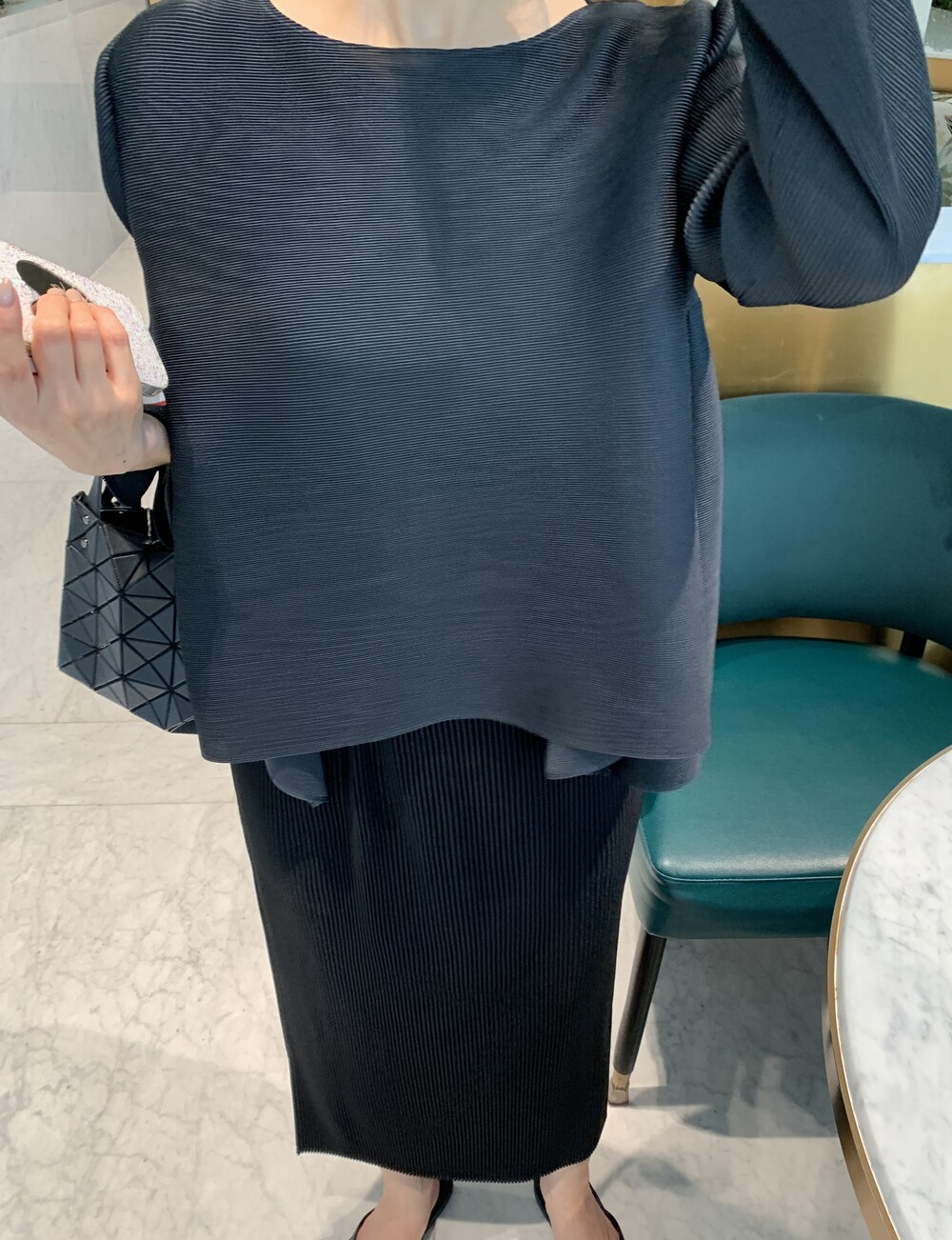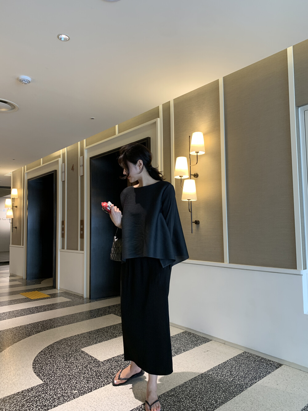 pleats flare top (ashblack) + pleats mist camisole (black) + bold-pleats basic skirt (black)