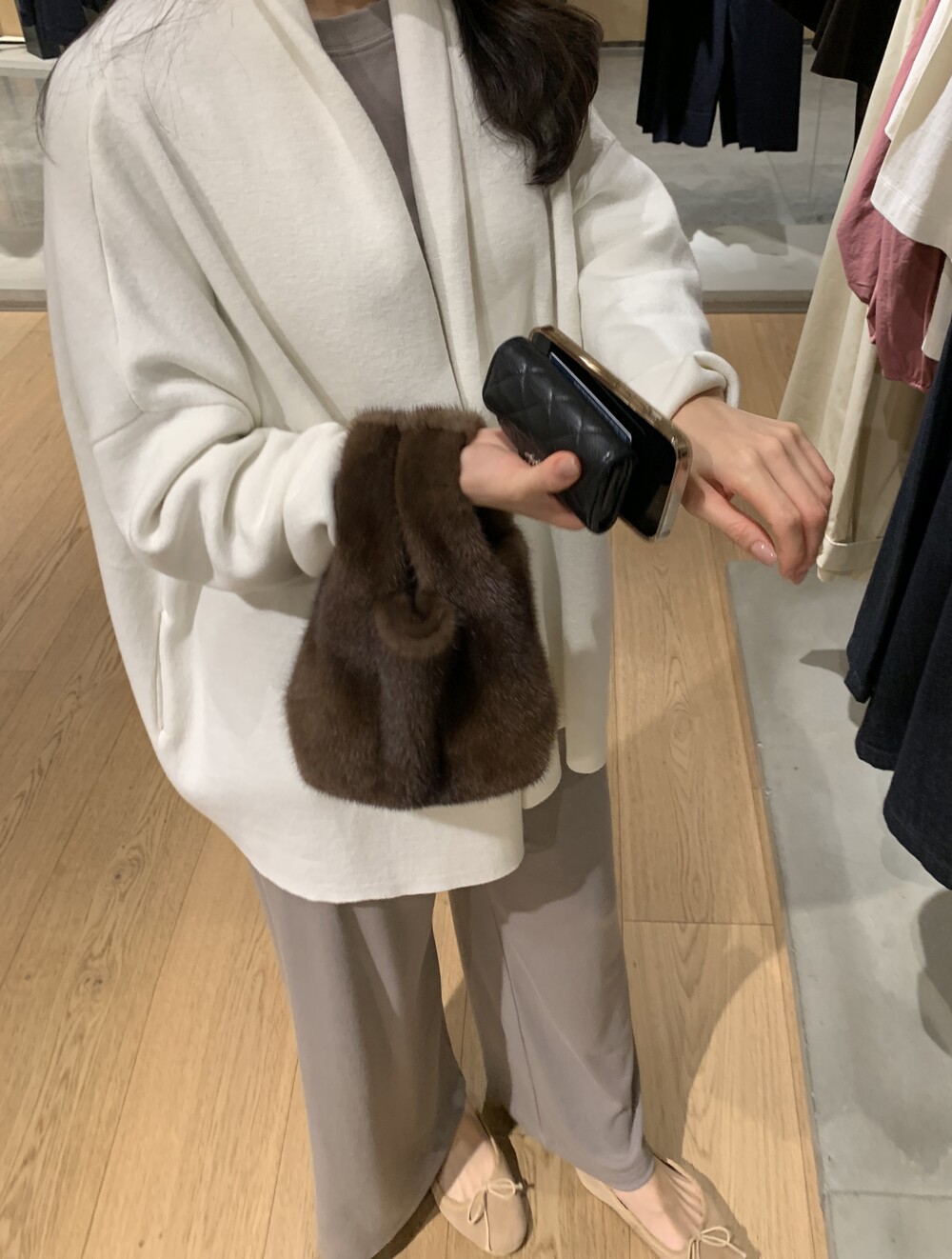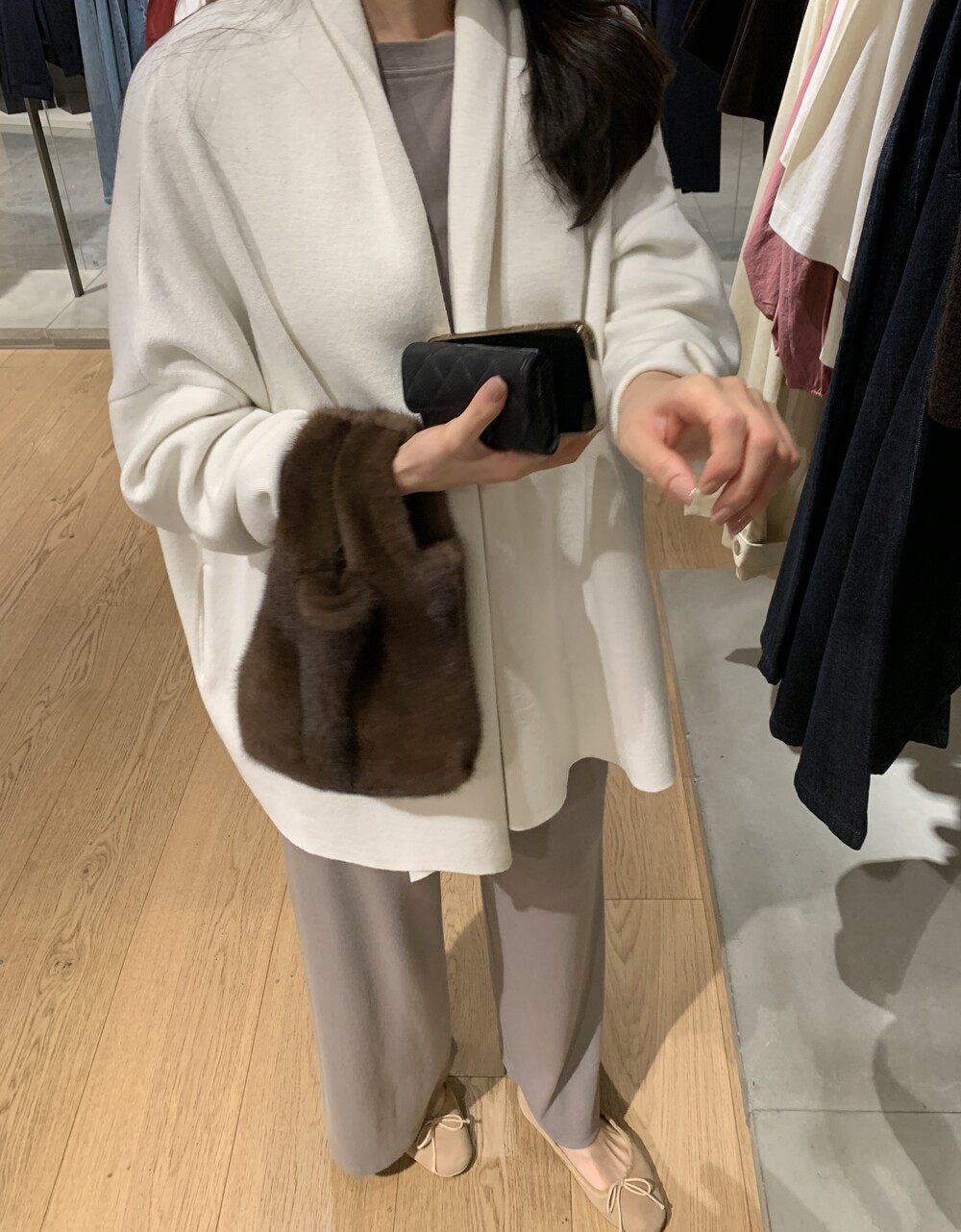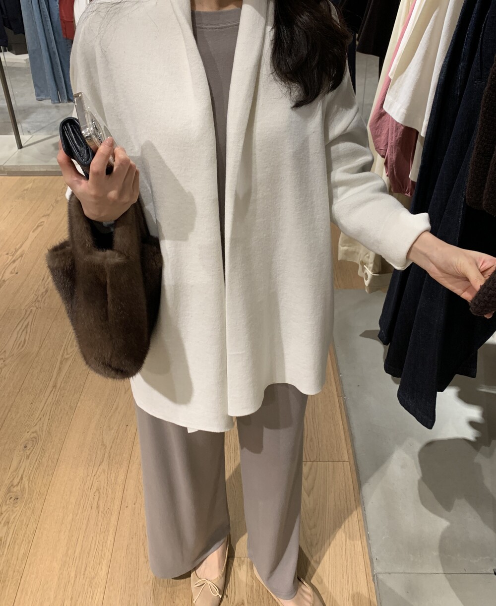 shawl half cardigan (ivory) + [made] lounge top&pants set (etoff) + suede flat shoes (beige) + mink petit bag (fullskin/deepbrown)