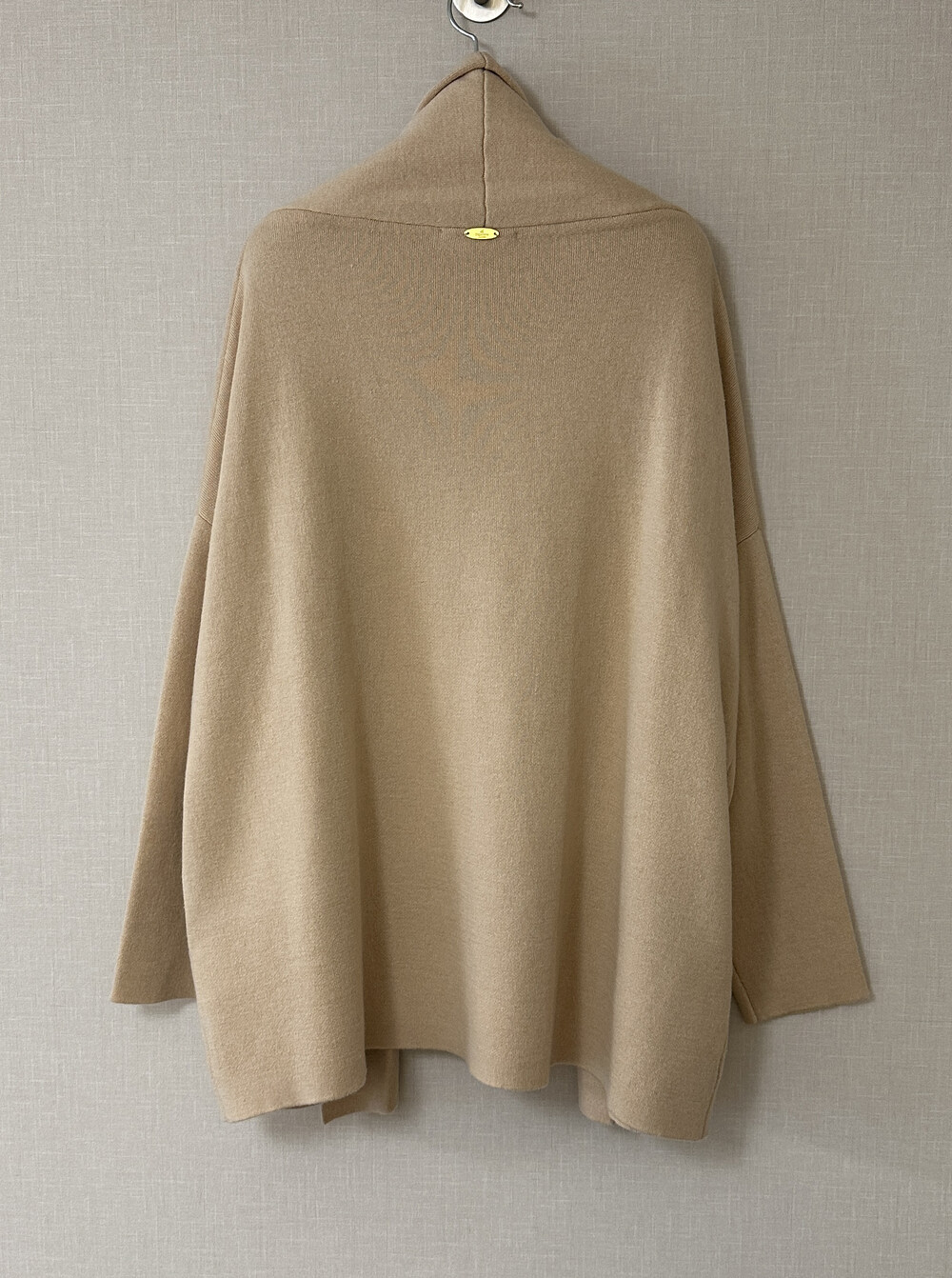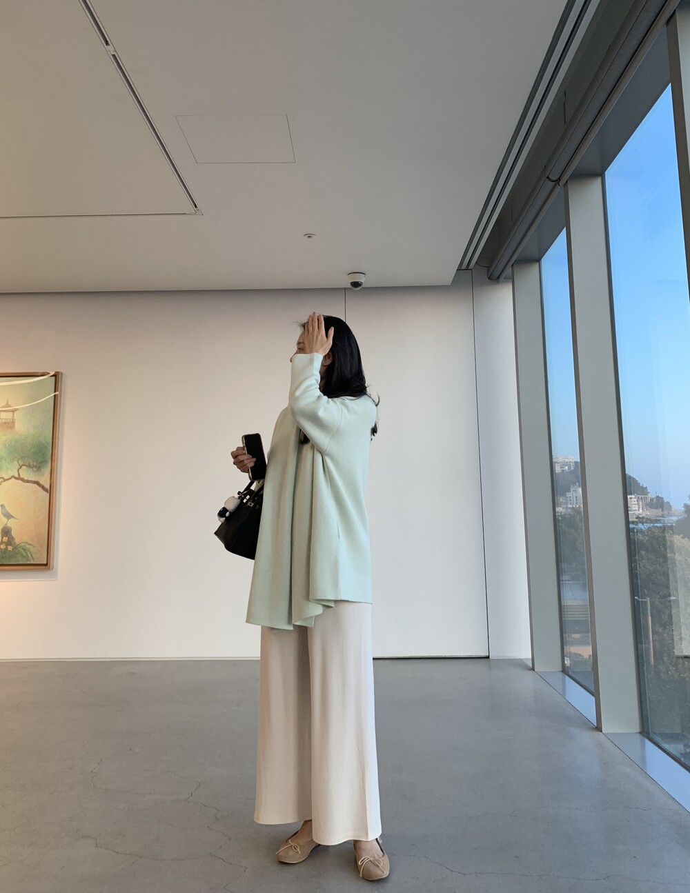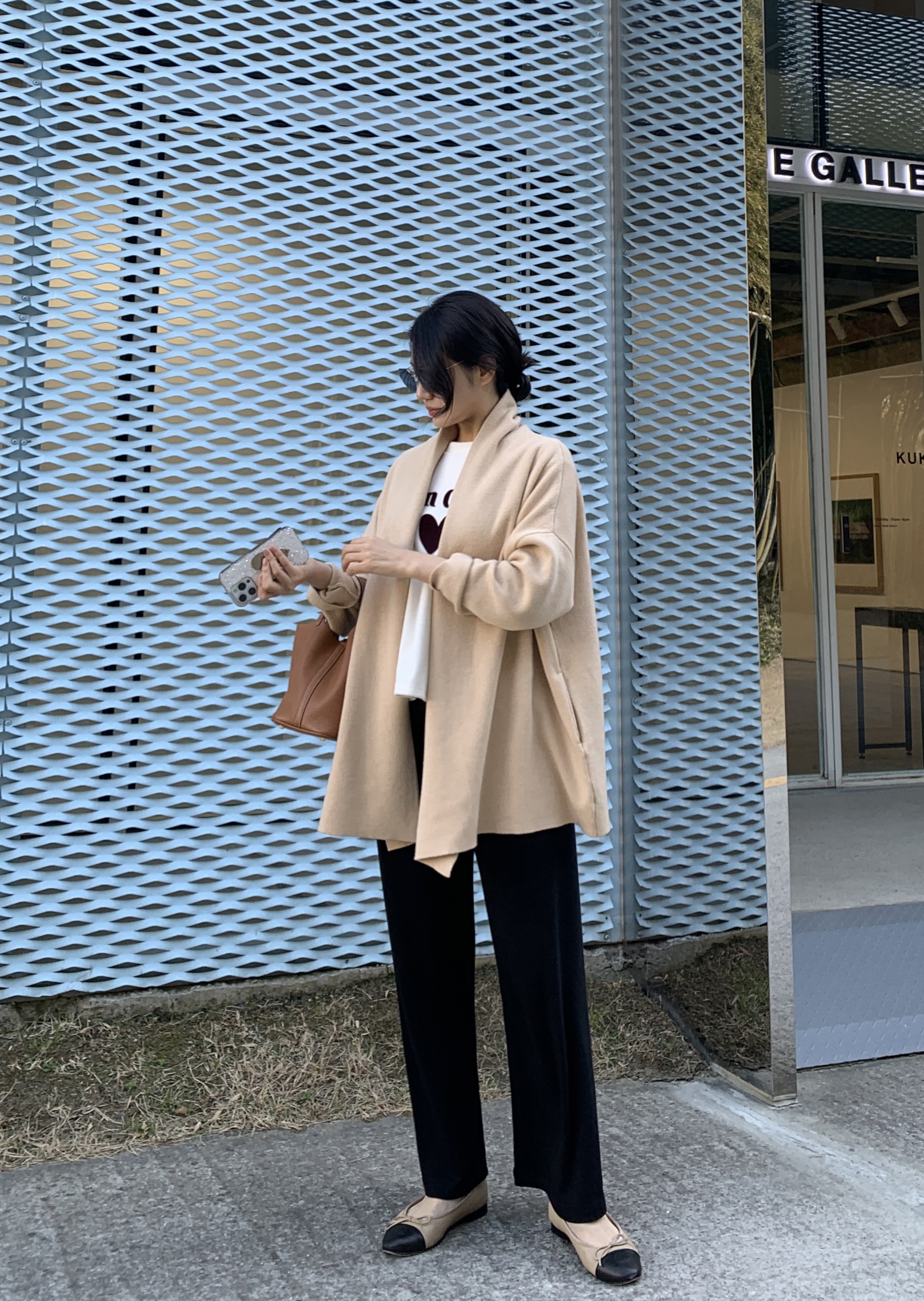 shawl half cardigan (mink) + [made] lounge top&pants set (ivory) + suede flat shoes (beige)