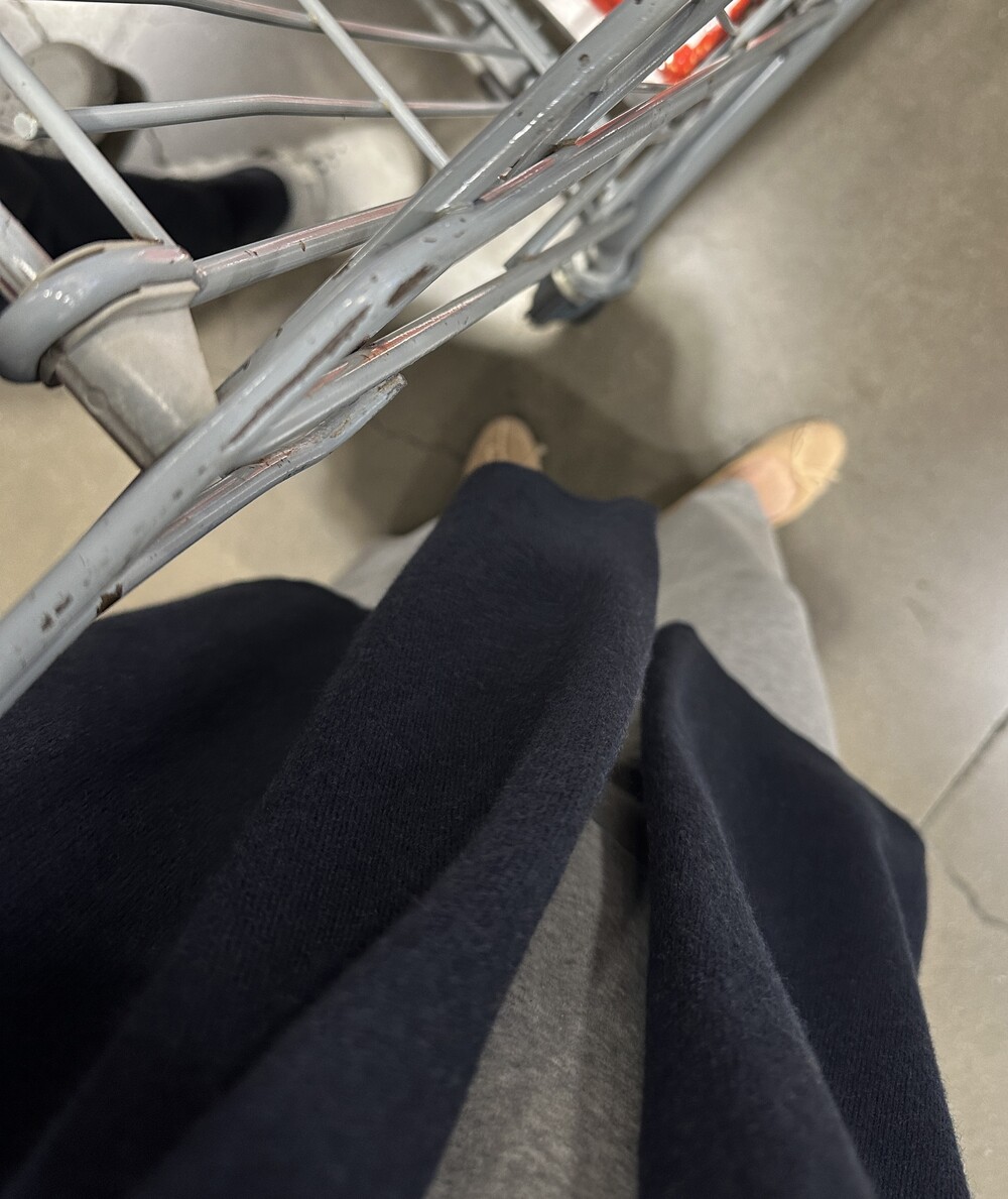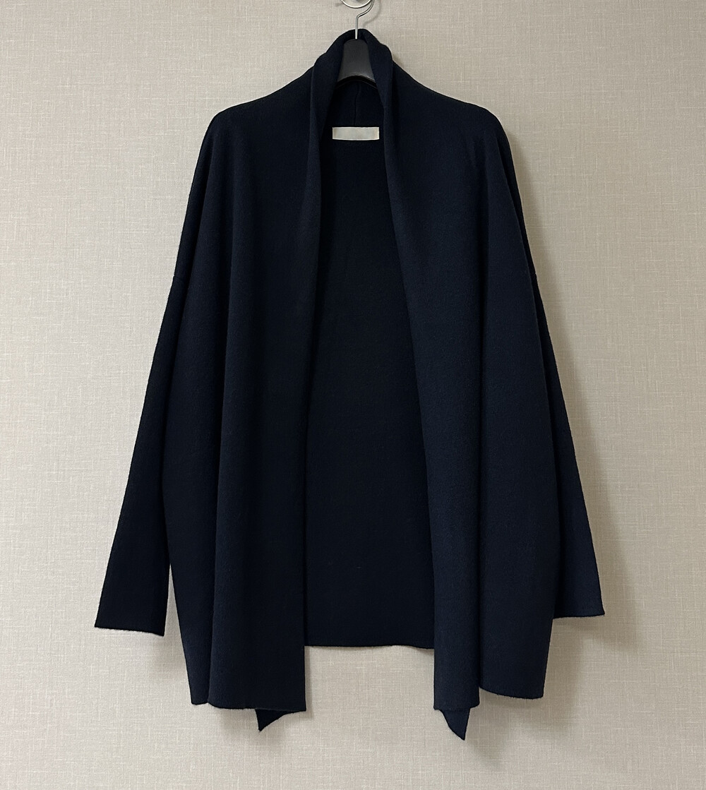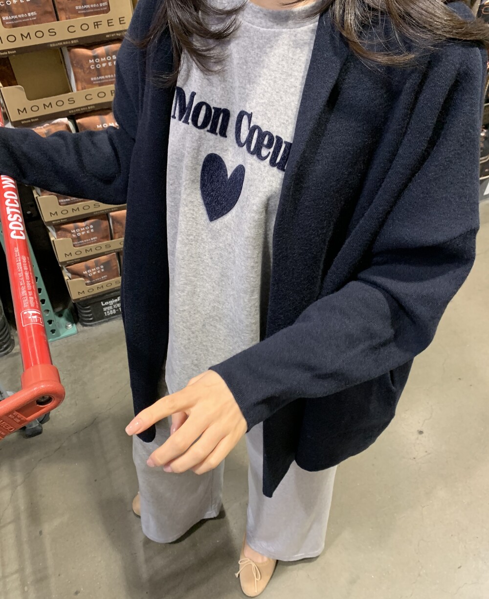 shawl half cardigan (navy) + heart terry t (grey) + [made] lounge pants (melange) + suede flat shoes (beige)