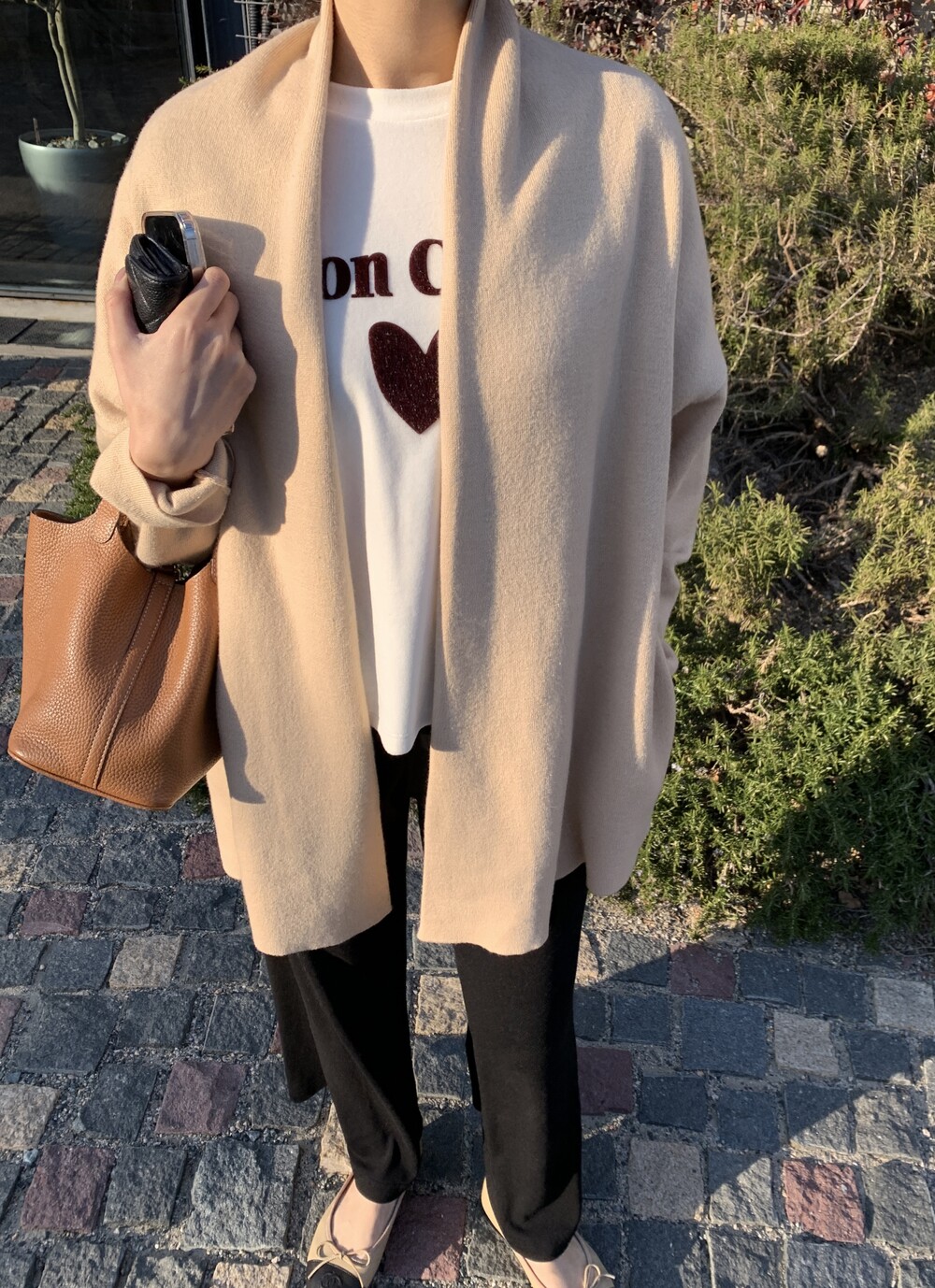 shawl half cardigan (beige) + heart terry t (ivory) + [made] lounge pants (black)