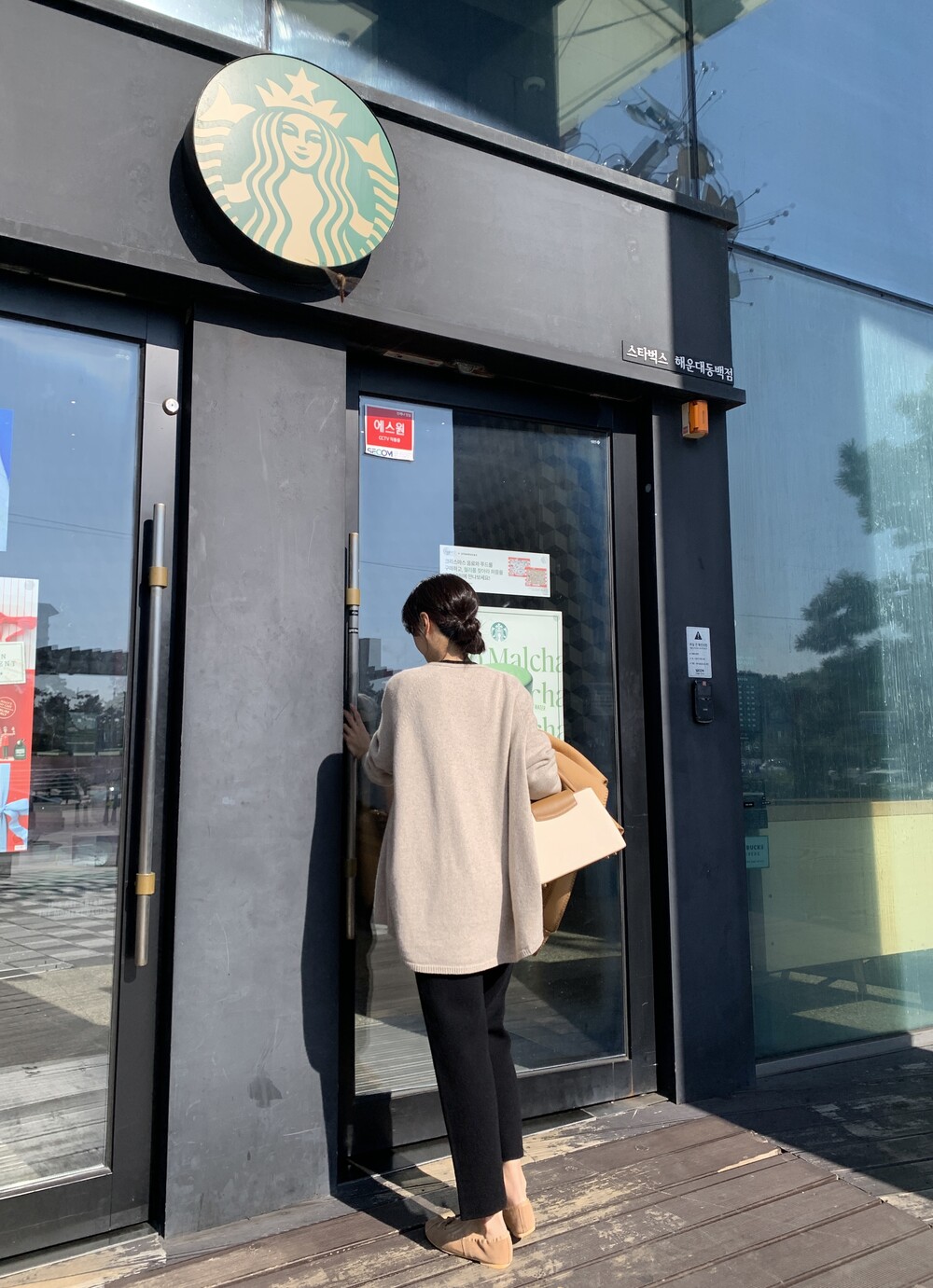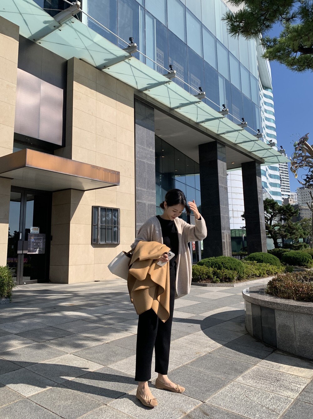 wholegarment mild cardigan (beige) + max inner knit (black) + max semi-crop knitpants (black) + suede flat shoes (beige)