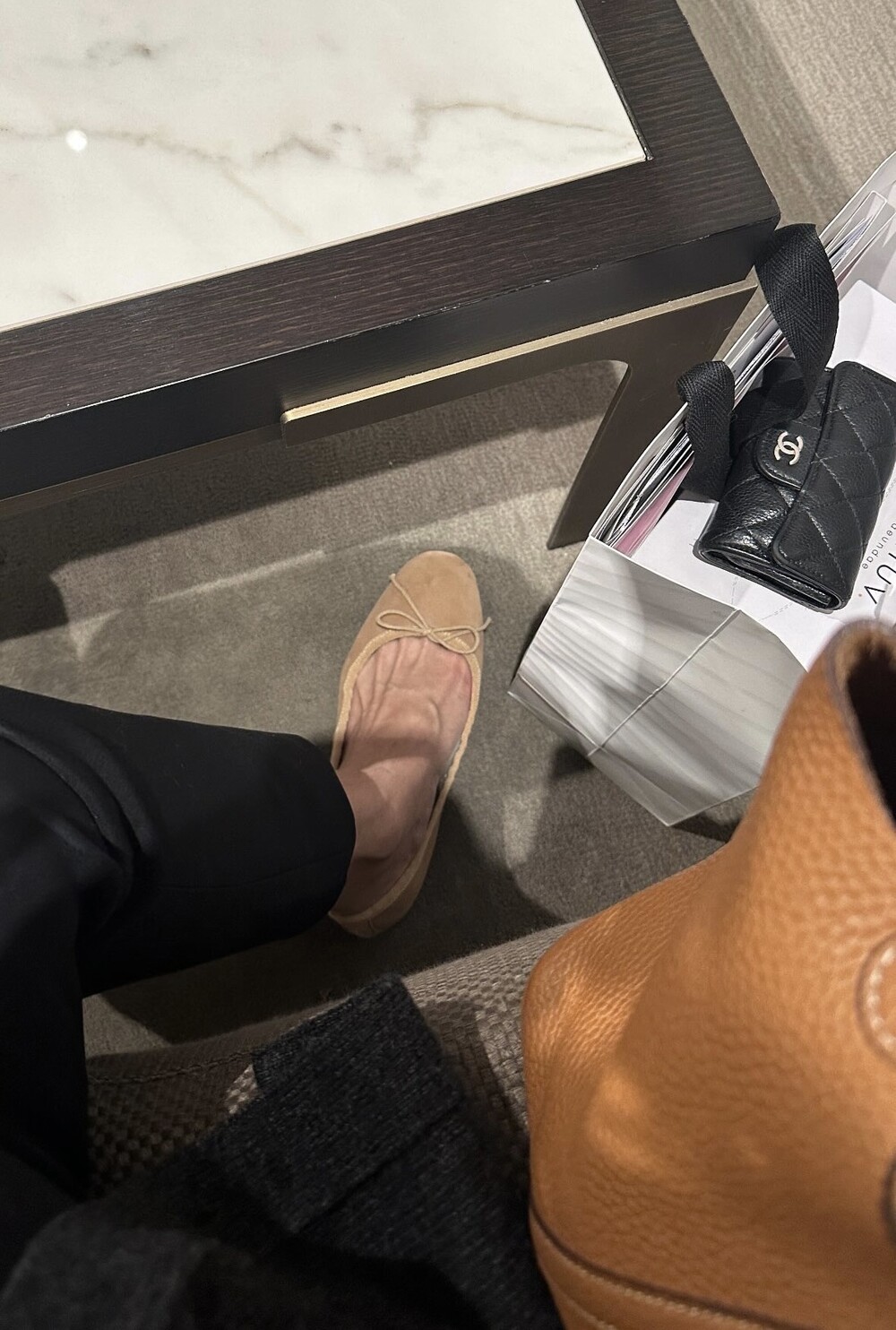 leaf cardigan top (oatbeige) + velvet bending pants (beige) + suede flat shoes (beige)