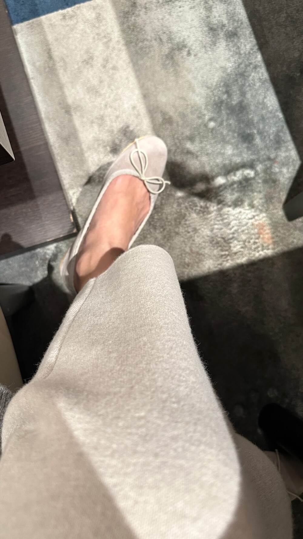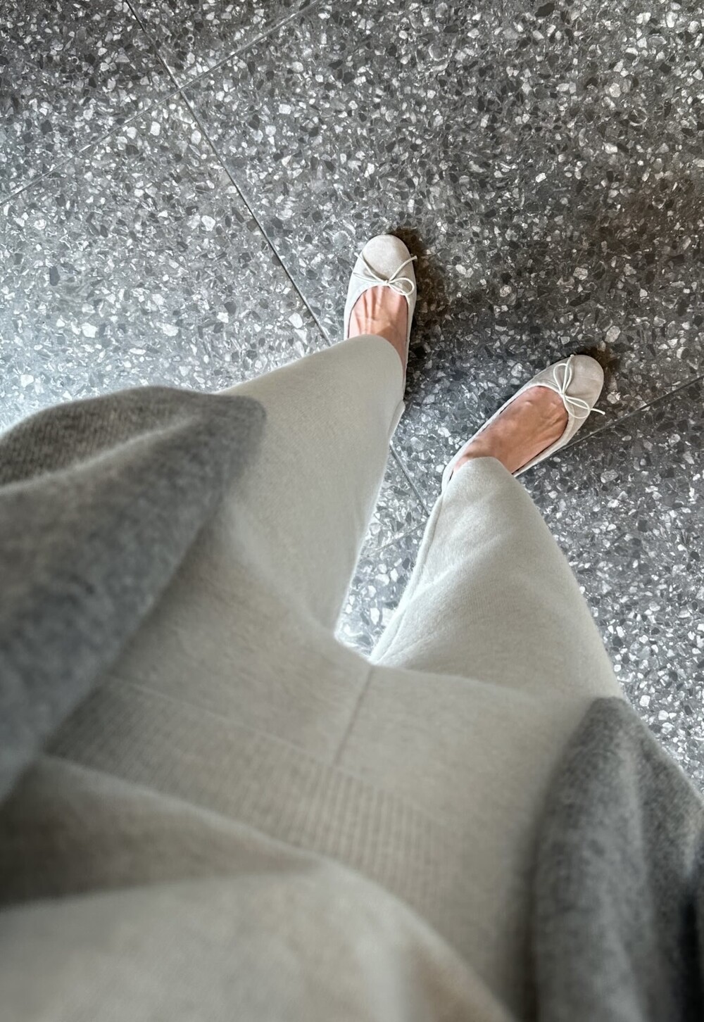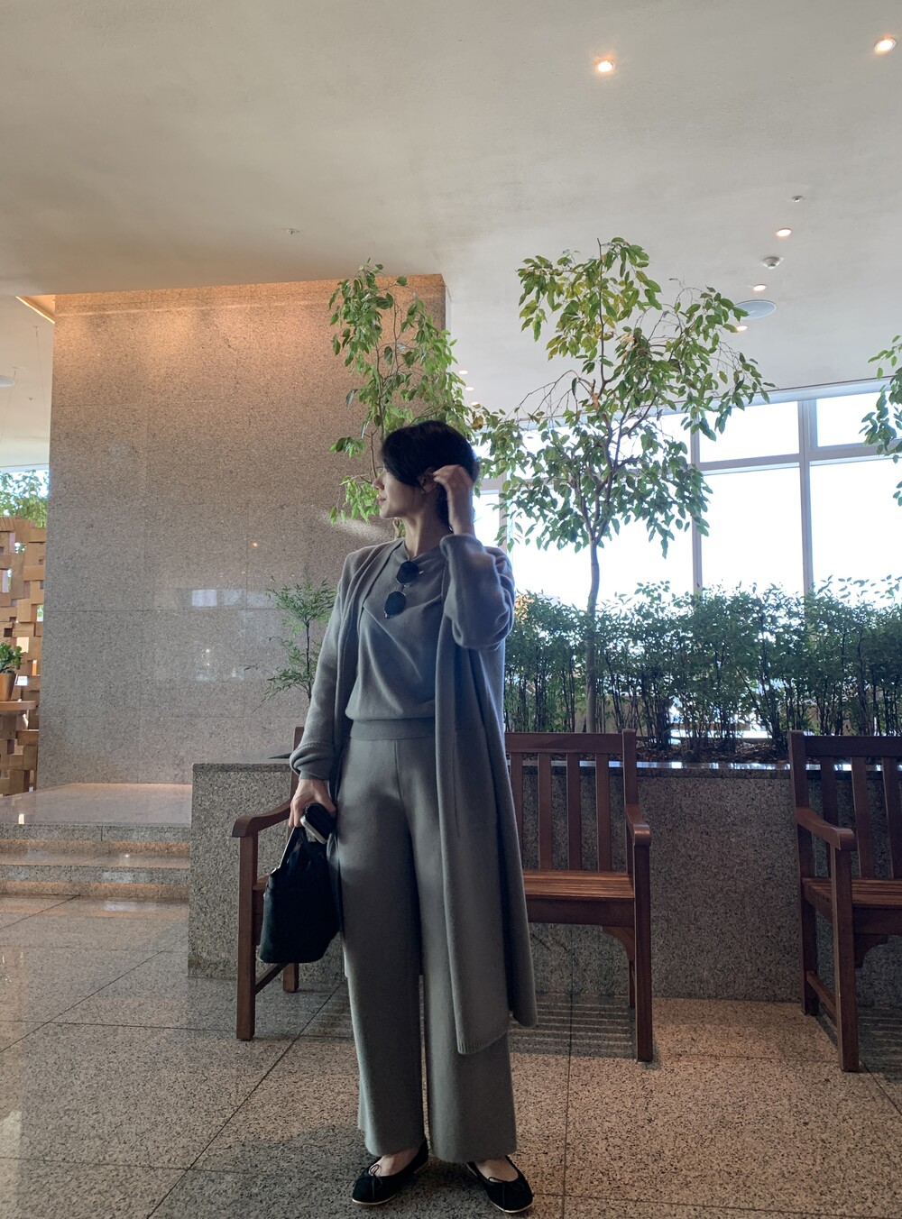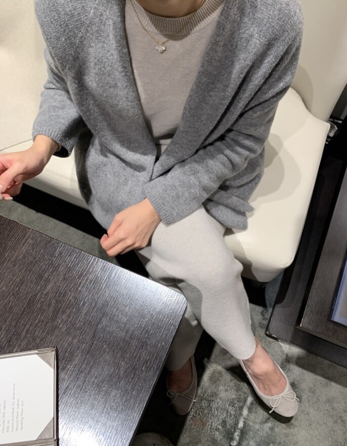 wholegarment mild cardigan (grey) + max inner knit (lightgrey) + max semi-crop knitpants (lightgrey) + suede flat shoes (grey)