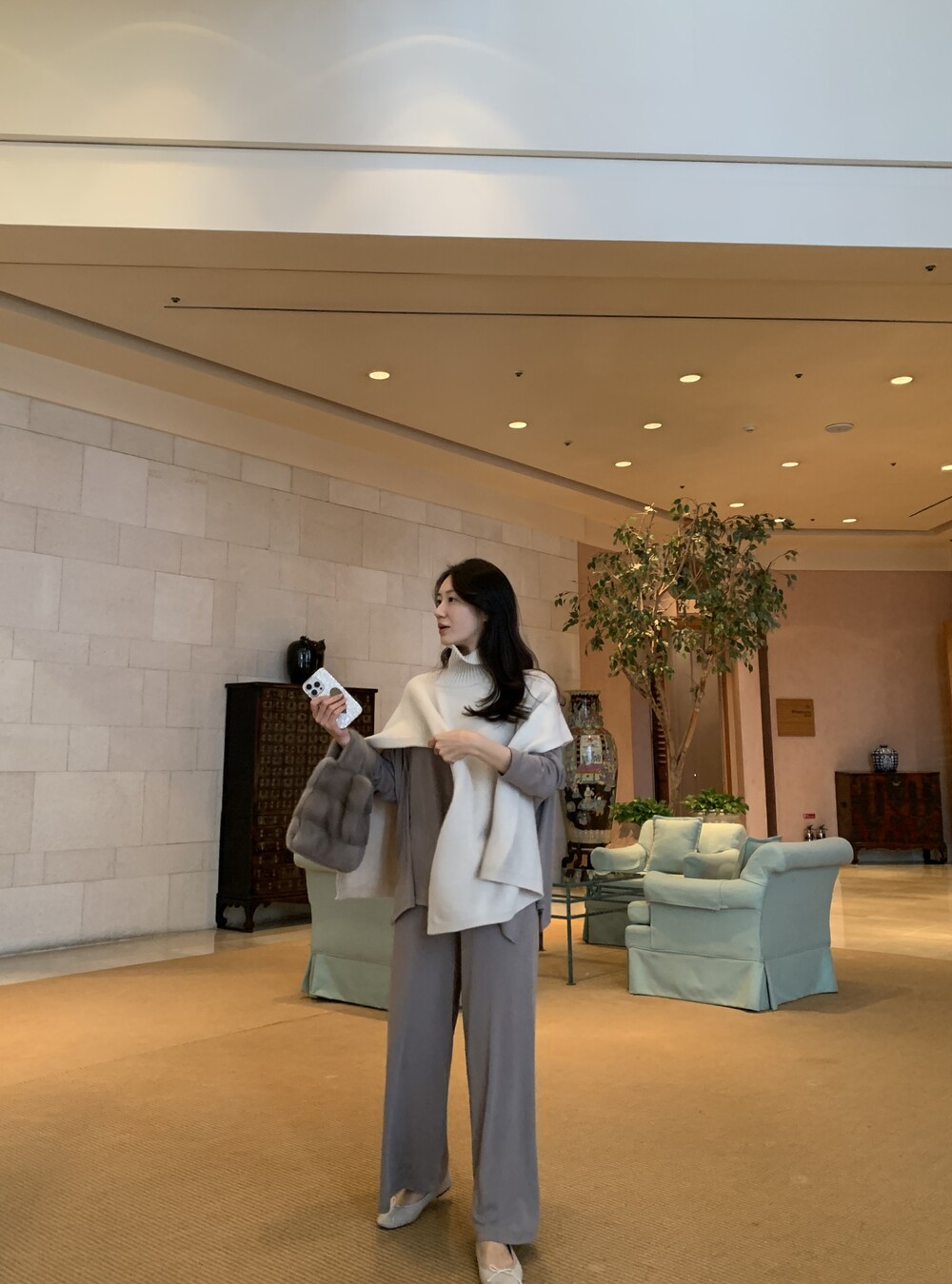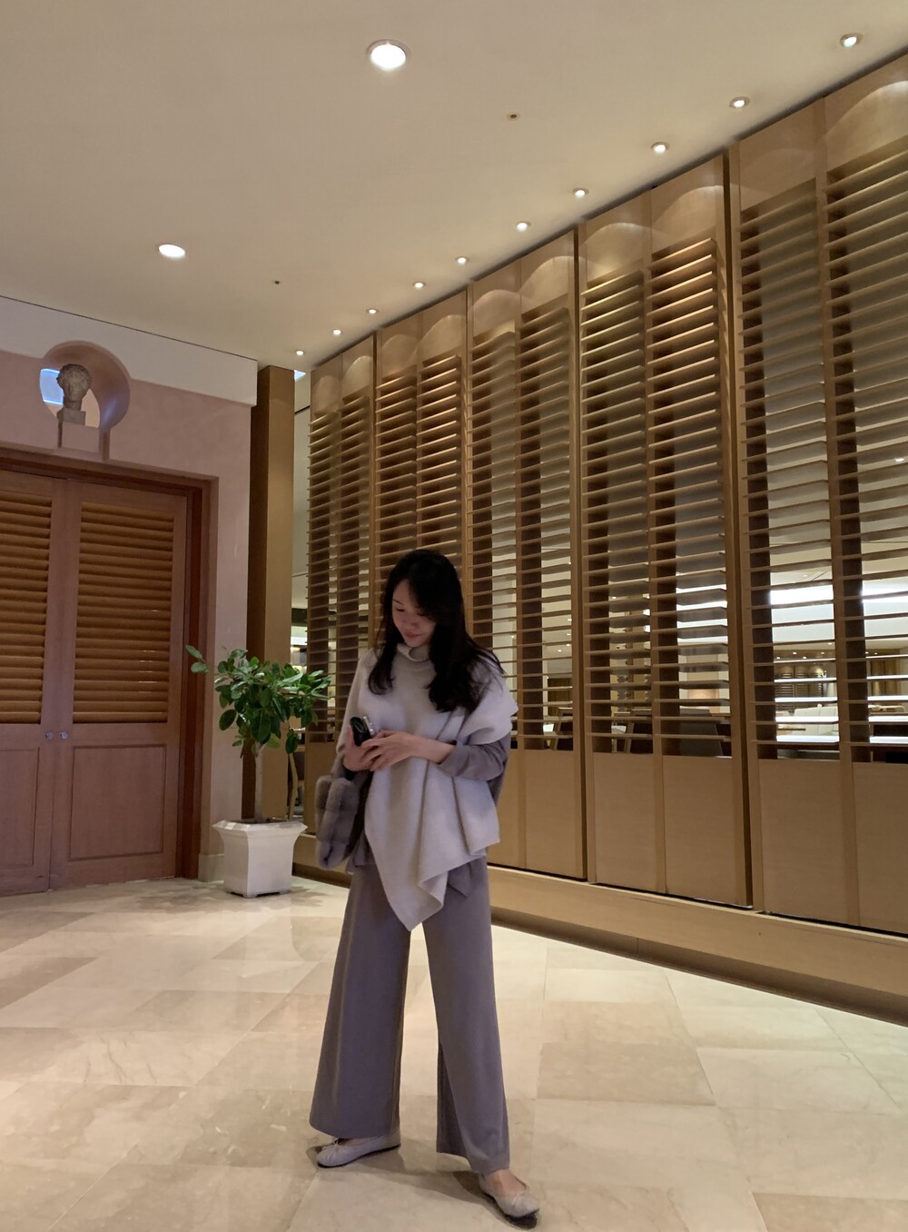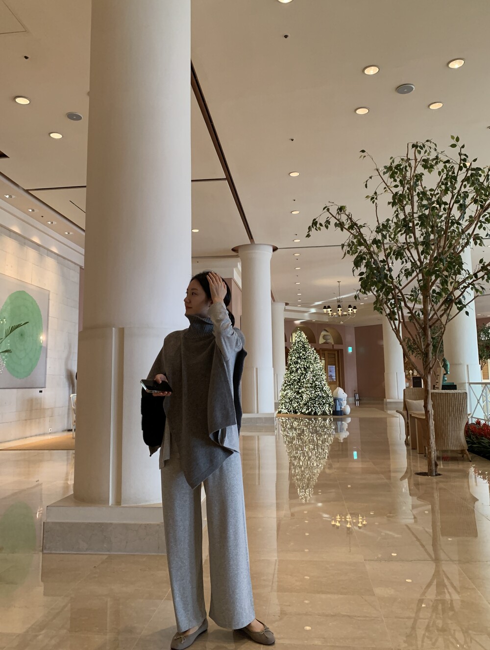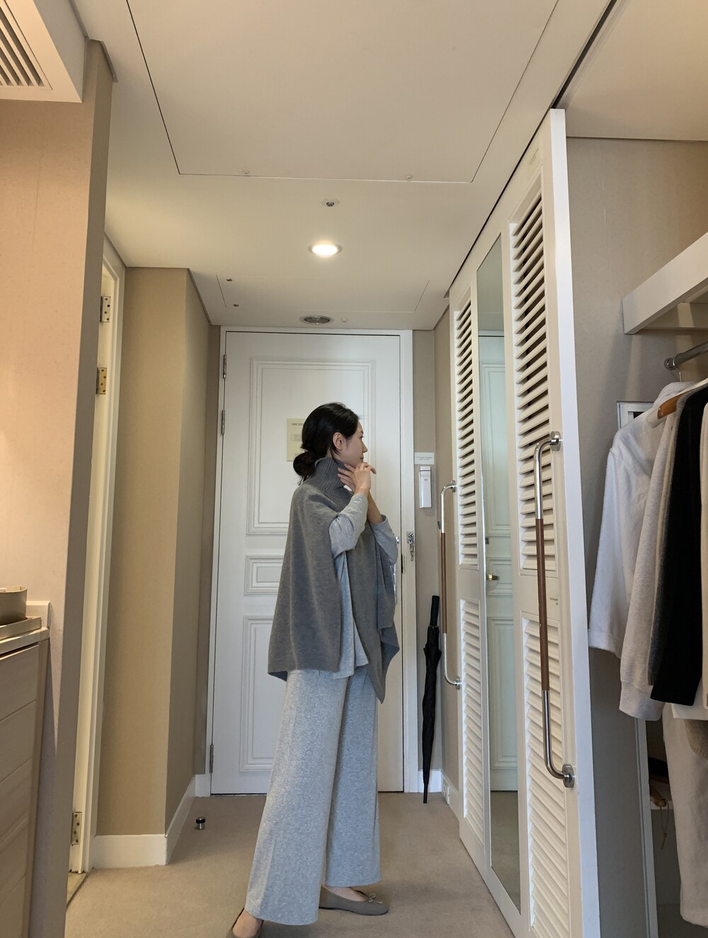 turtleneck poncho shawl (grey) + [made] lounge top&pants set (melange) + winter flat shoes (grey)