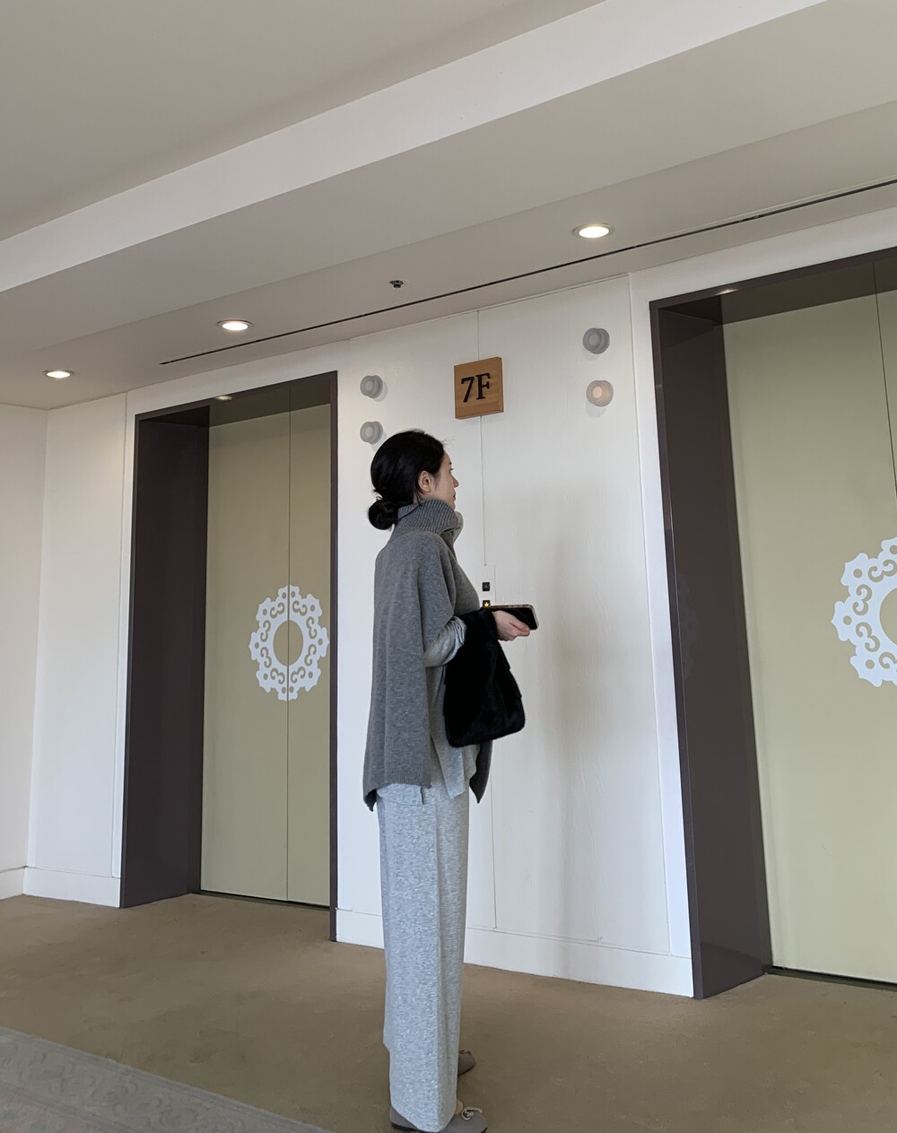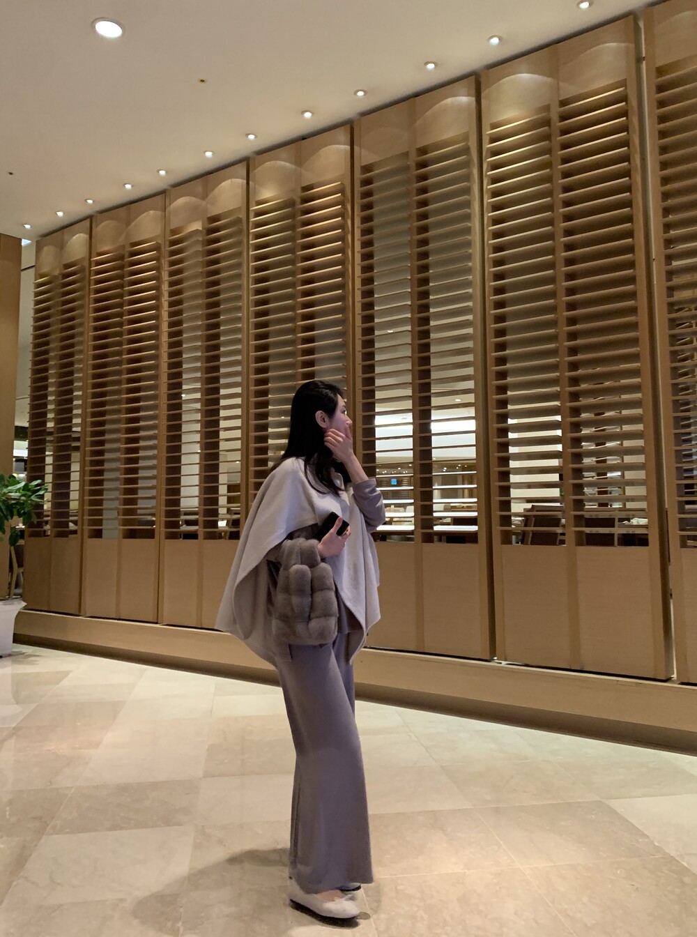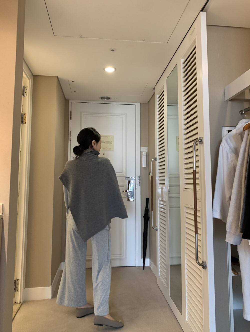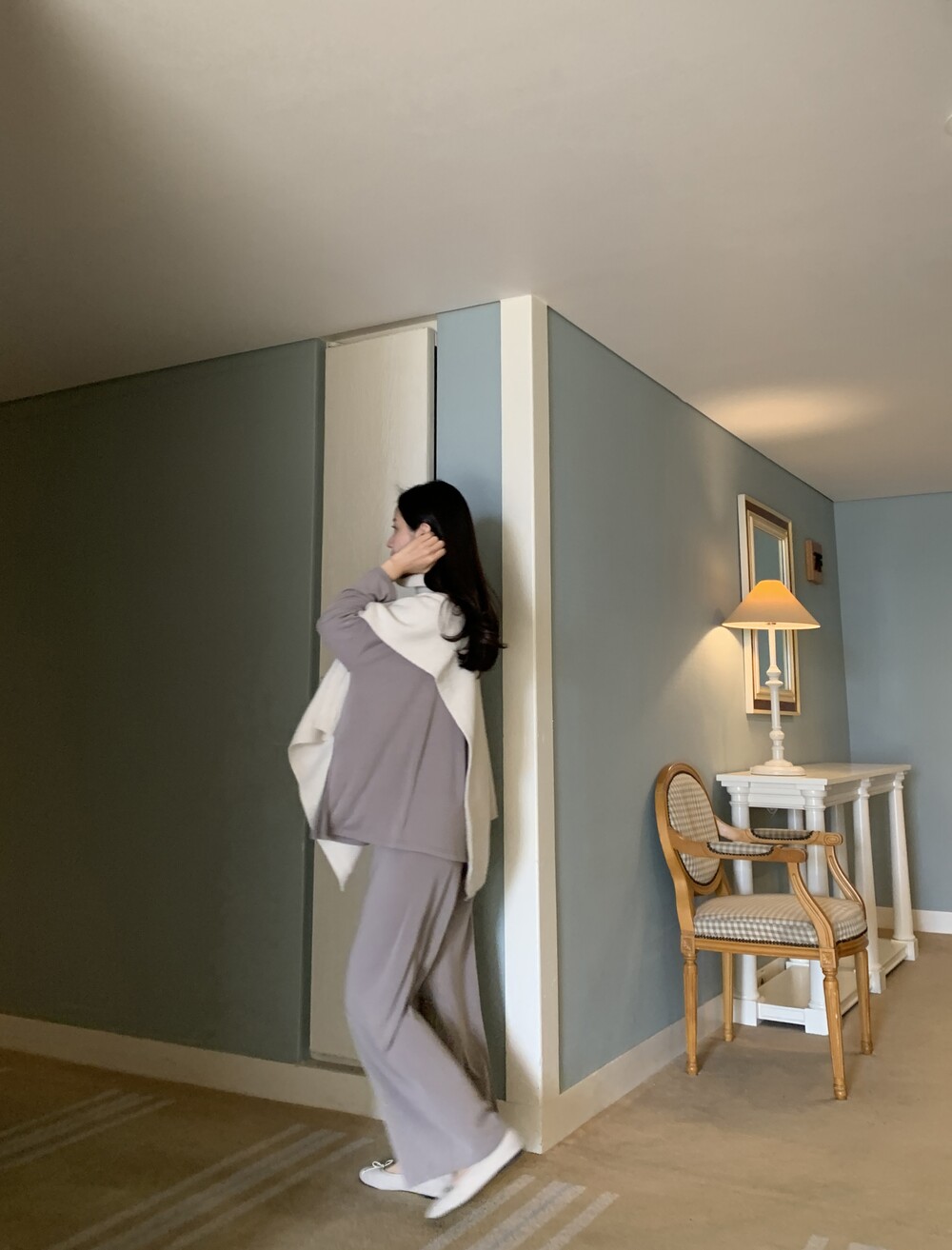 turtleneck poncho shawl (grey) + [made] lounge top&pants set (melange) + winter flat shoes (grey)