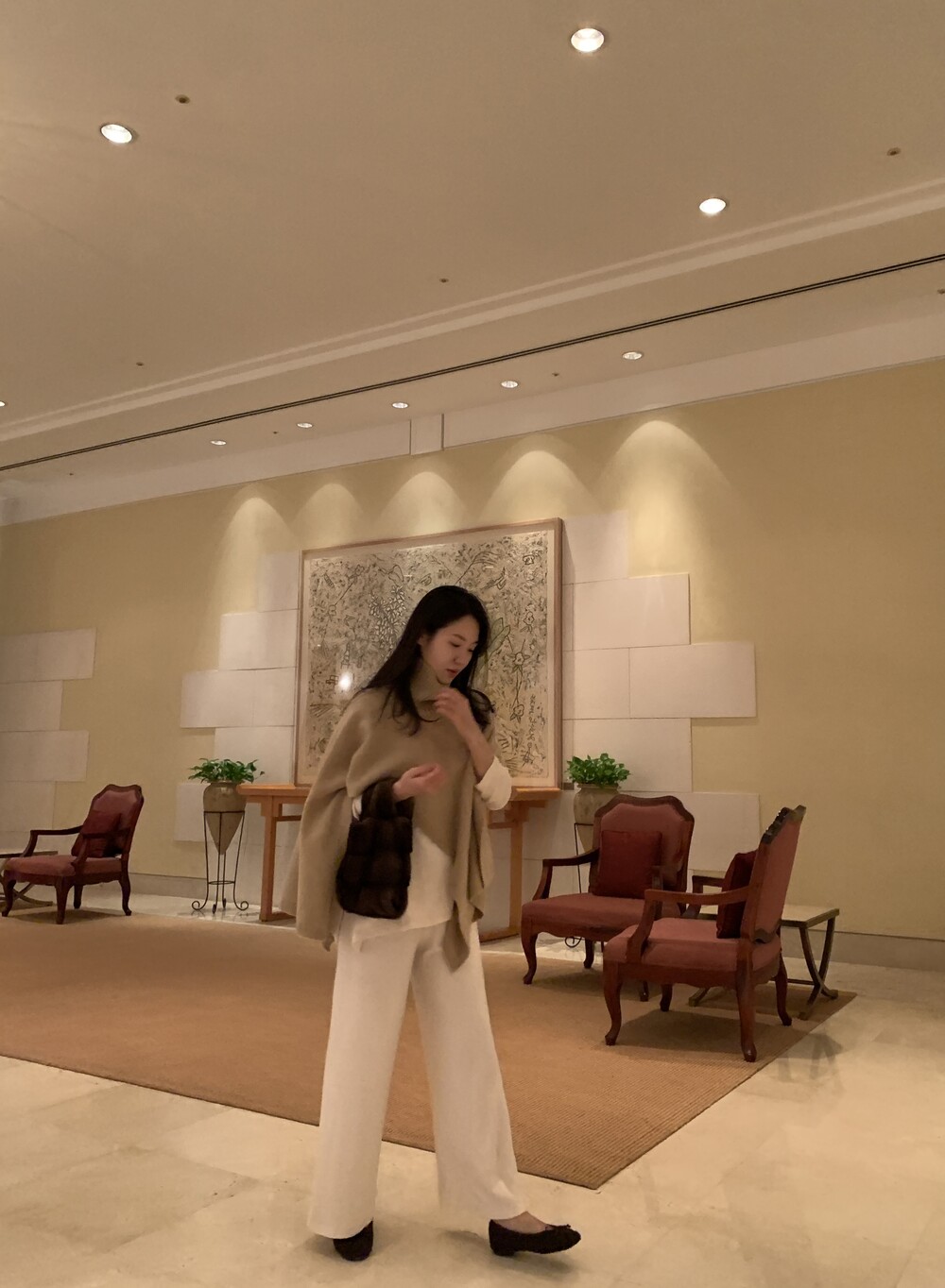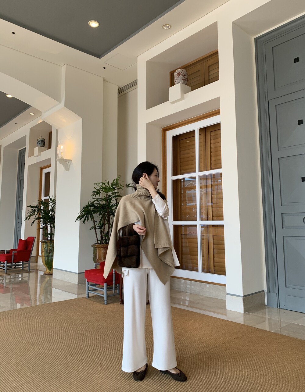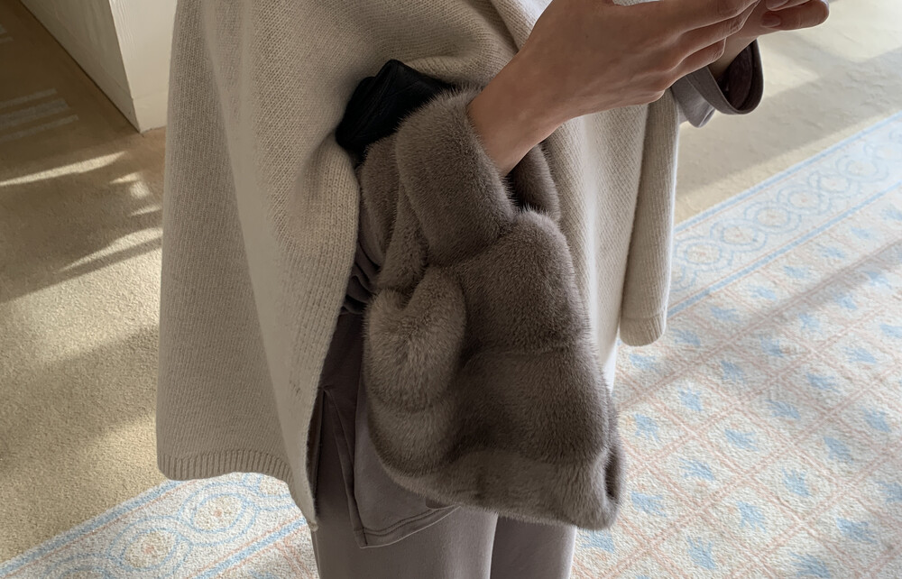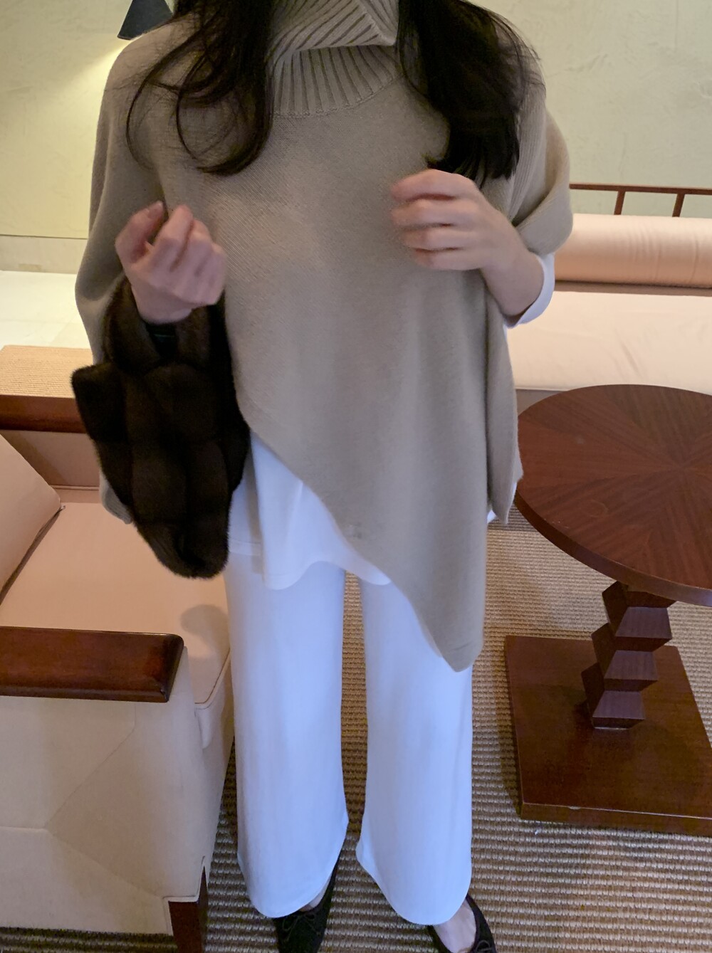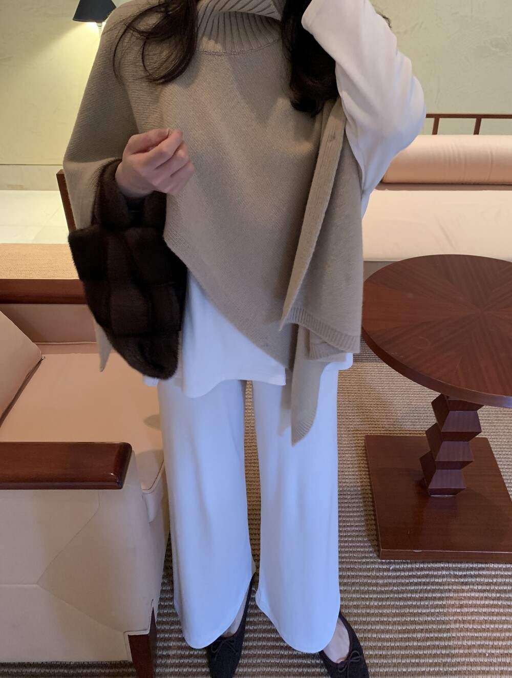 turtleneck poncho shawl (camebeige) + [made] lounge top&pants set (creamivory) + winter flat shoes (brown) + mink petit bag (horizontal/deepbrown)
