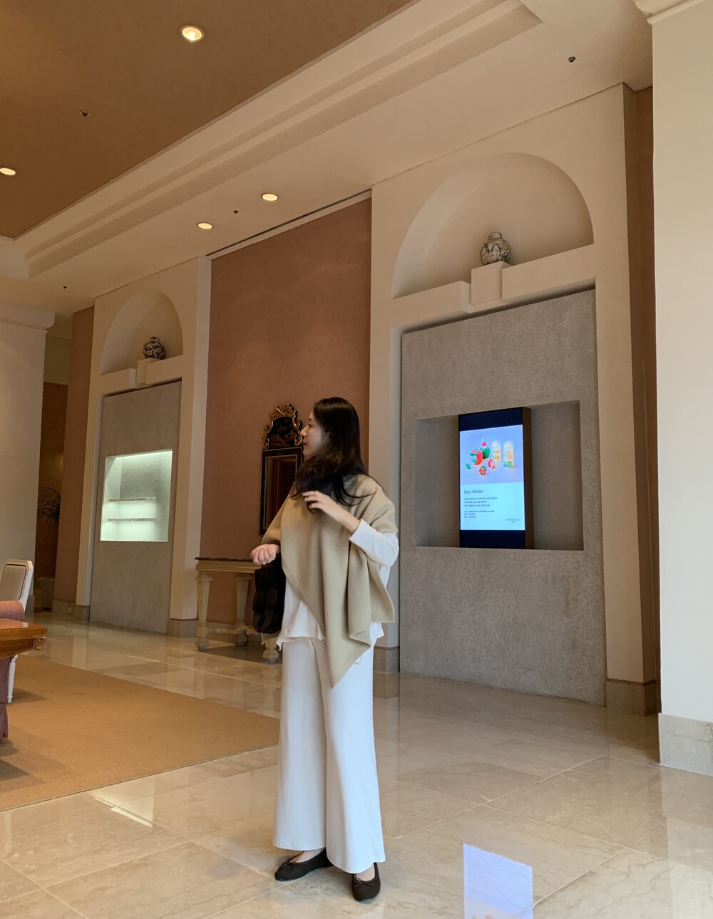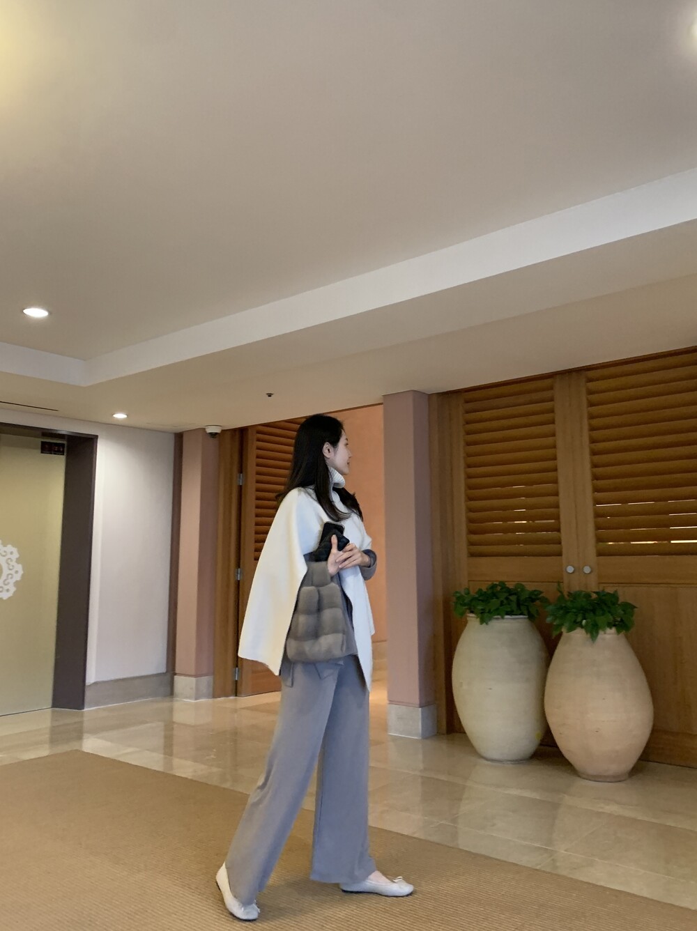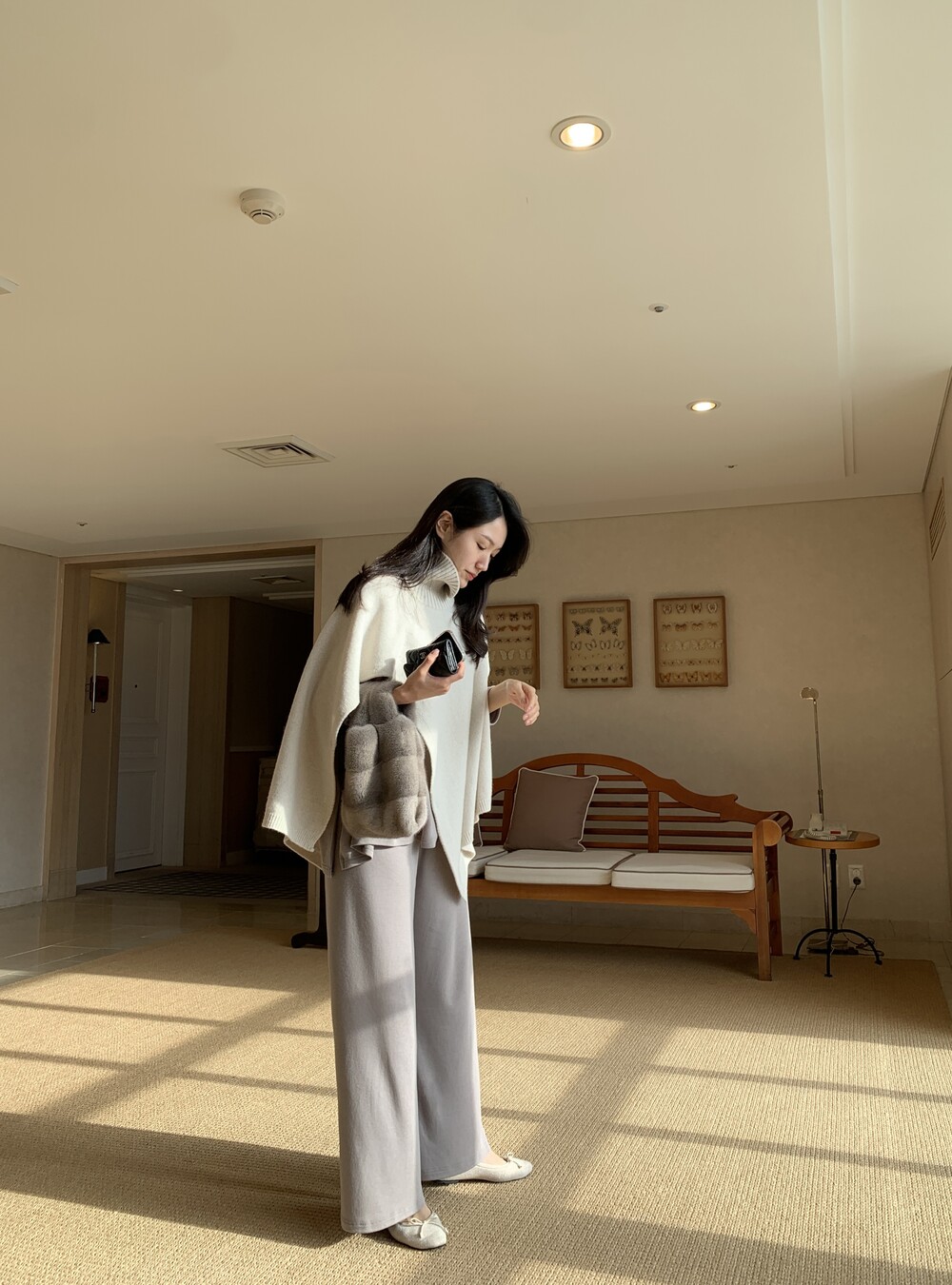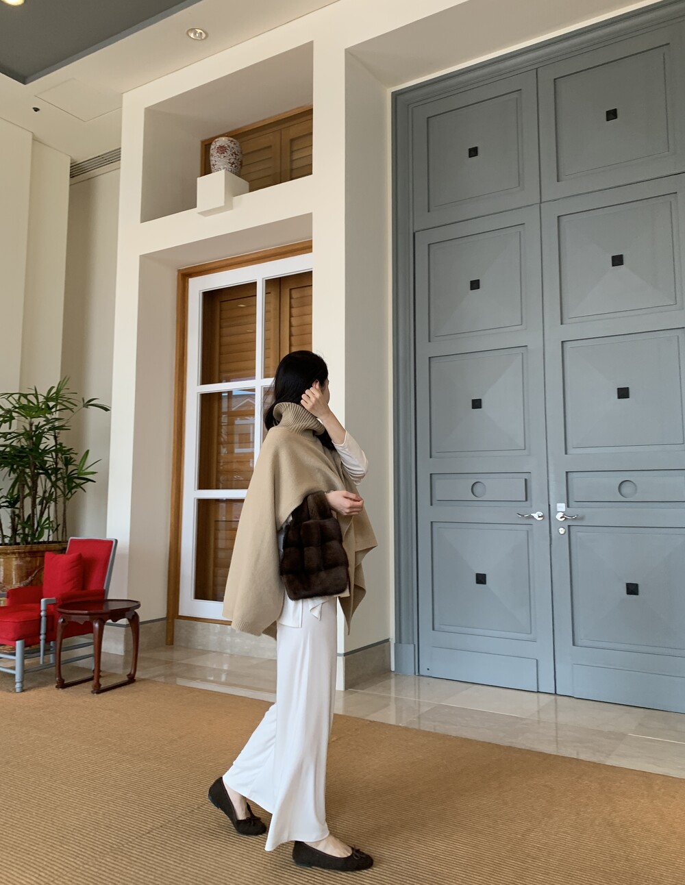 turtleneck poncho shawl (camebeige) + [made] lounge top&pants set (creamivory) + winter flat shoes (brown) + mink petit bag (horizontal/deepbrown)