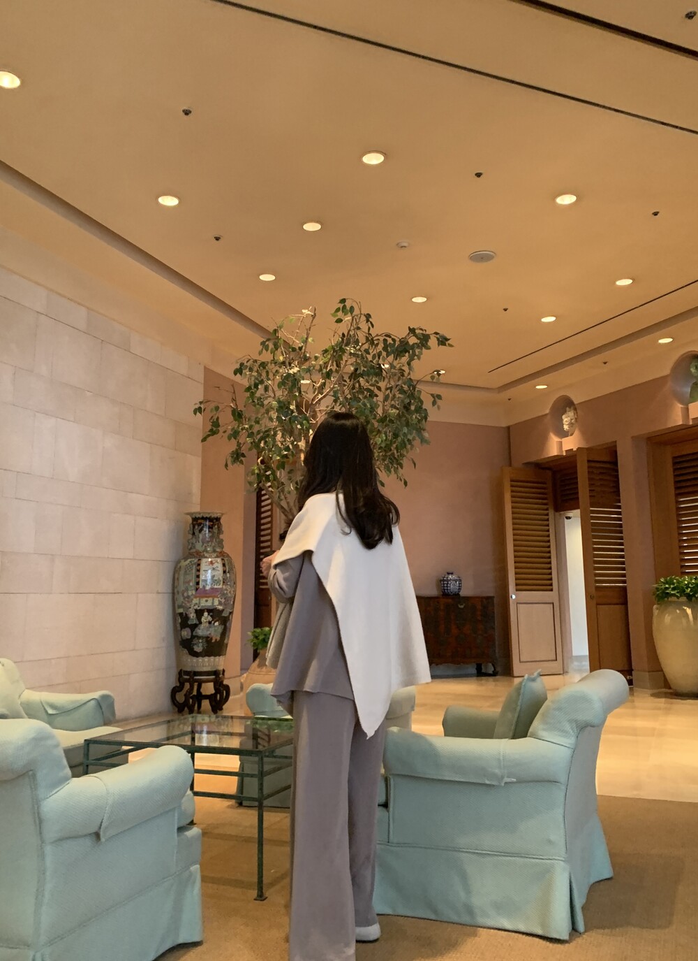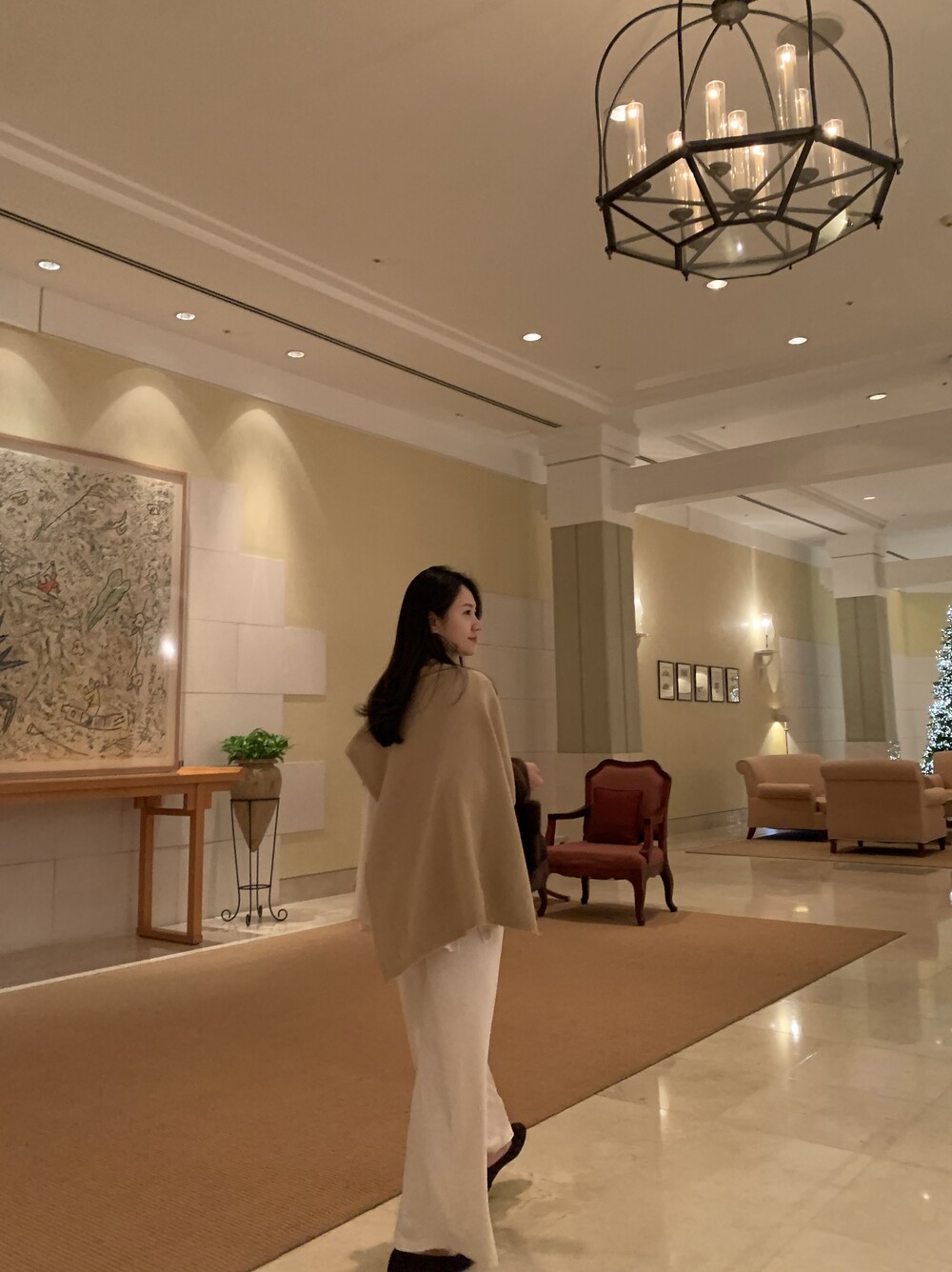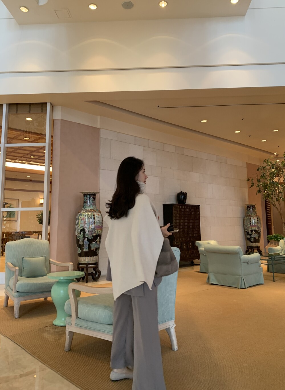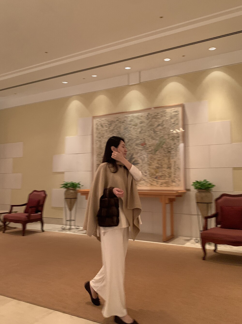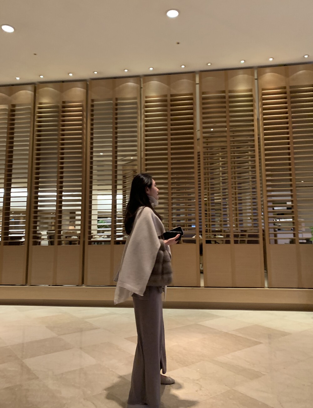 turtleneck poncho shawl (camebeige) + [made] lounge top&pants set (creamivory) + winter flat shoes (brown) + mink petit bag (horizontal/deepbrown)