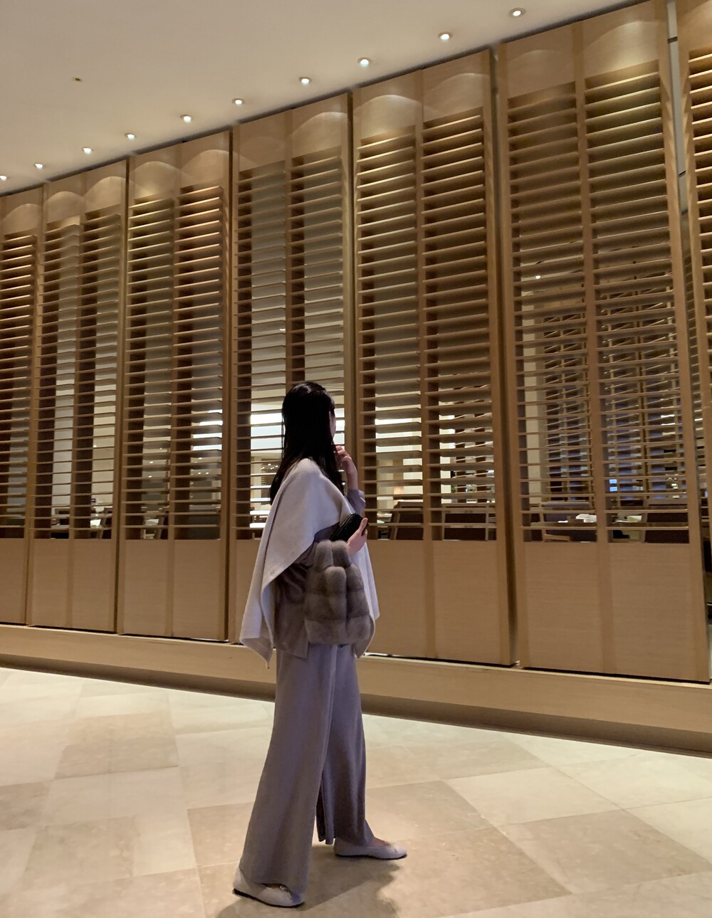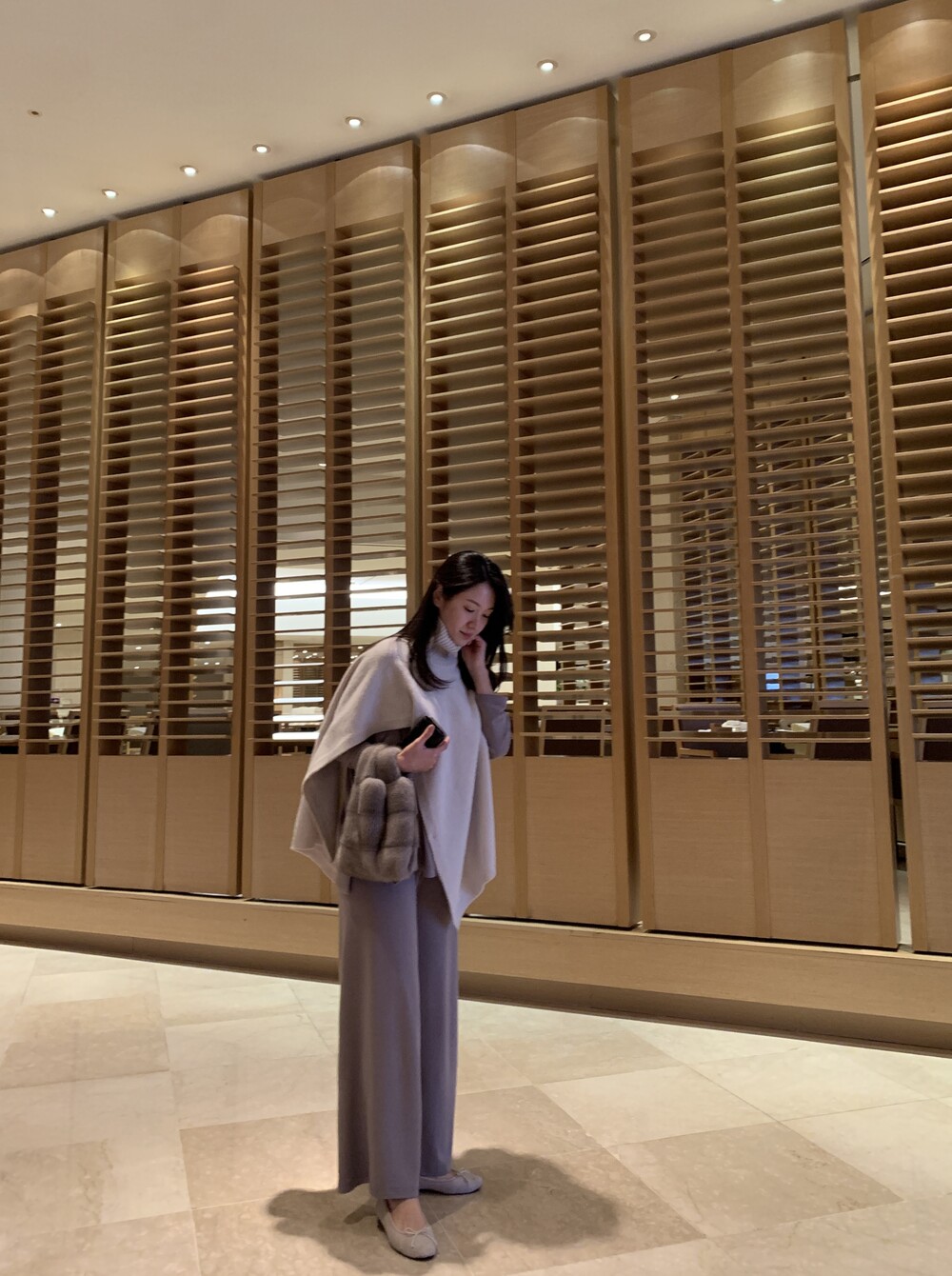 turtleneck poncho shawl(oatmeal) + [made] lounge top&pants set (etoff) + winter flat shoes (oatmeal) + mink petit bag (horizontal/silverblue)