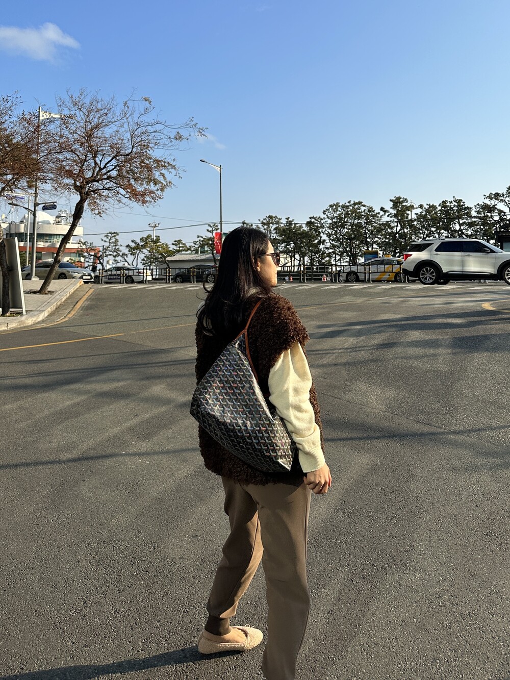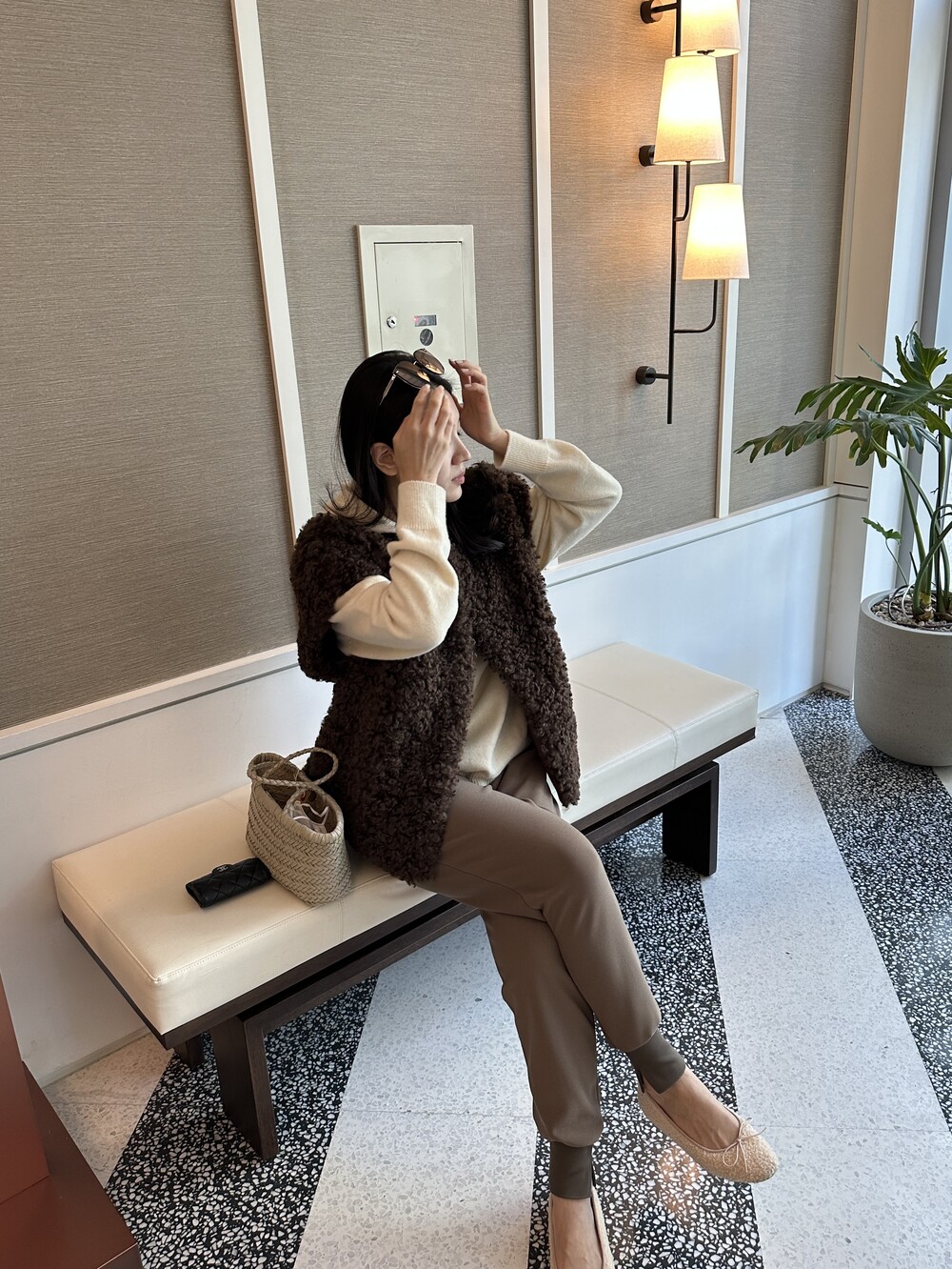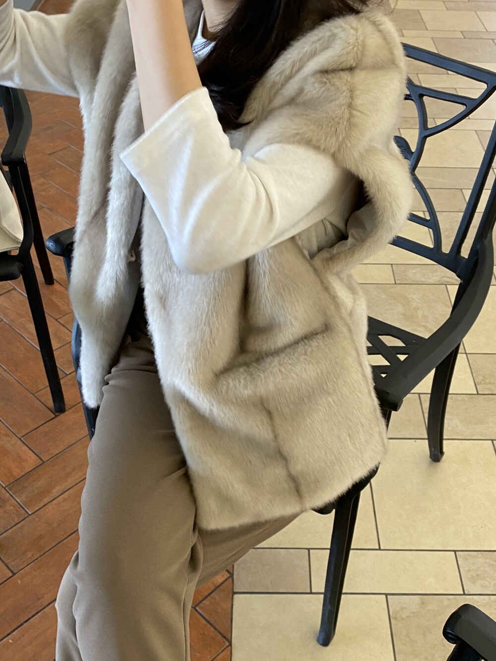 mink fur vest + warm basic t (white) + warm easy pants (brown)