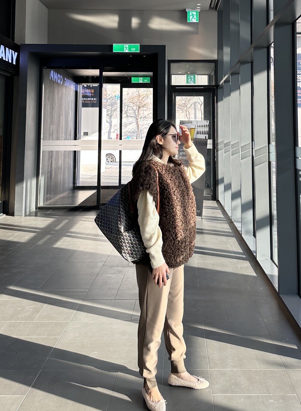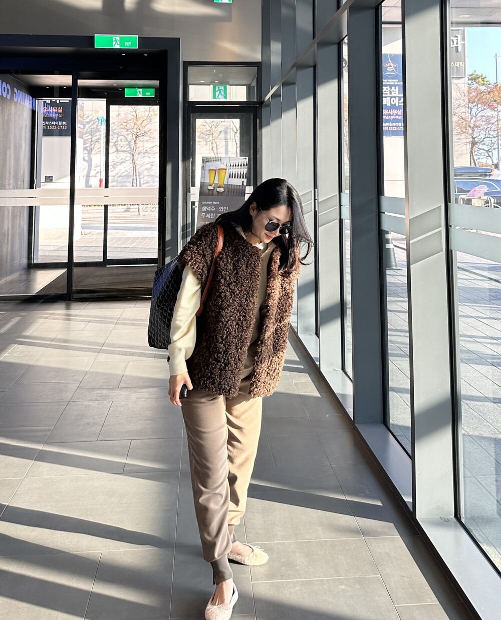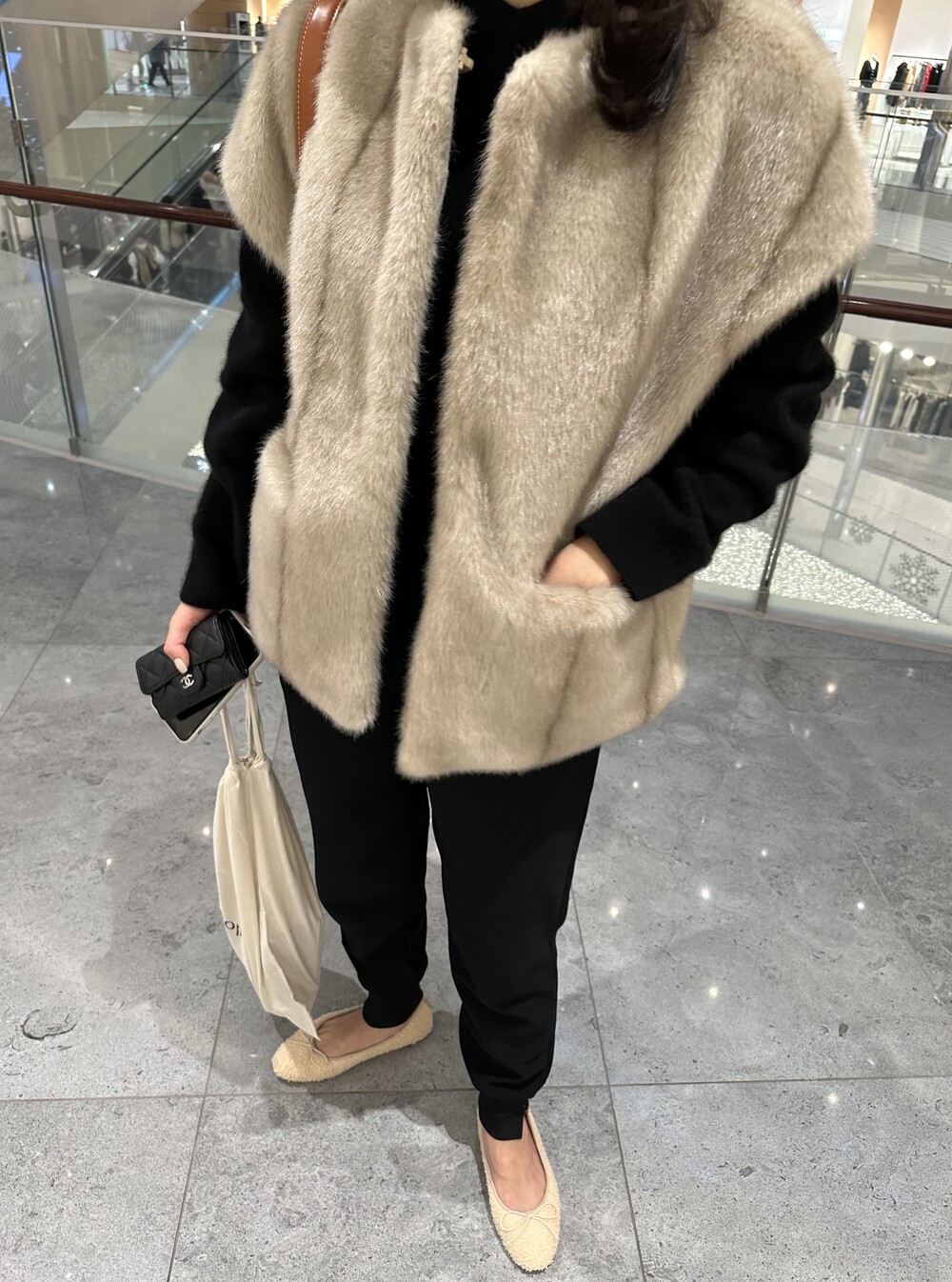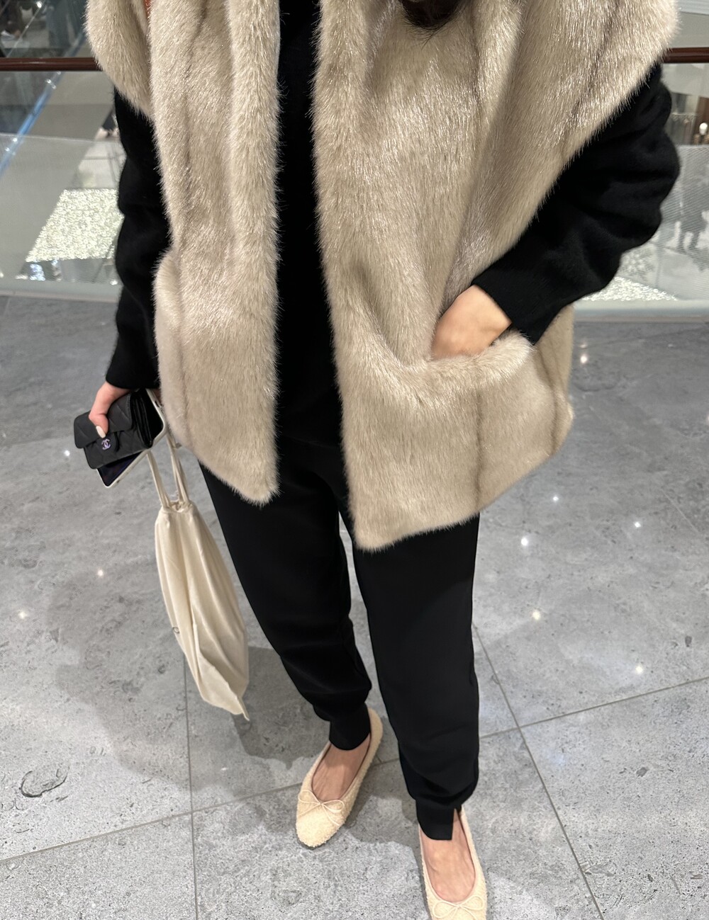 mink fur vest + raccoon hood knit (black) + warm easy pants (black) + teddy flat shoes