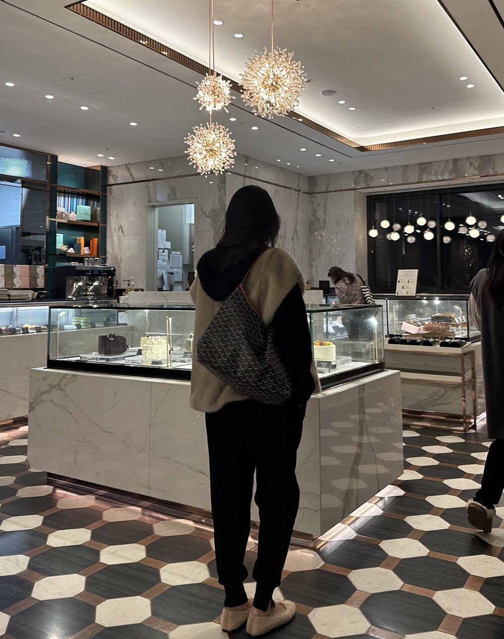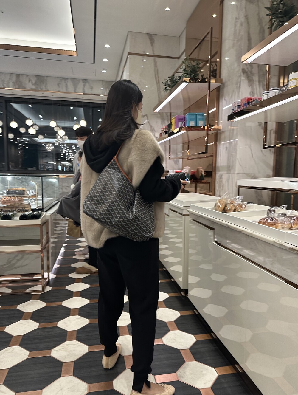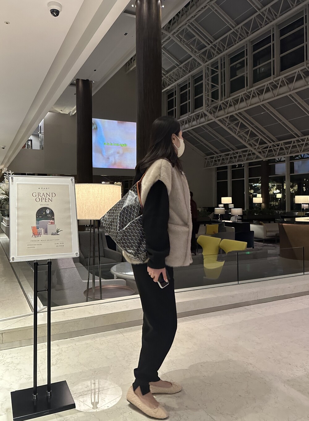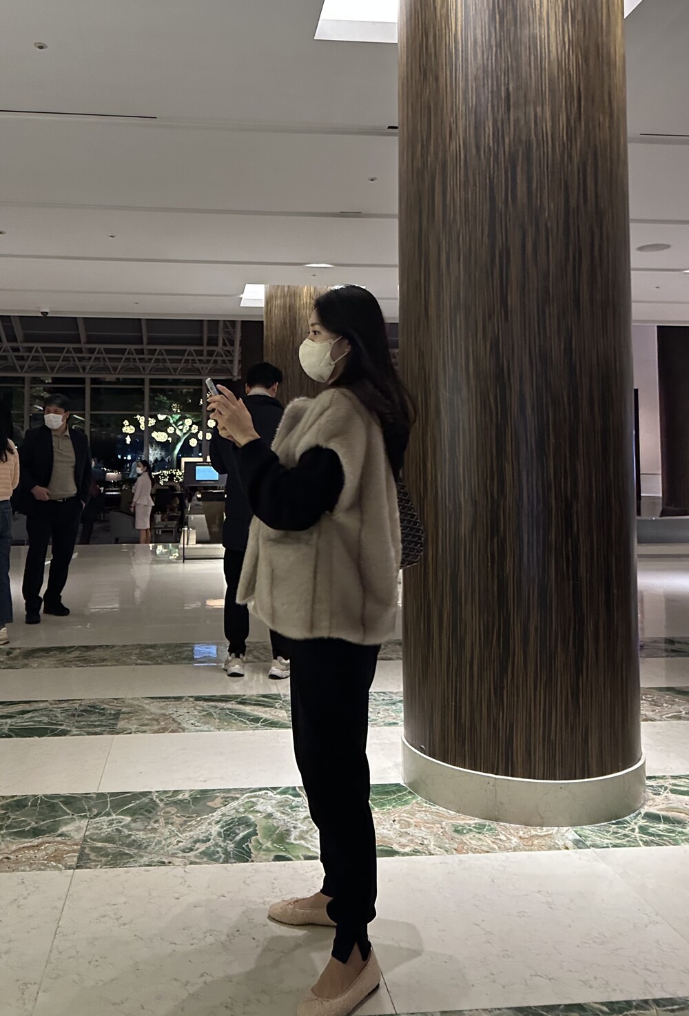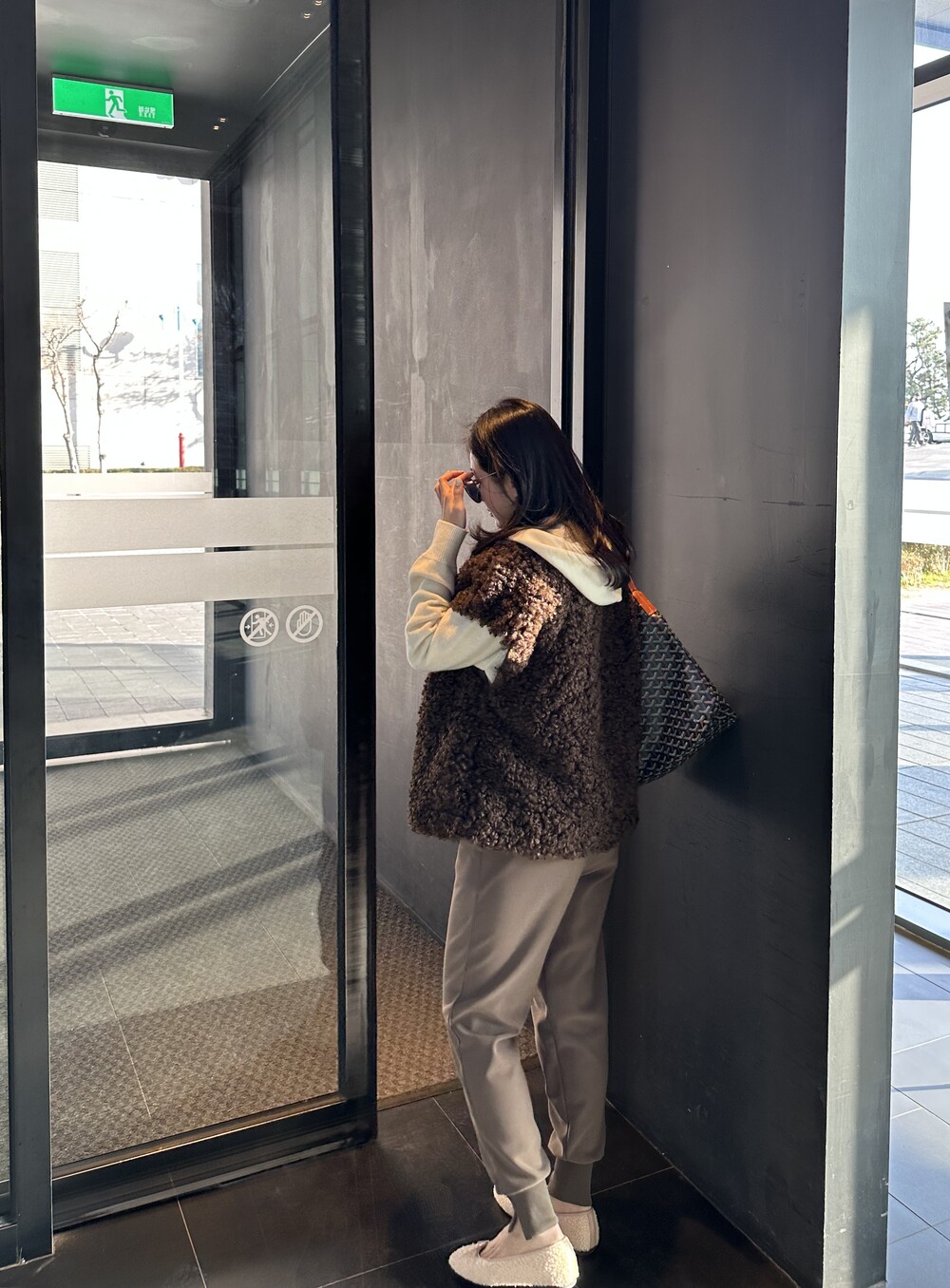 mink fur vest + raccoon hood knit (black) + warm easy pants (black) + teddy flat shoes