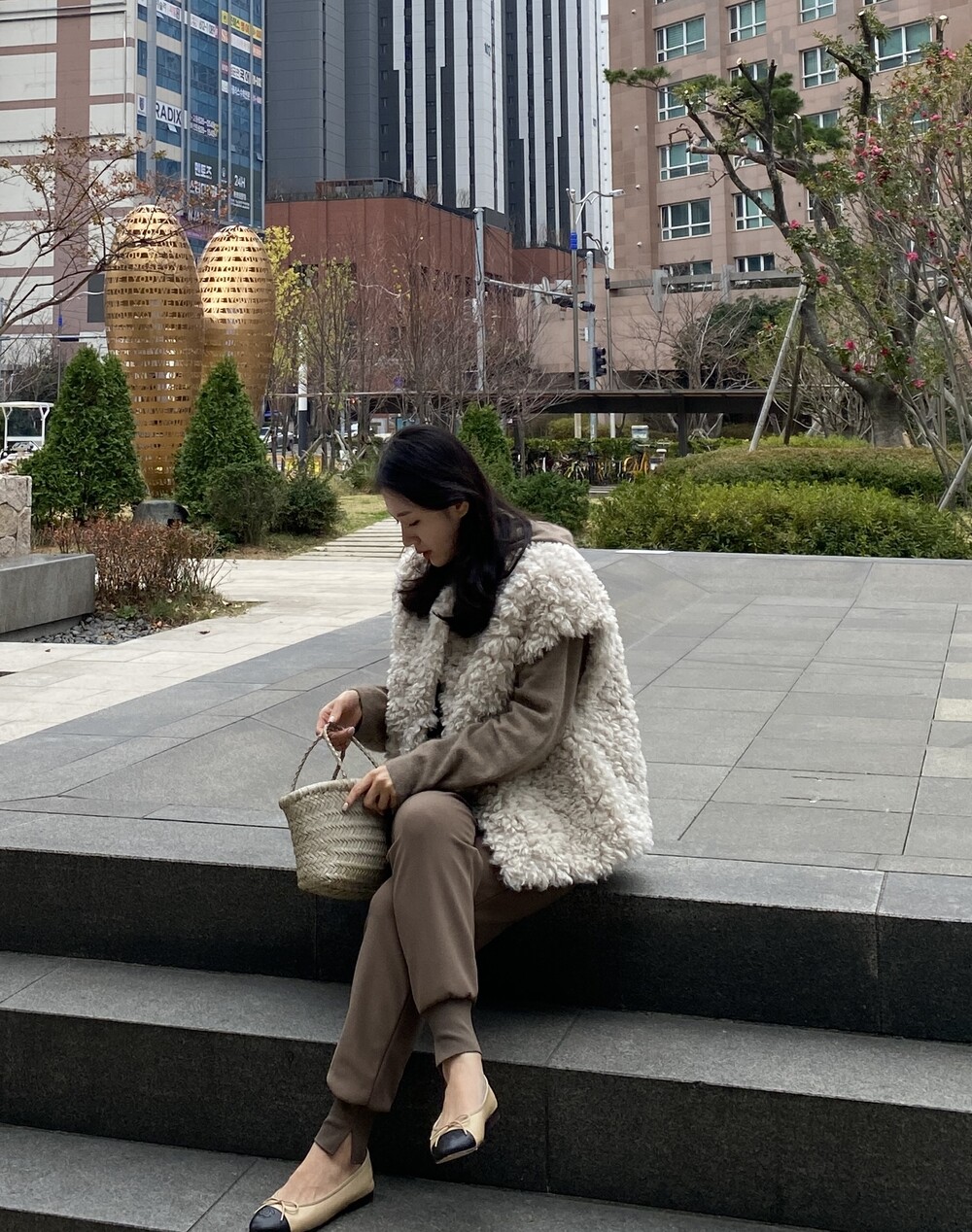 teddy boucle vest (cocoa) + merinowool hood knit (vanilla) + warm easy pants (brown) + teddy flat shoes