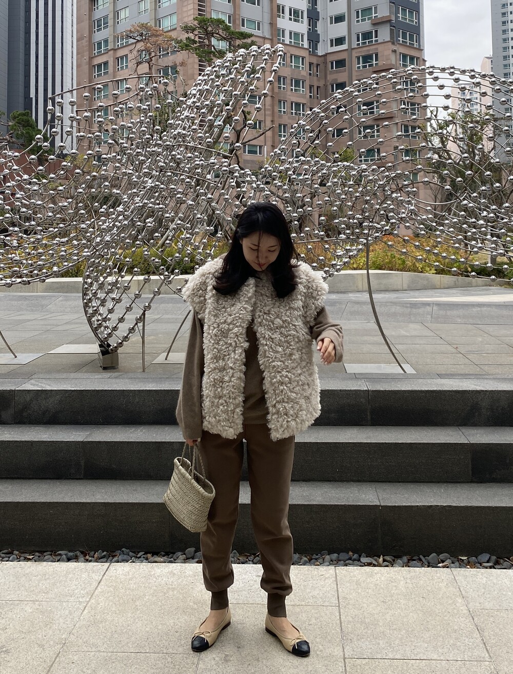 teddy boucle vest (creambeige) + raccoon hood knit (brown) + warm easy pants (brown)