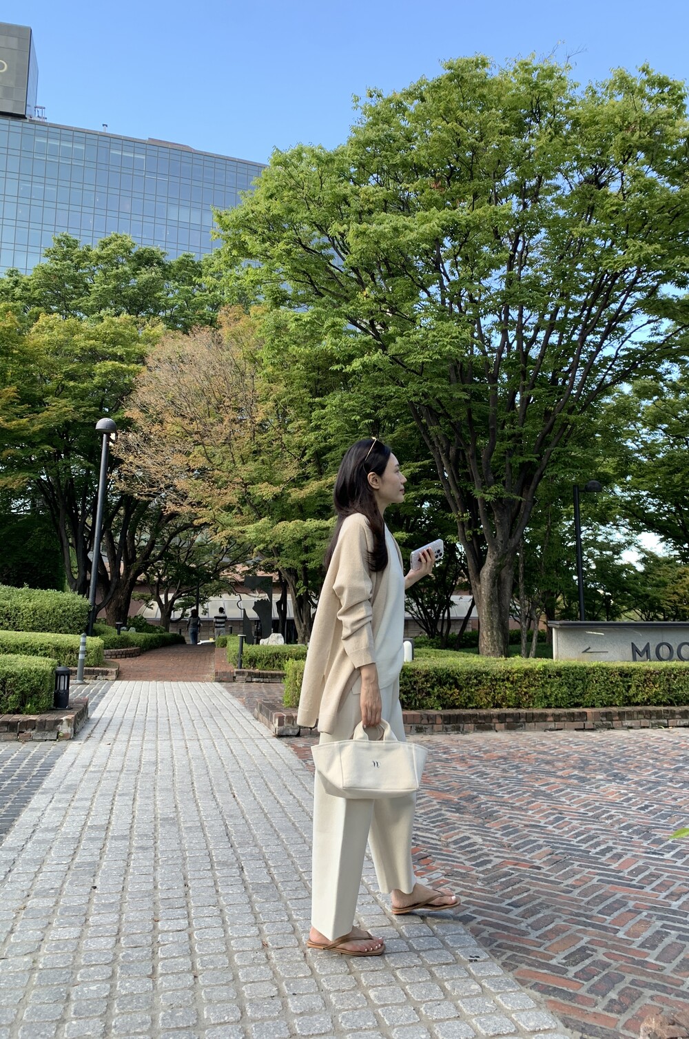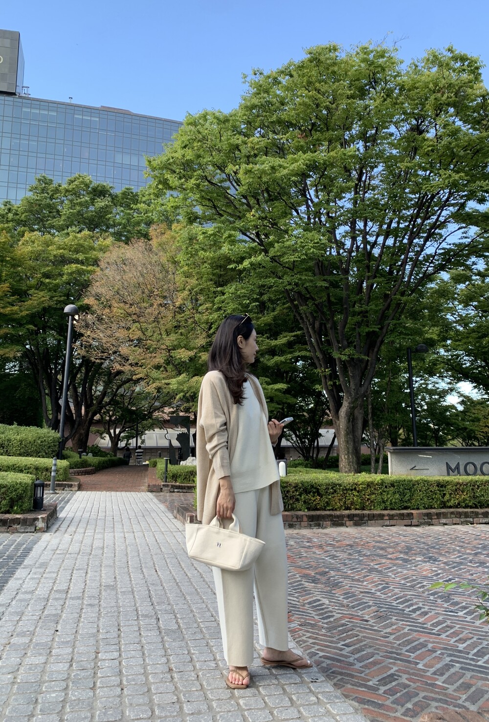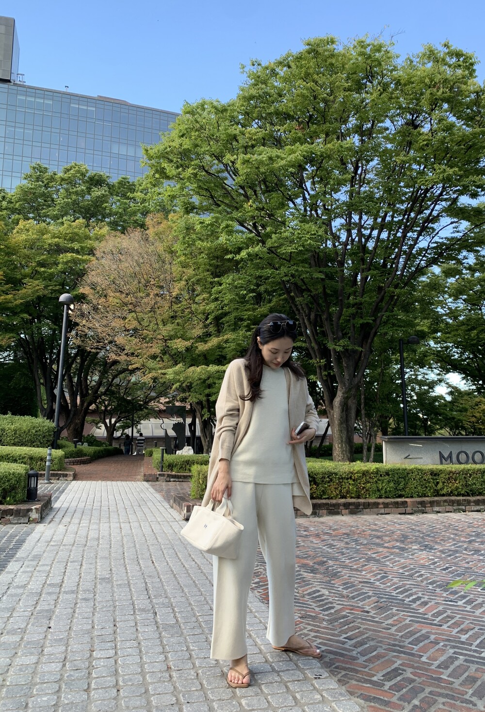 autumn belt cardigan (beige) + wholegarment loose knit (ivory). + [f/w] must knit pants (ivory)